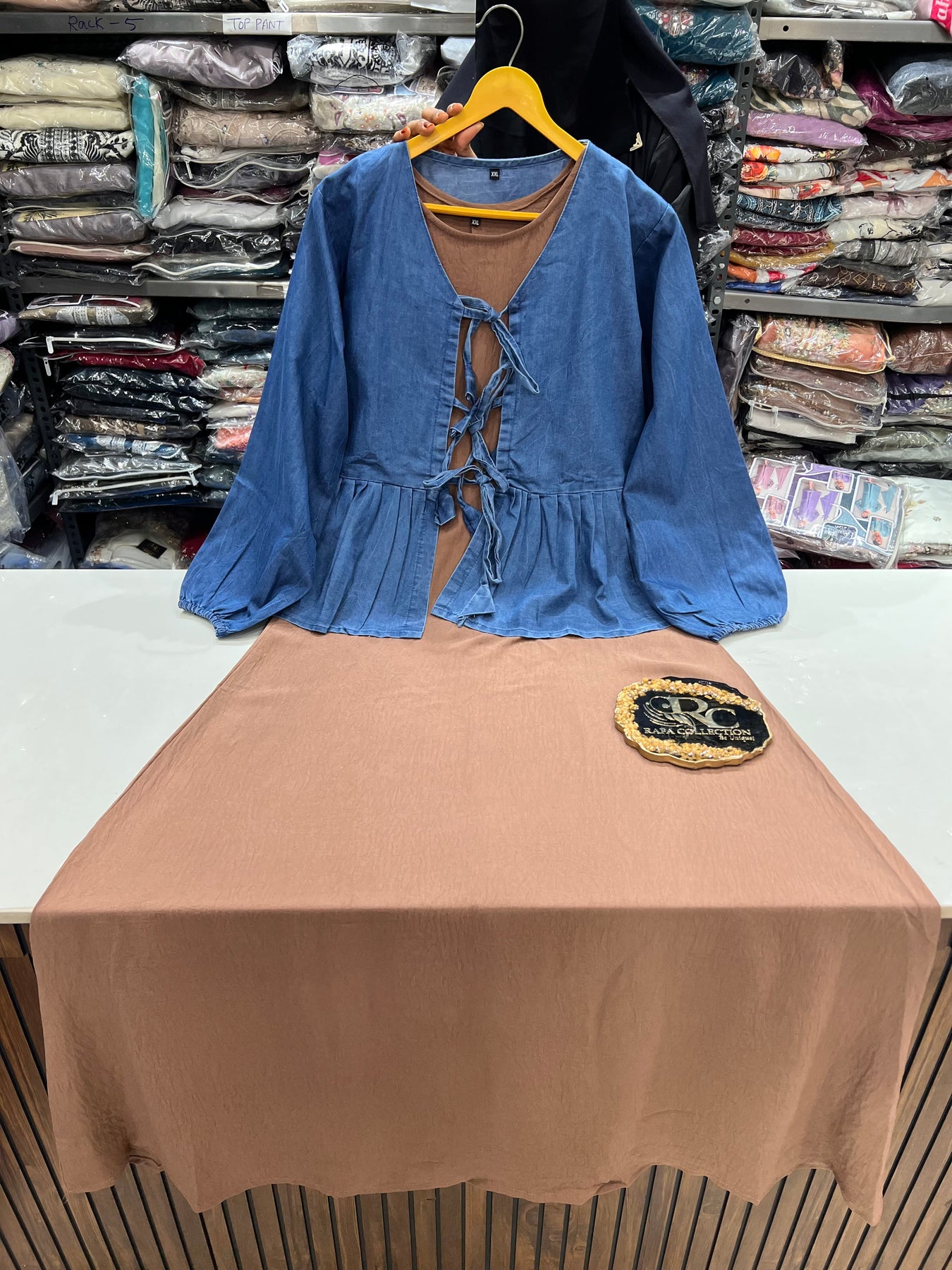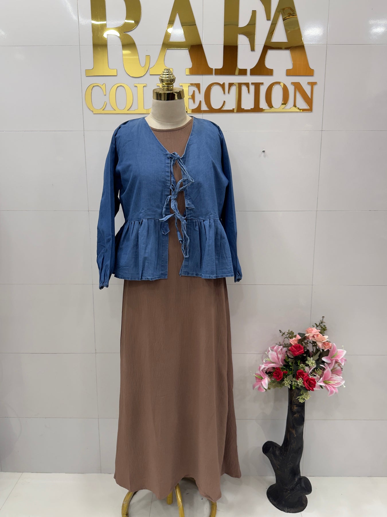 Top:-imported crinkle long dress with  separate denim jacket