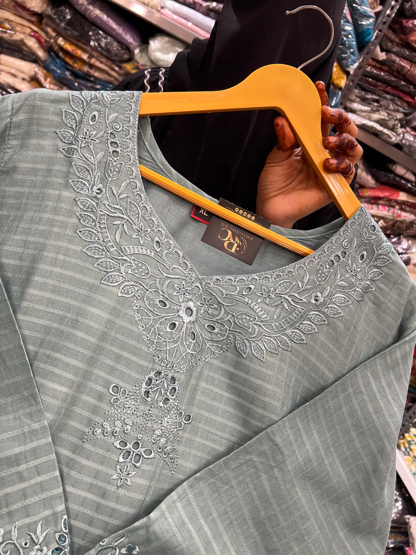 D no :-2653 Expertly crafted with airy cotton, this co-ord set features intricate embroidery and cutwork details on the bell sleeves. Elevate your summer style with this lightweight and stylish ensemble. Perfect for any occasion, this set offers a comfortable fit and chic design.