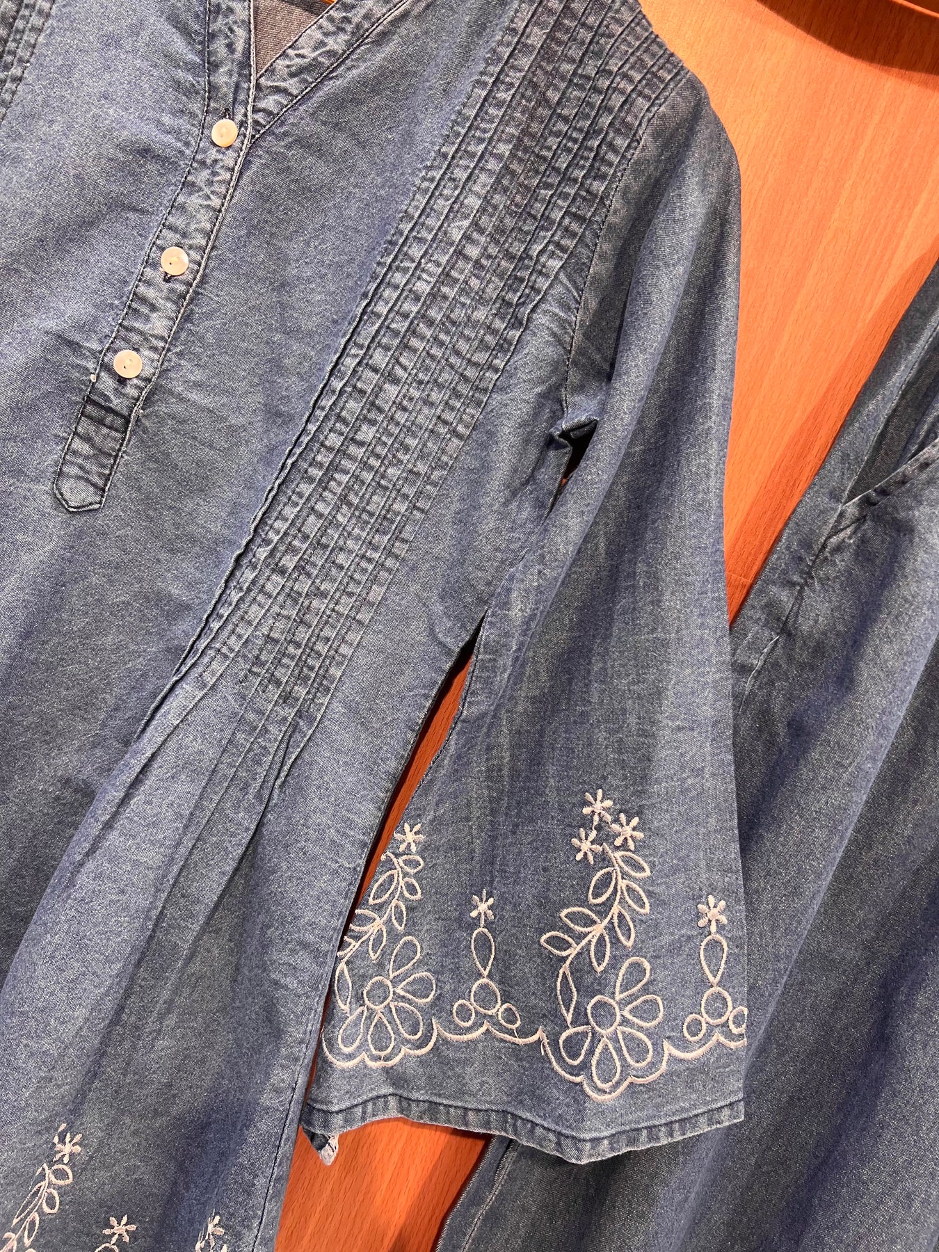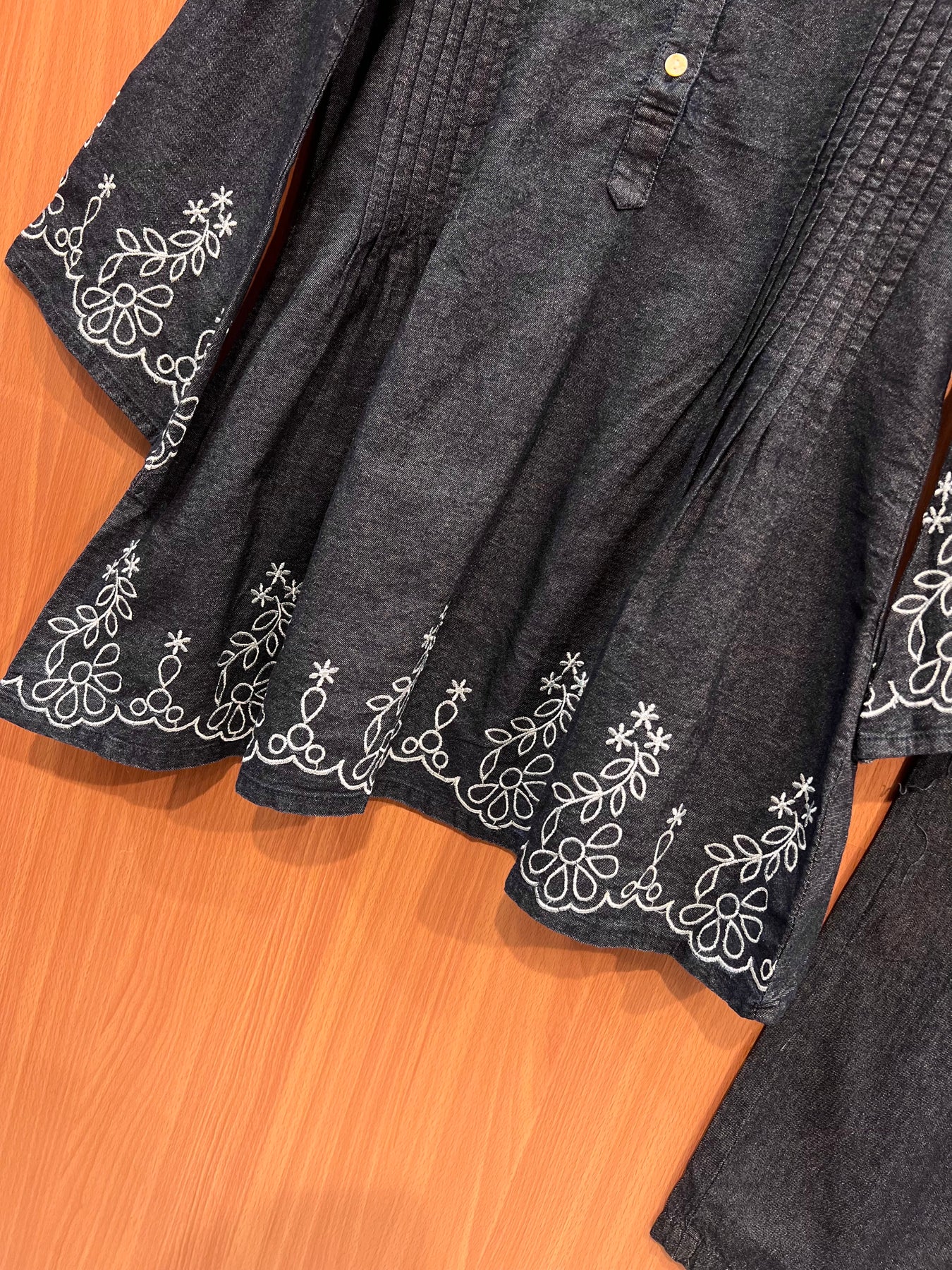 D no :- 2564 This Denim co-ord set  features a denim top with beautiful embroidery work. Made from high-quality denim, it is both stylish and durable. Perfect for any occasion, this set elevates your style and adds a touch of elegance to your wardrobe. Upgrade your outfit game with this trendy co-ord set.