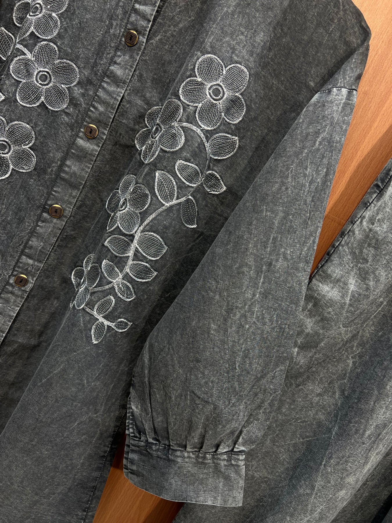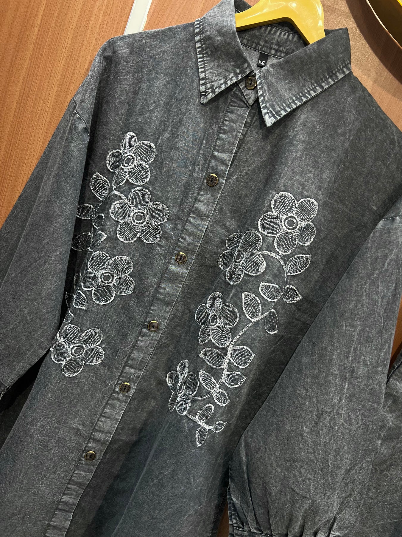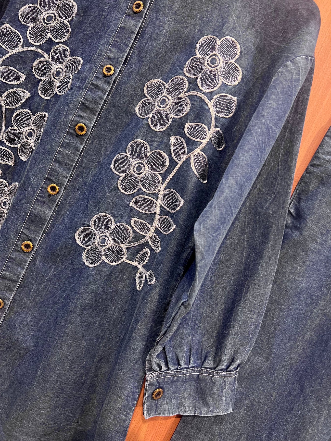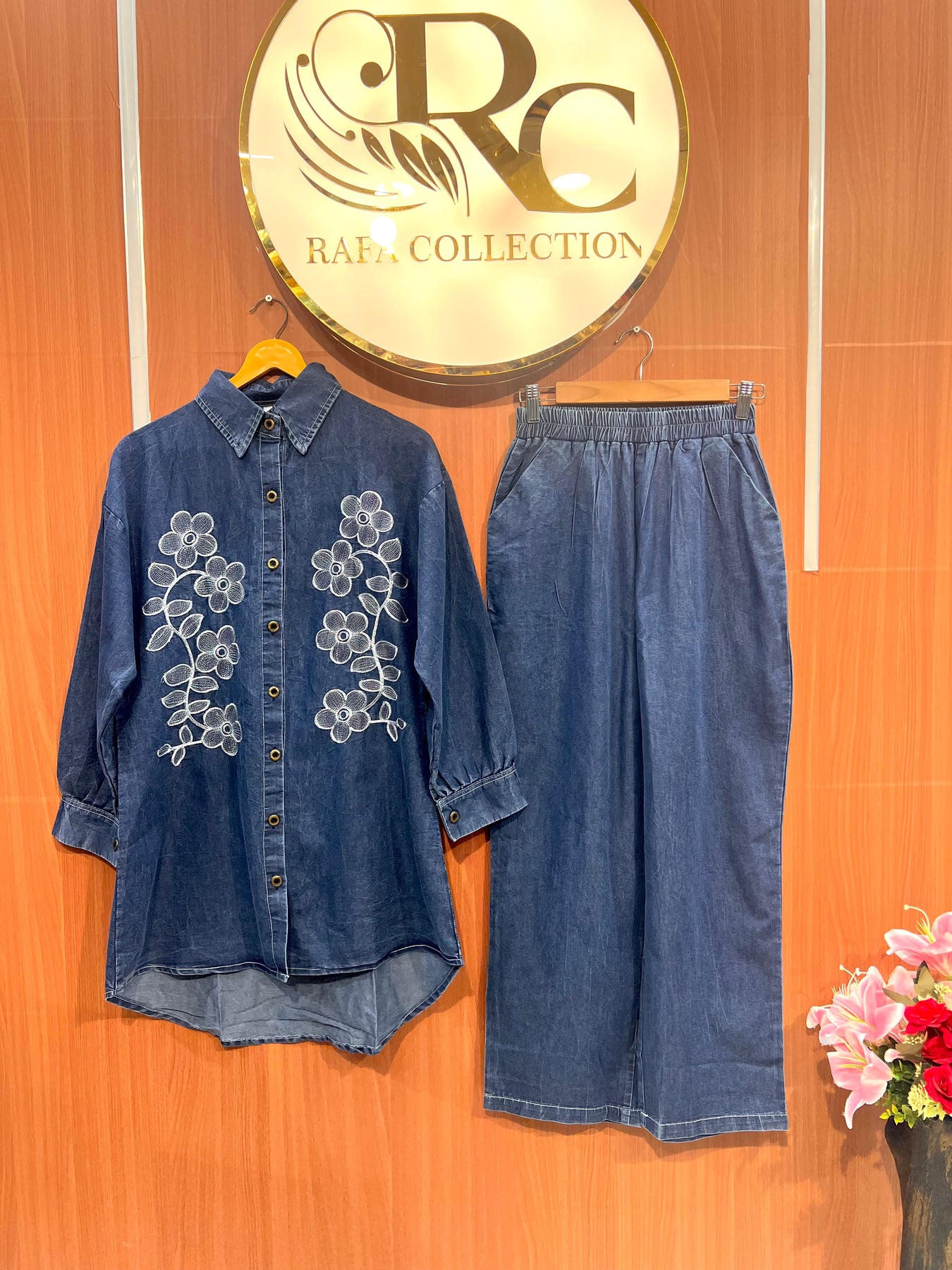 D no :- 674 Crafted from high-quality denim, our Denim co-ord sets feature a stylish up & down top adorned with intricate embroidery work. Elevate your wardrobe with this versatile and trendy set, perfect for any occasion. Experience the comfort and style of our denim co-ord sets today.
