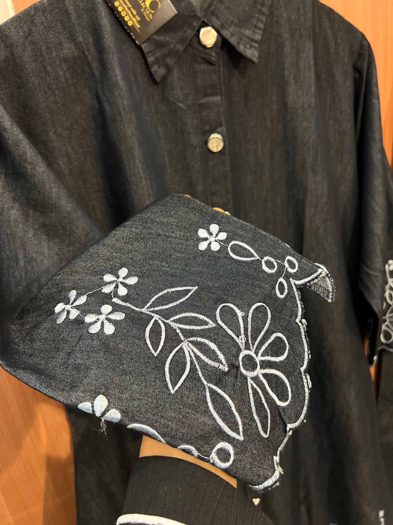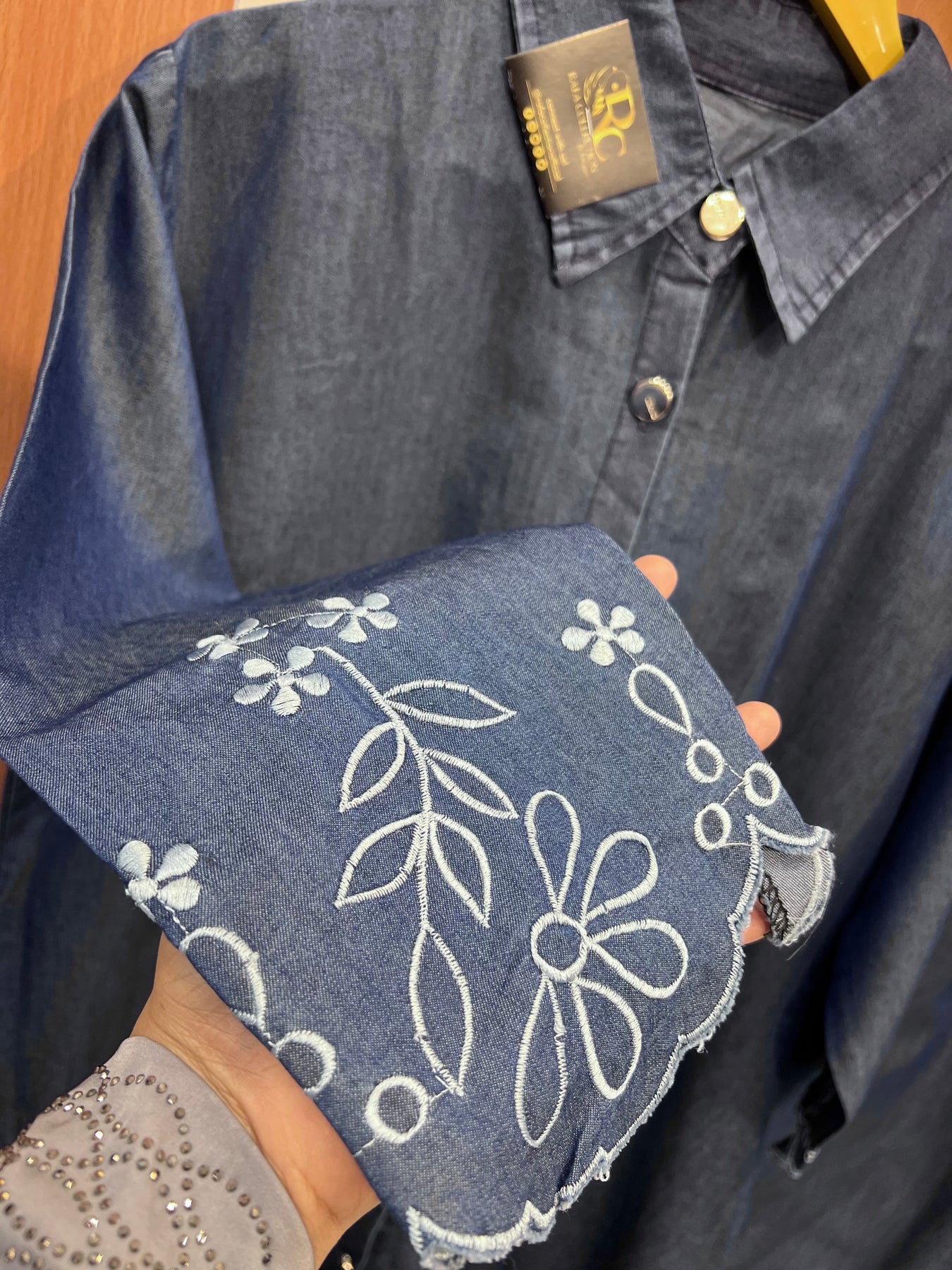 D.no:- 2742. This Denim Embroidery Co-Ord Set features a stylish Kurti with intricate embroidery work. Made of high-quality denim, this set is perfect for both casual and formal occasions. Its unique design will enhance your style while providing comfort and durability. Upgrade your wardrobe with this must-have set!