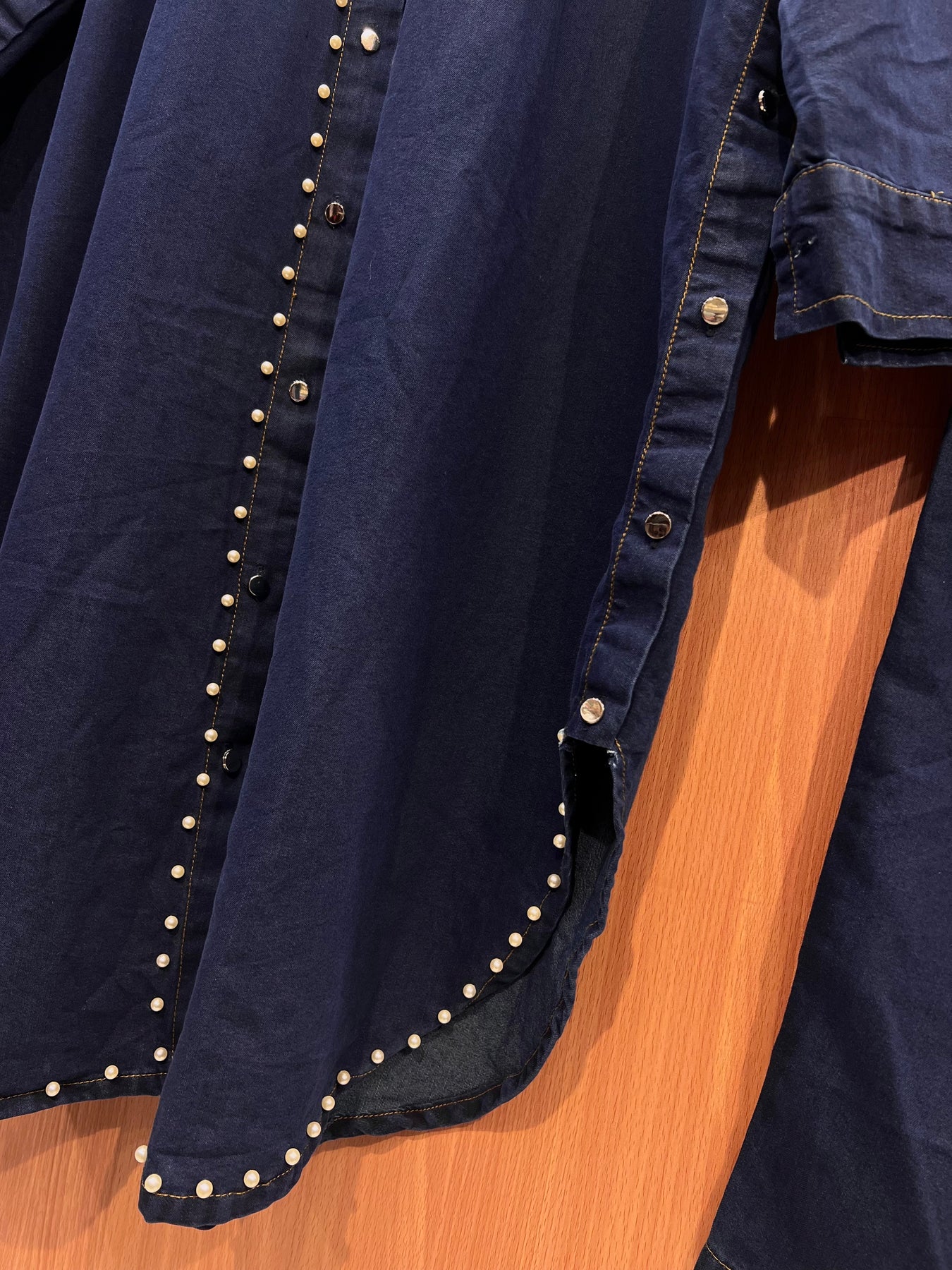 Top :- denim top in pearl handwork work and side buttons for unique look