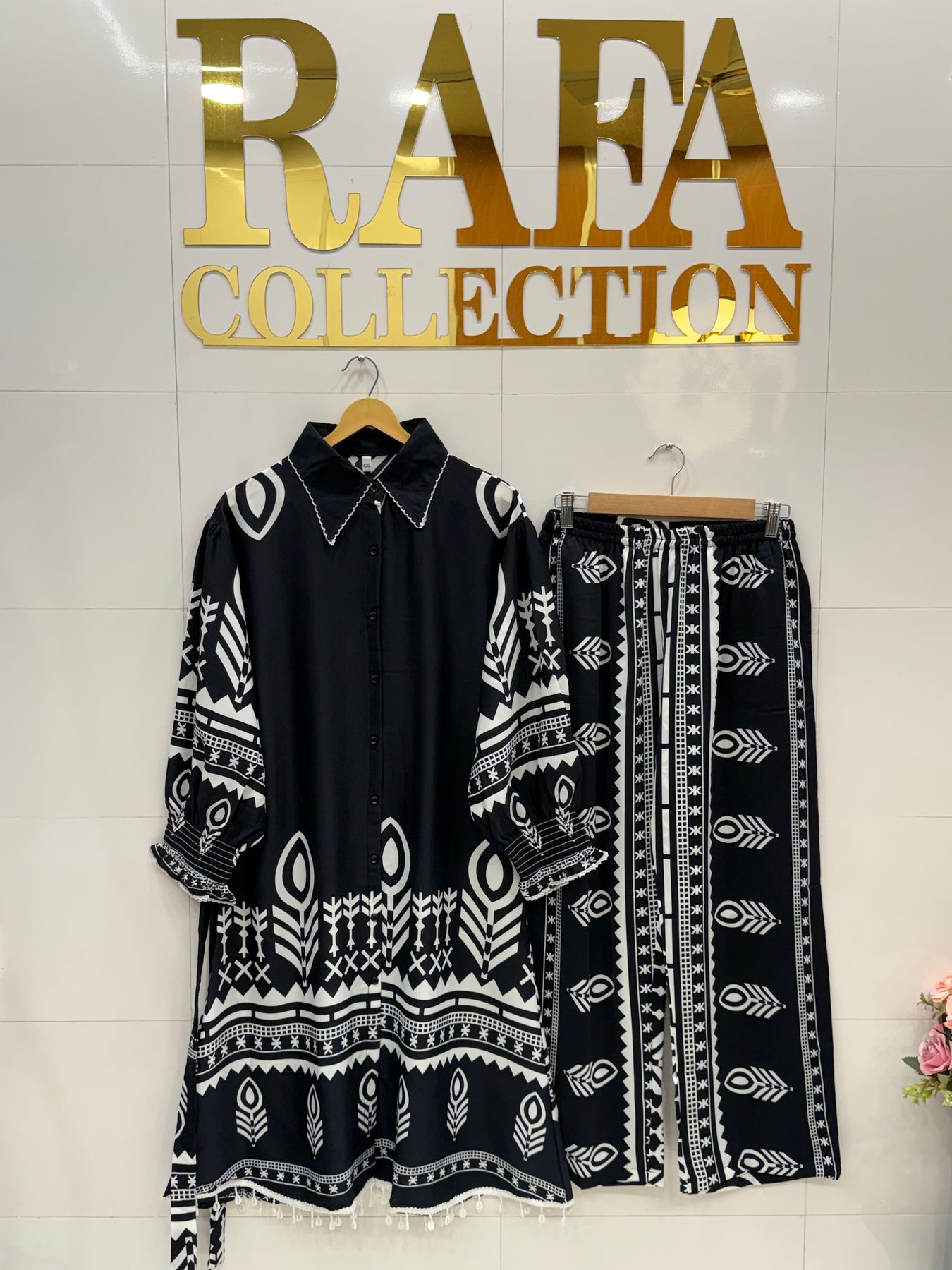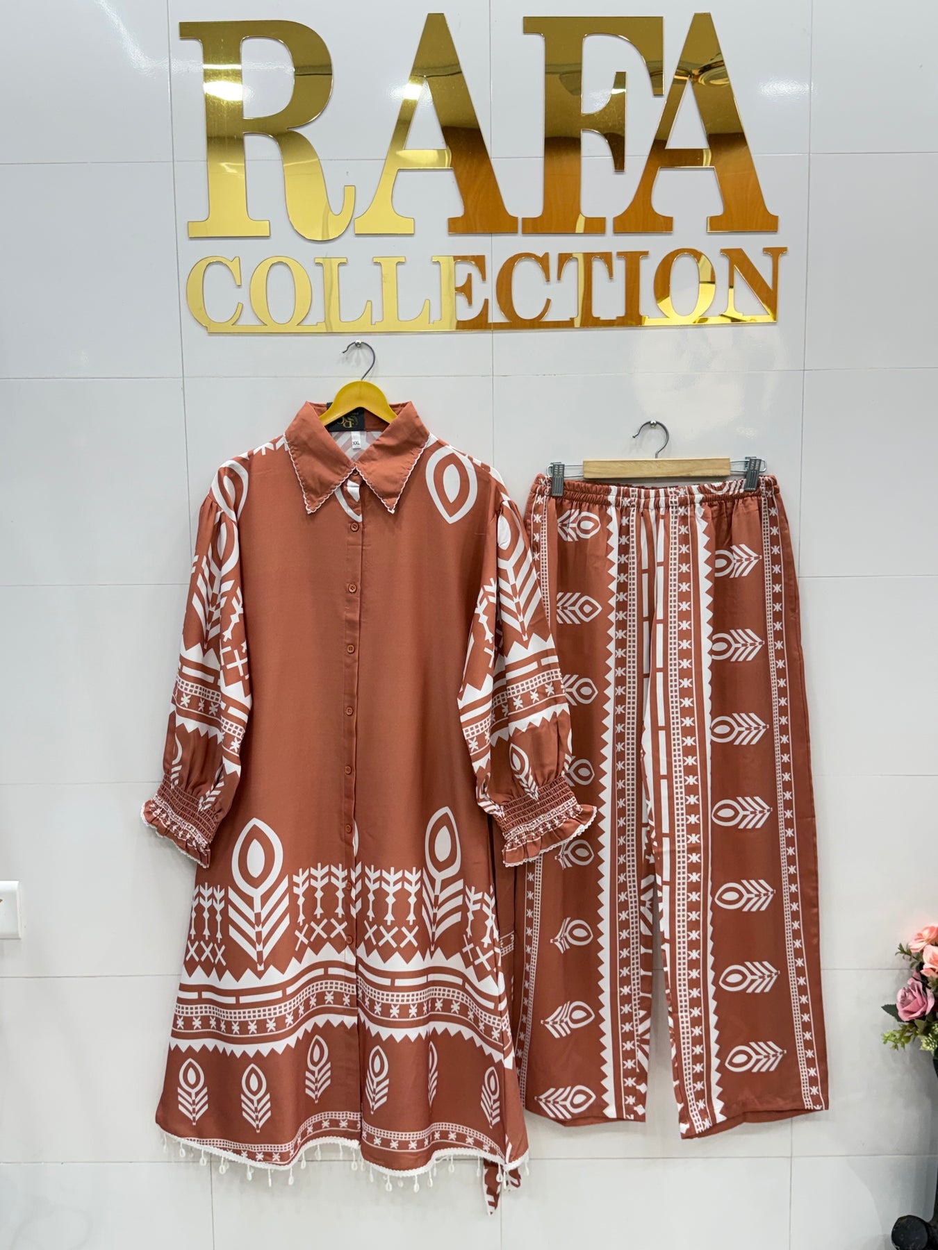 D No:-3150.”Experience effortless style with our imported co-ord set 3150. This set includes a printed top with delicate shell detailing, adding a touch of elegance to your outfit. With imported quality, you can feel confident in both the style and durability of this set. Perfect for any occasion!"