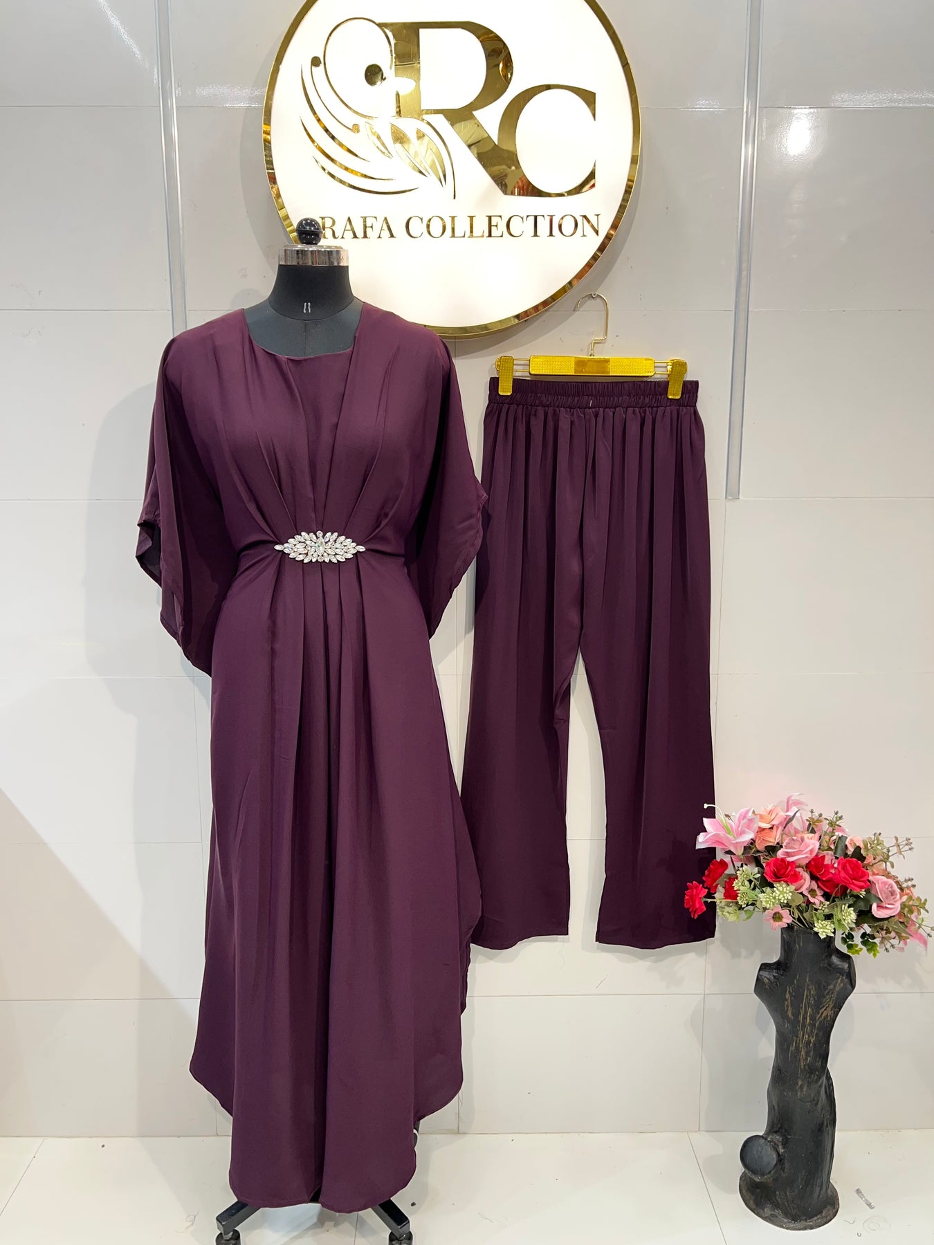 D.no:- 2601. Elevate your wardrobe with our imported kaftan top featuring a delicate brooch. Made with high-quality materials, this co-ord set provides a touch of elegance to any outfit. Perfect for any occasion, this versatile piece is a must-have for any fashion-forward individual.