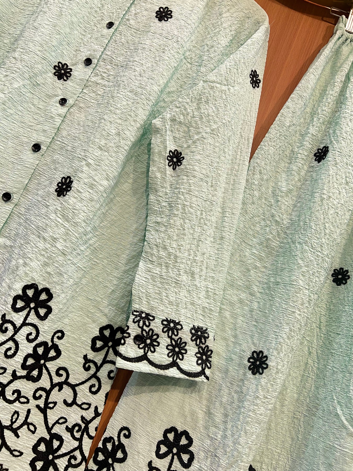 D no :-2568 Expertly crafted from crinkle fabric, these Imported co - ord sets  showcase stunning Kashmiri embroidery work. Feel effortlessly stylish and elegant in these sets, perfect for any occasion. Embrace quality and sophistication with these one-of-a-kind sets.