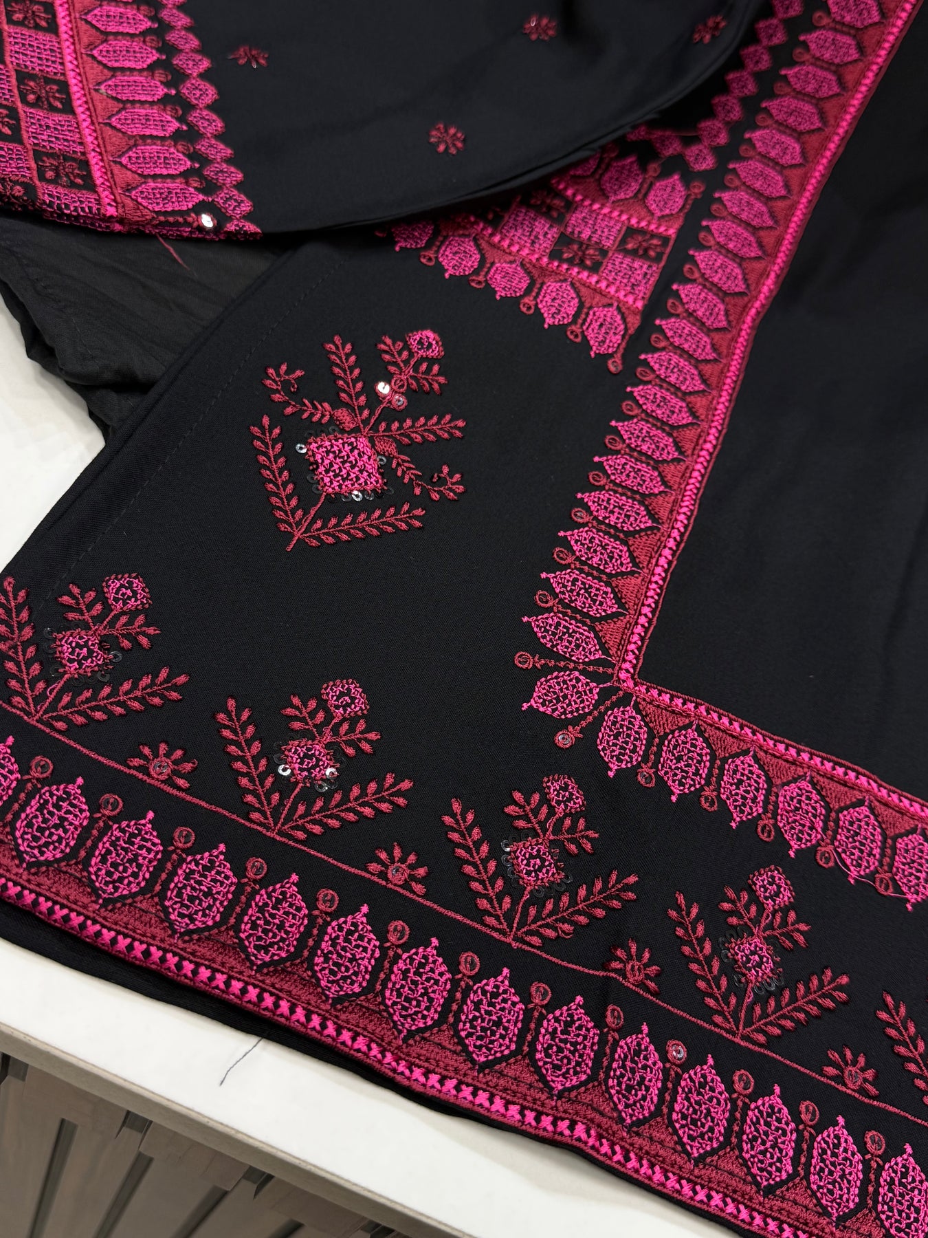 D.no :-3118.This Pakistani viral co-ord set 3118 is made with heavy rayon fabric and features exquisite embroidery and sequence work. With its bell sleeves, this set exudes elegance and style. Made with quality materials and attention to detail, experience the comfort and sophistication of this outfit.