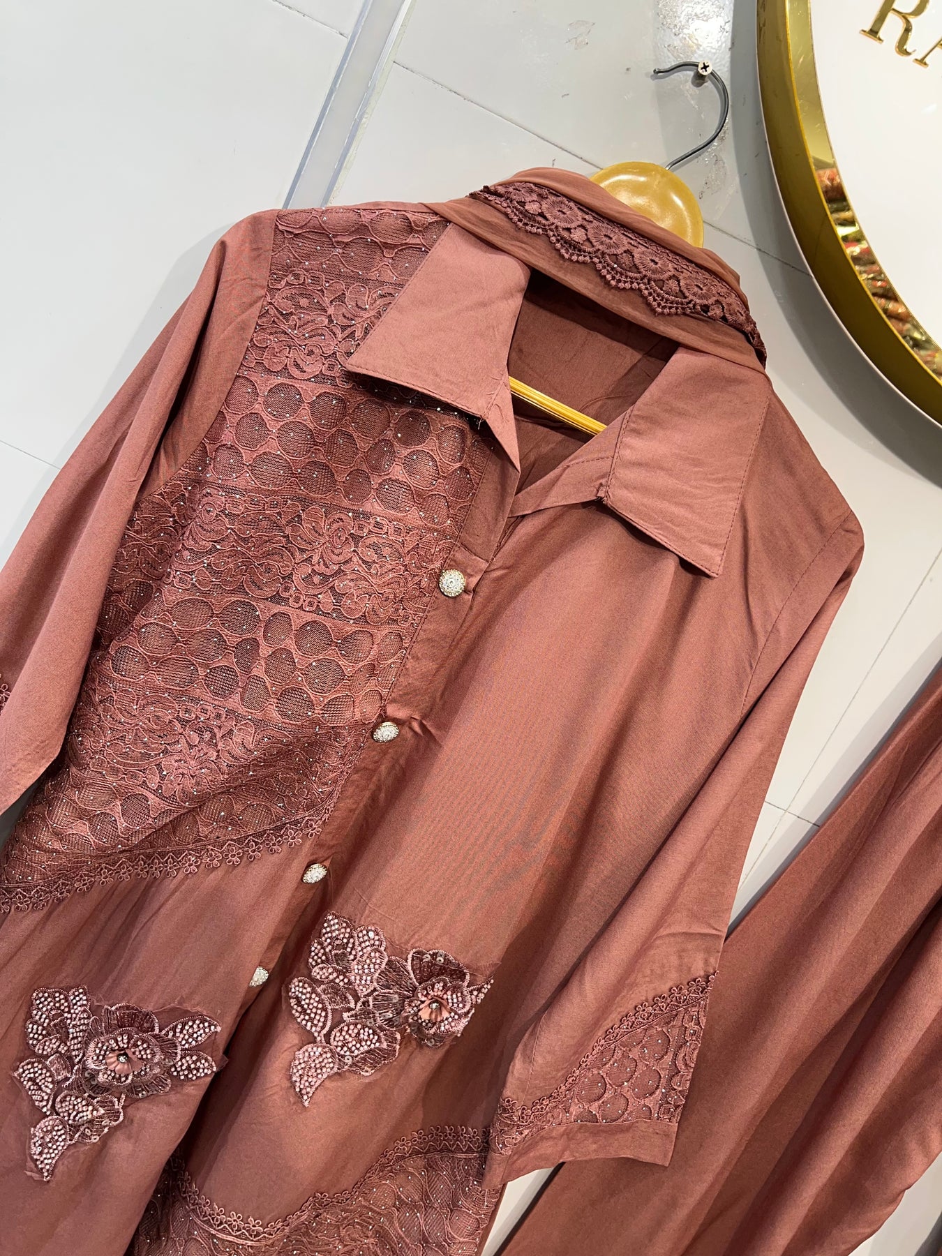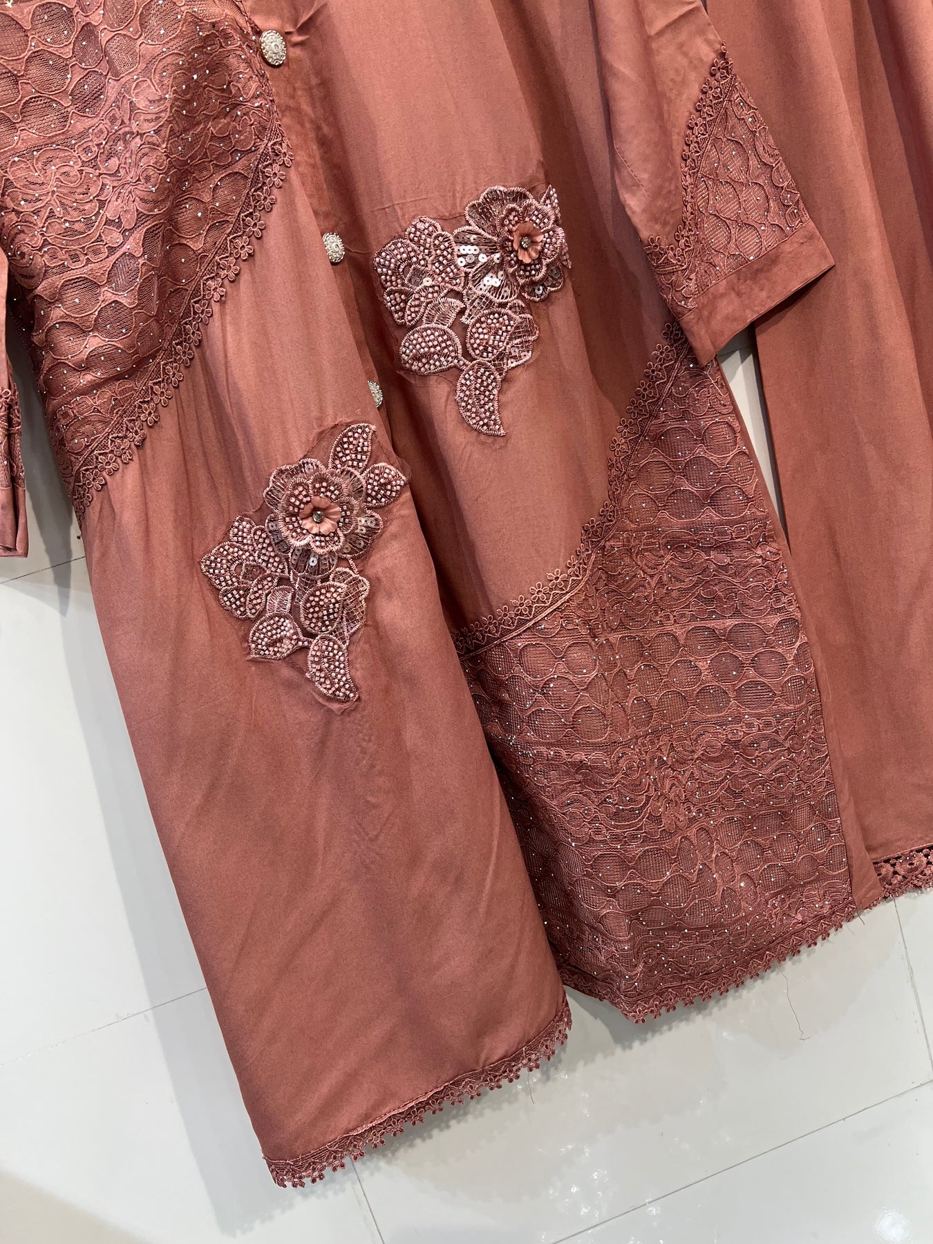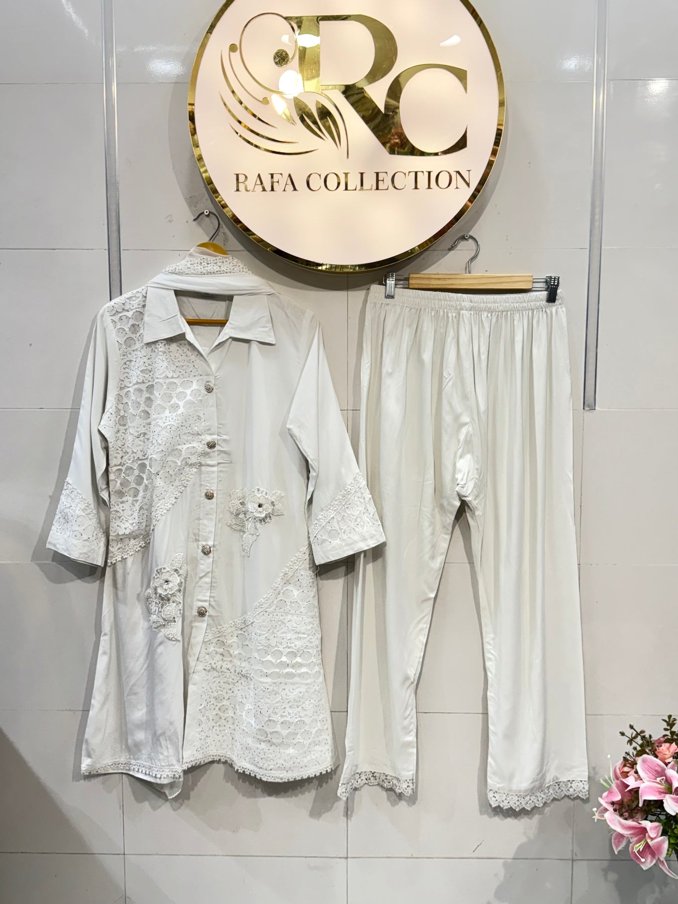 D no :-2555. This Co-ord set, style number, features delicate craftsmanship with rayon crochet and lace work. Made from high-quality materials, this set offers both comfort and durability. Add elegance to your wardrobe with this timeless piece.