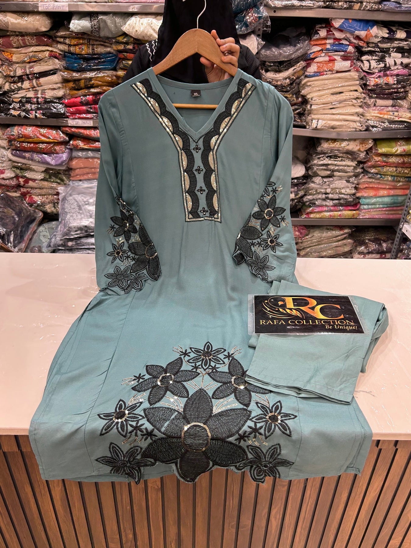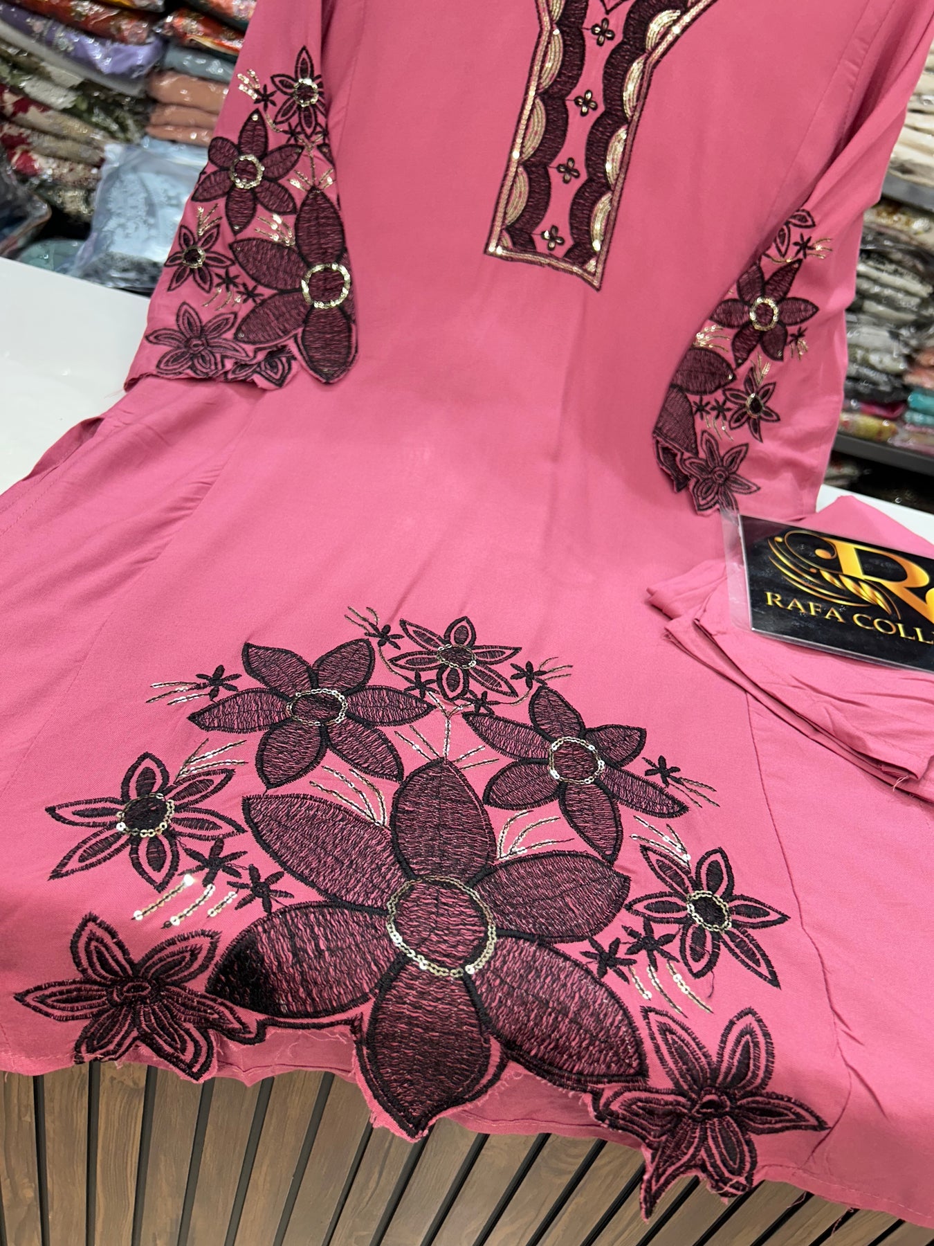 D no :- 2640 This co-ord set is made from high-quality rayon, providing a luxurious feel and durability. The intricate embroidery and delicate sequence work add a touch of elegance to the design. Elevate your style with this stylish and long-lasting set.