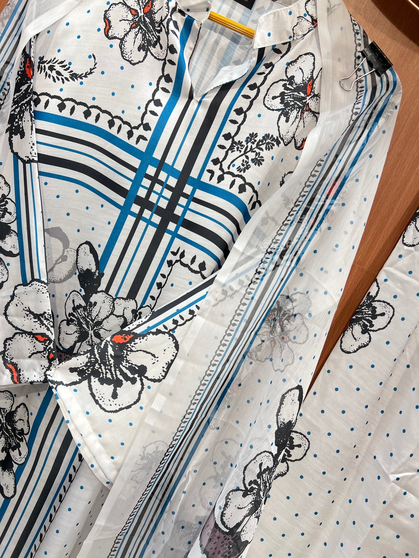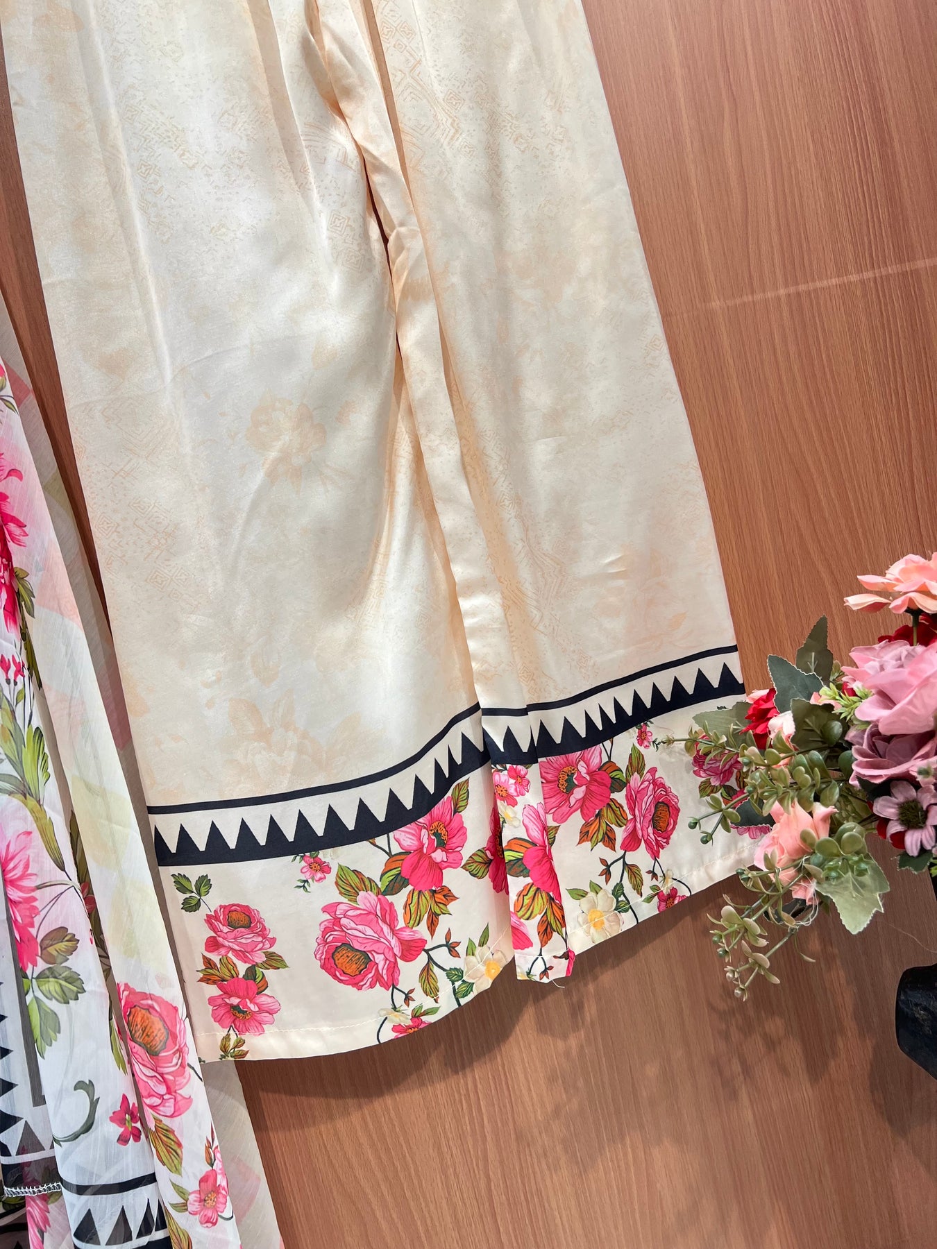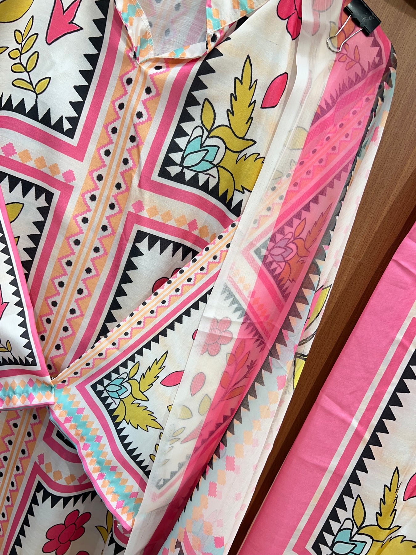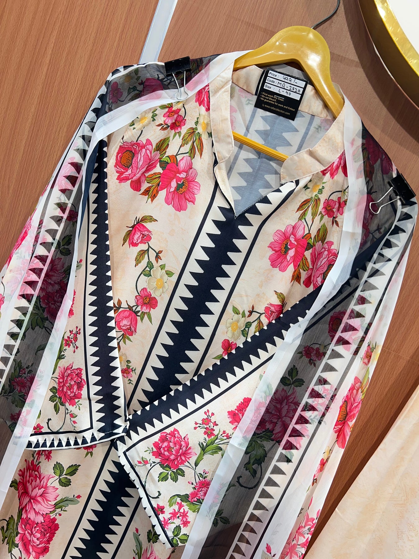 D no :- 2720 Expertly crafted from lightweight crepe fabric, this Turkish co-ord set features a stylish printed top with elegant bell sleeves. The soft and flowy material ensures a comfortable fit, while the bold print adds a touch of sophistication. Perfect for any occasion, this set effortlessly combines style and comfort.