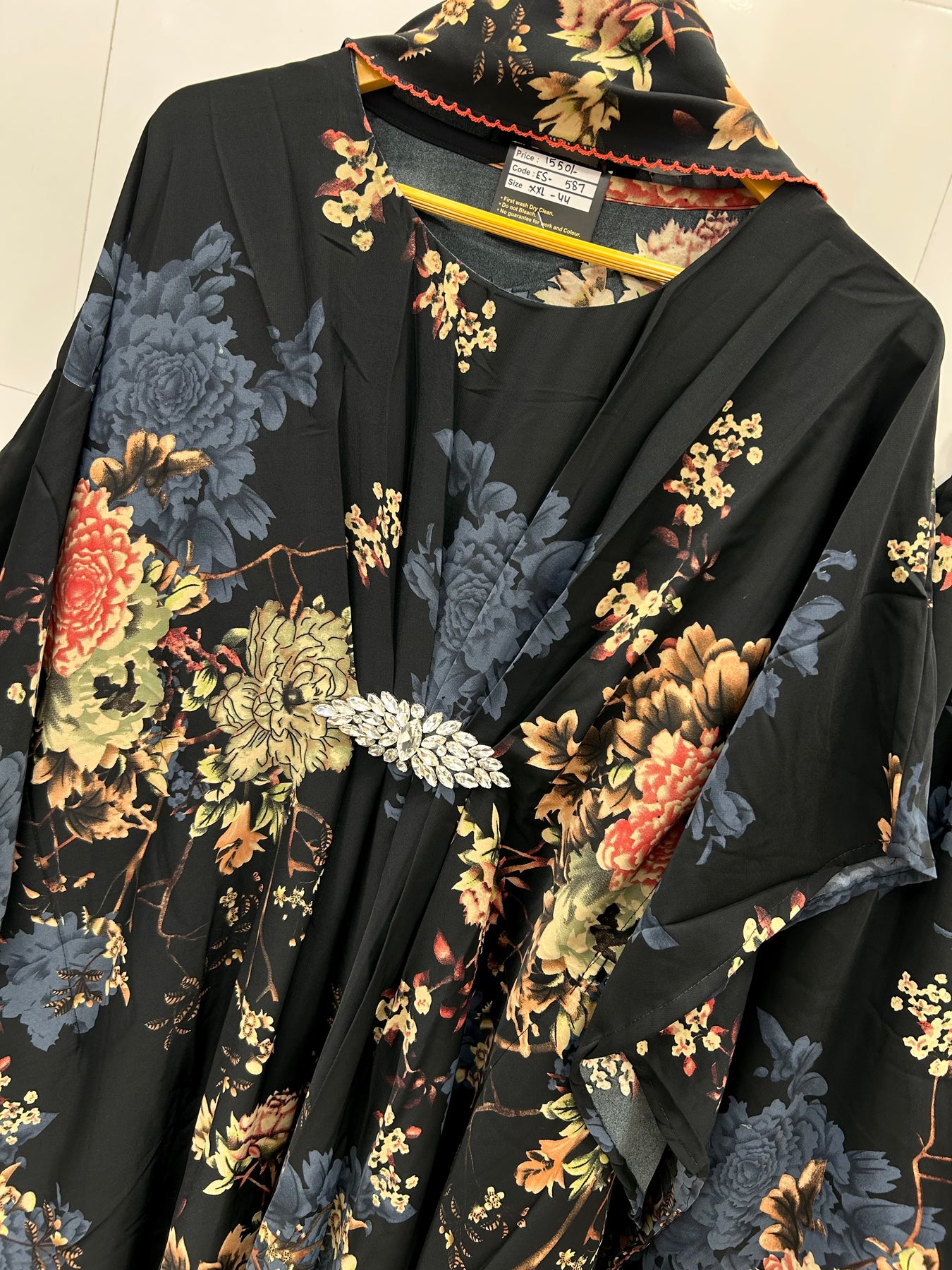 Top:- Imported satin printed long kaftan top with Brooch