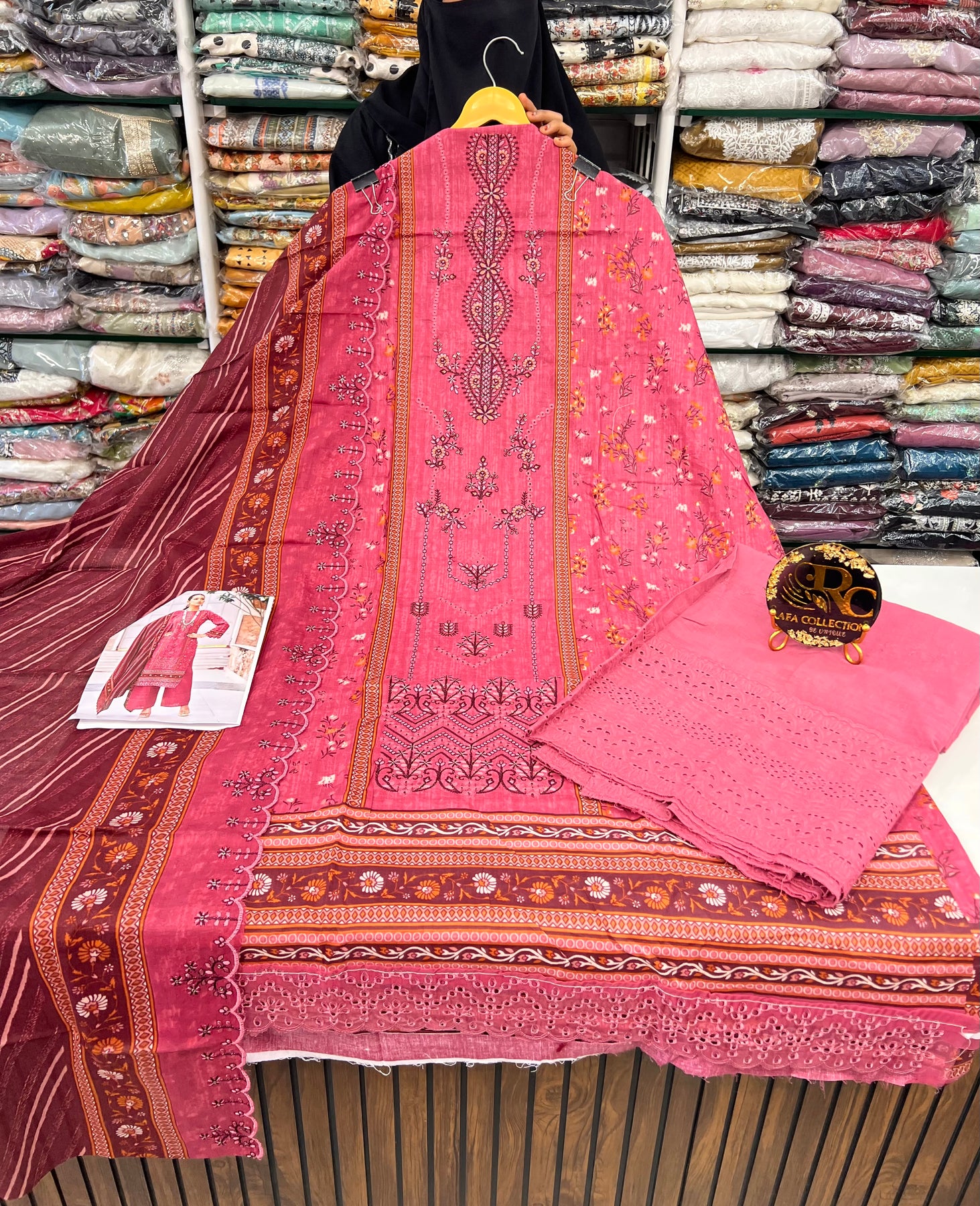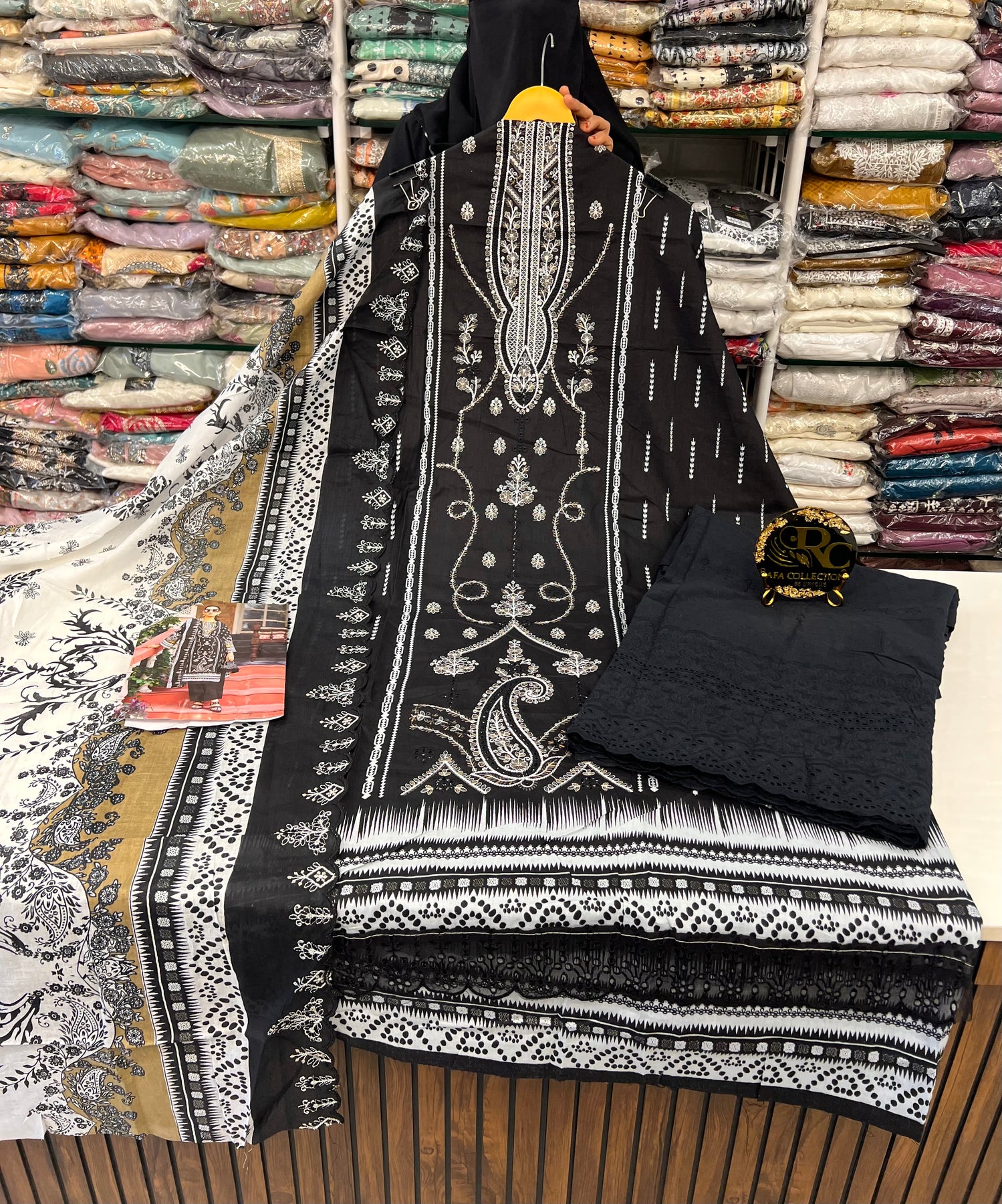 D no ::- 129665 This pure cotton printed top comes with beautiful embroidery and sequence work, providing a unique and stylish look. Made from high-quality cotton, this collection offers both comfort and elegance. Elevate your wardrobe with this versatile unstitched collection.