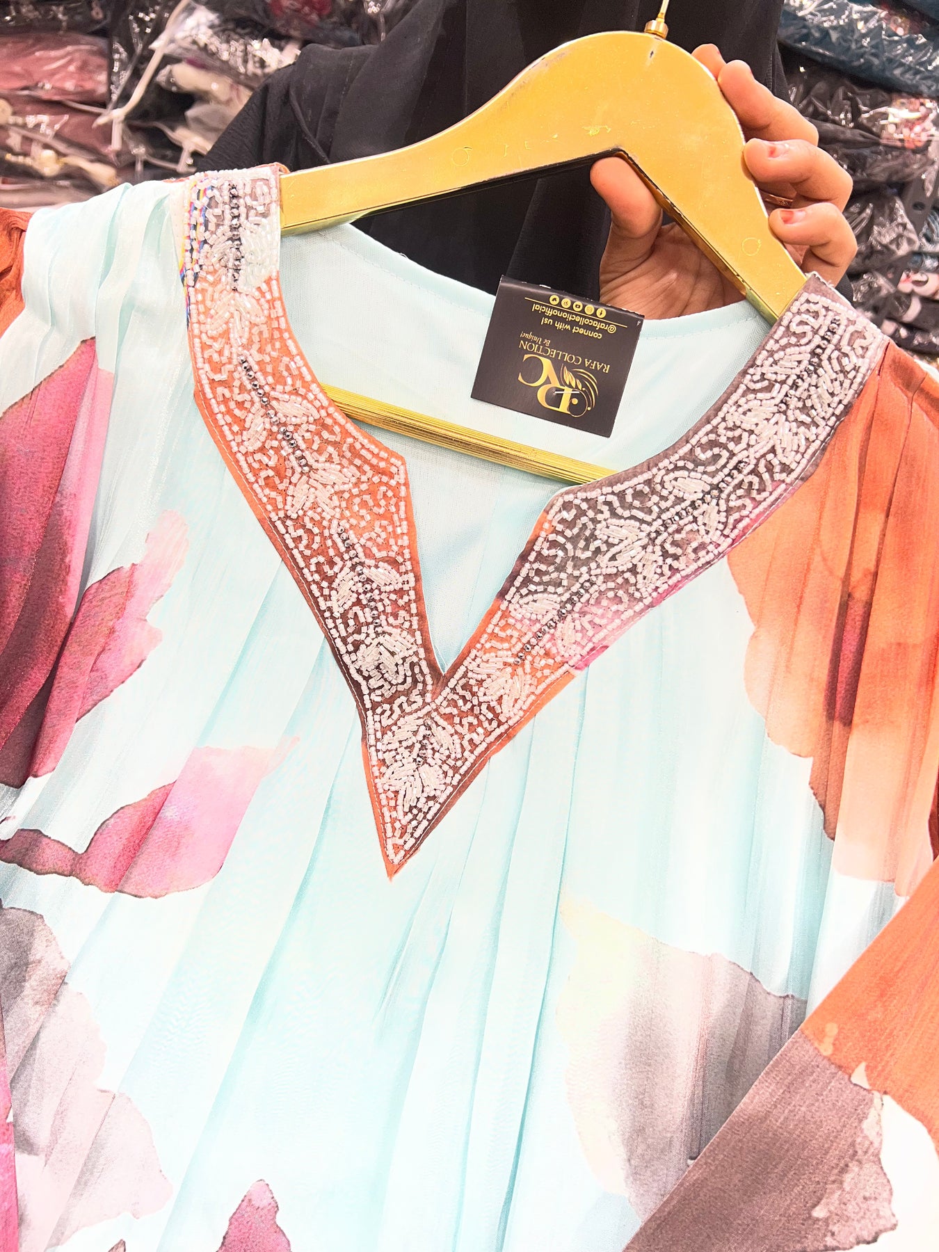 Top:-Organza Printed Top with neck Handwork seperate belt given for fitting