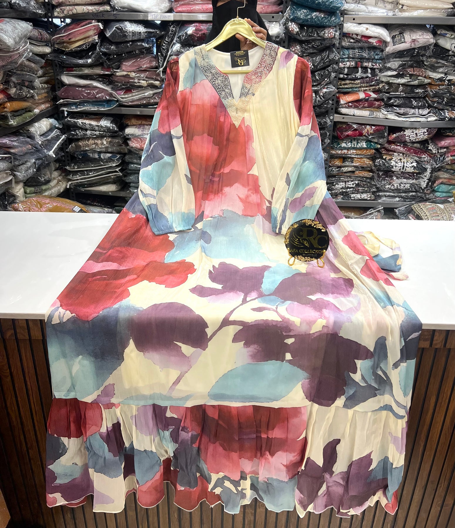 D No:-2865.This luxurious Organza Gown 2865 features a breathtaking printed top with exquisite handwork detailing. A handcrafted belt is also included for a perfect, flattering fit. Elevate your style with the elegant Organza Gown 2865, crafted with precision and sophistication.