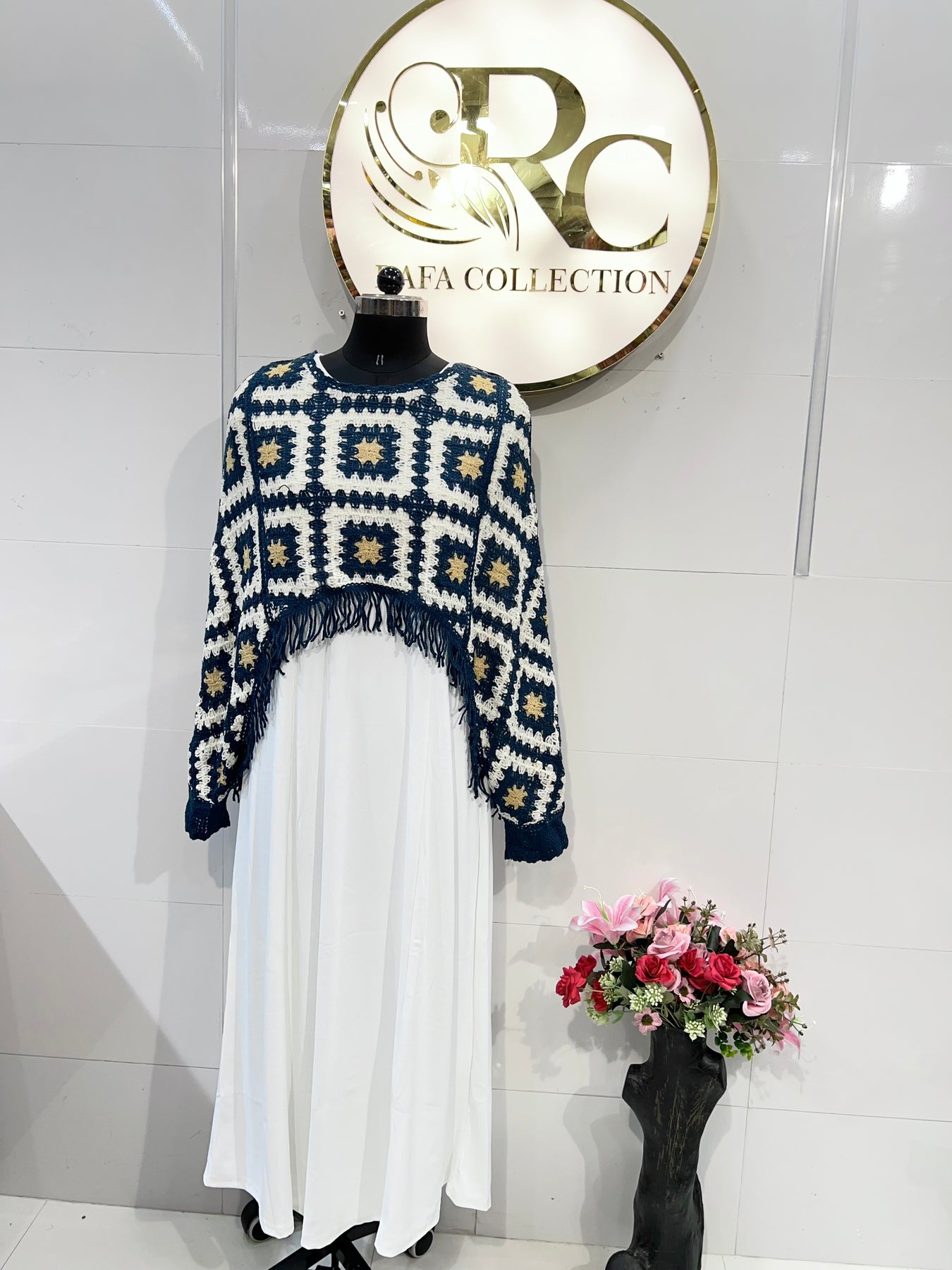 D.no:-124214.  Expertly crafted with stretchable Lycra fabric, this beautiful dress is designed for both comfort and style. The separate crochet poncho adds a touch of sophistication, making it perfect for any occasion. Embrace the versatility of this dress and elevate your wardrobe with ease.