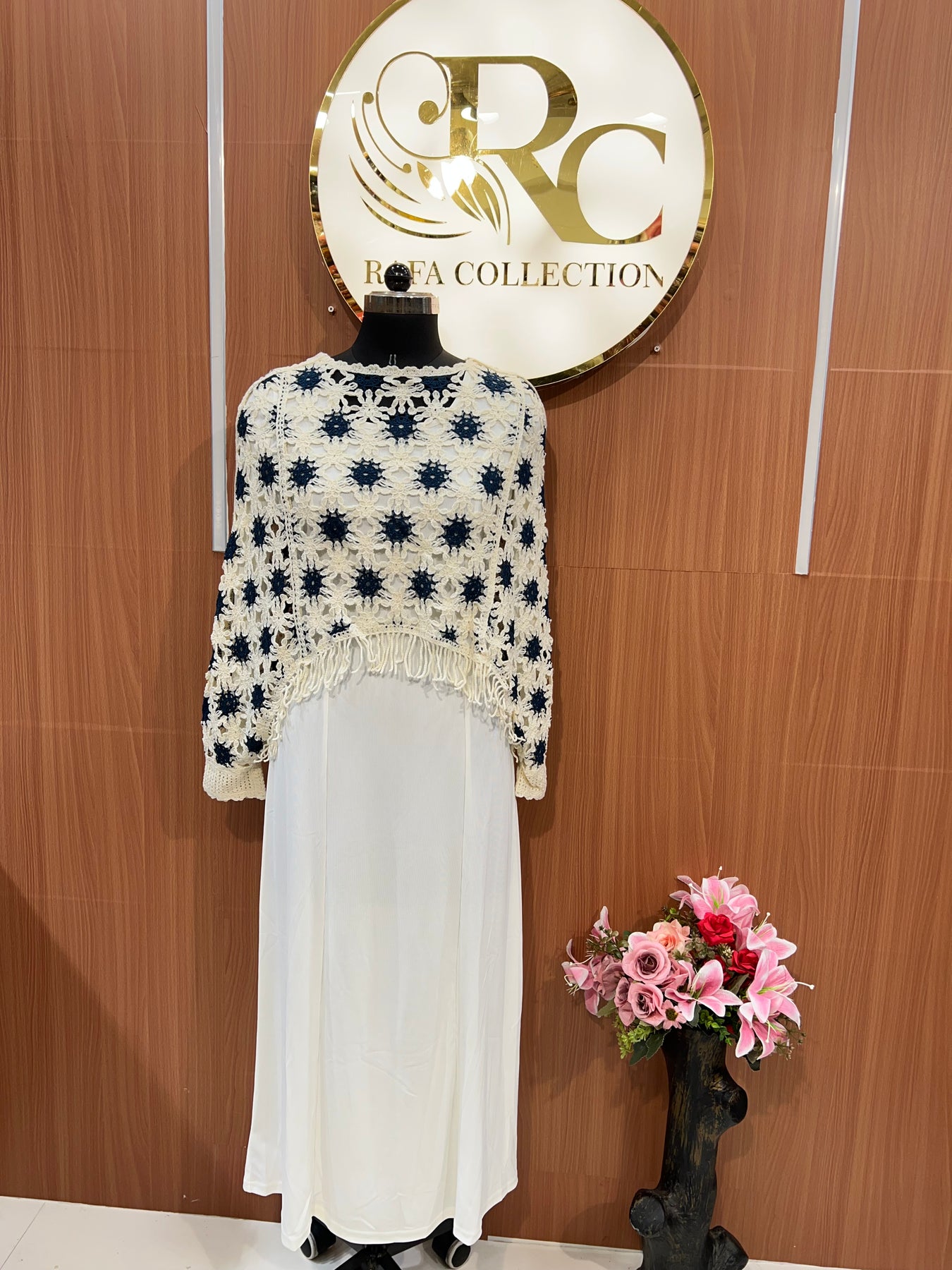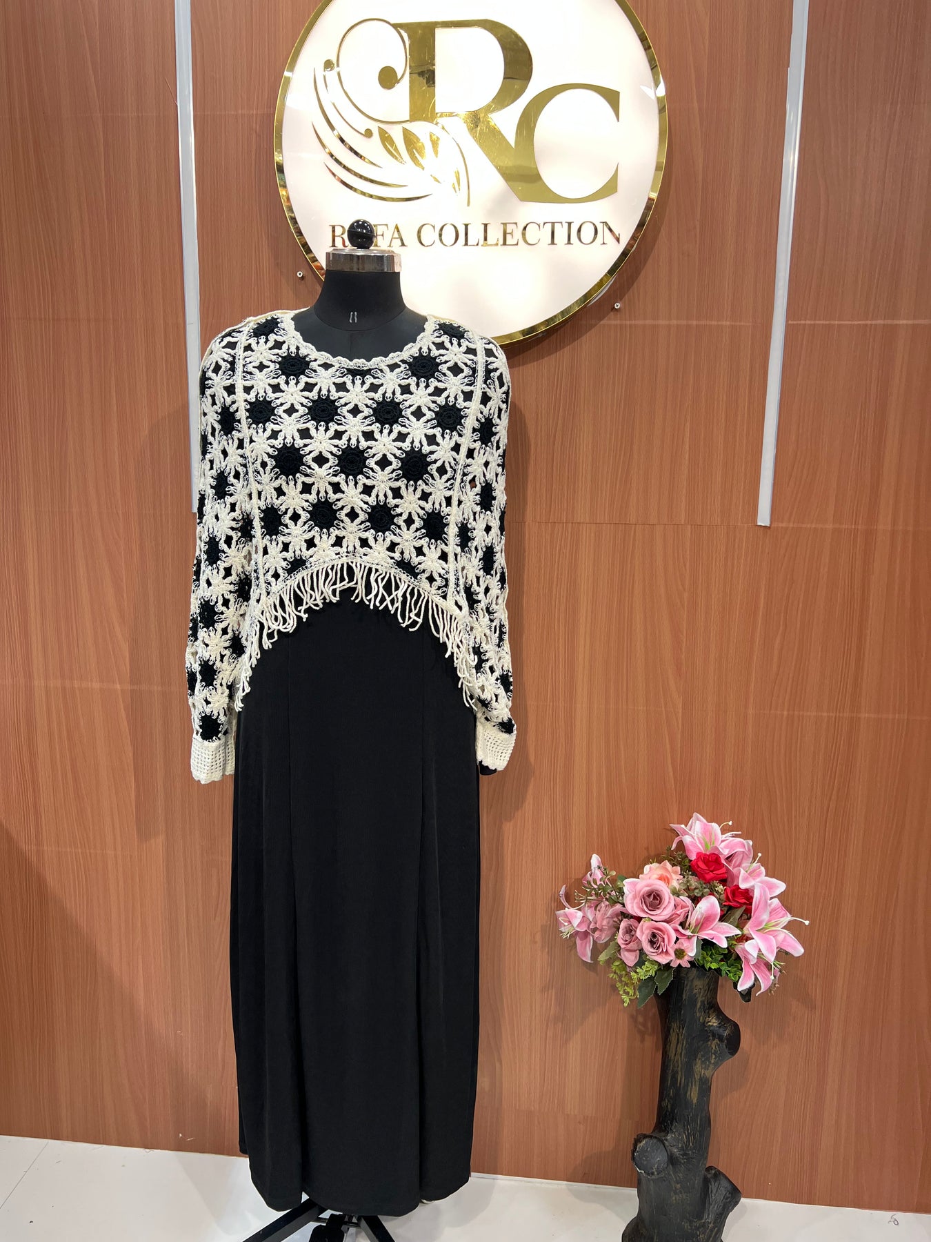 D.no:-2714.  Expertly crafted with stretchable Lycra fabric, this beautiful dress is designed for both comfort and style. The separate crochet poncho adds a touch of sophistication, making it perfect for any occasion. Embrace the versatility of this dress and elevate your wardrobe with ease.