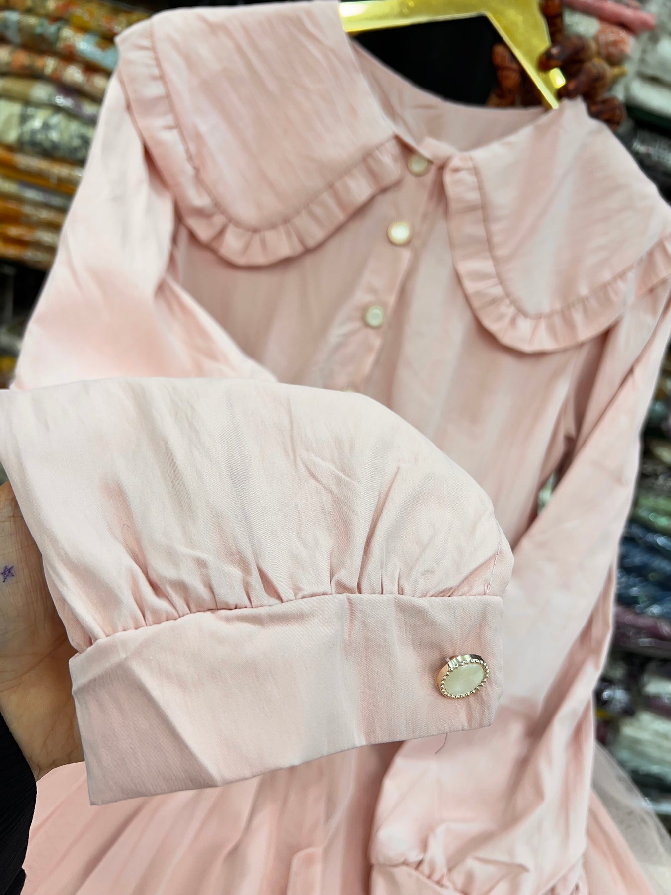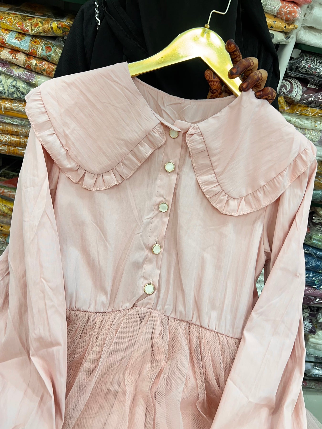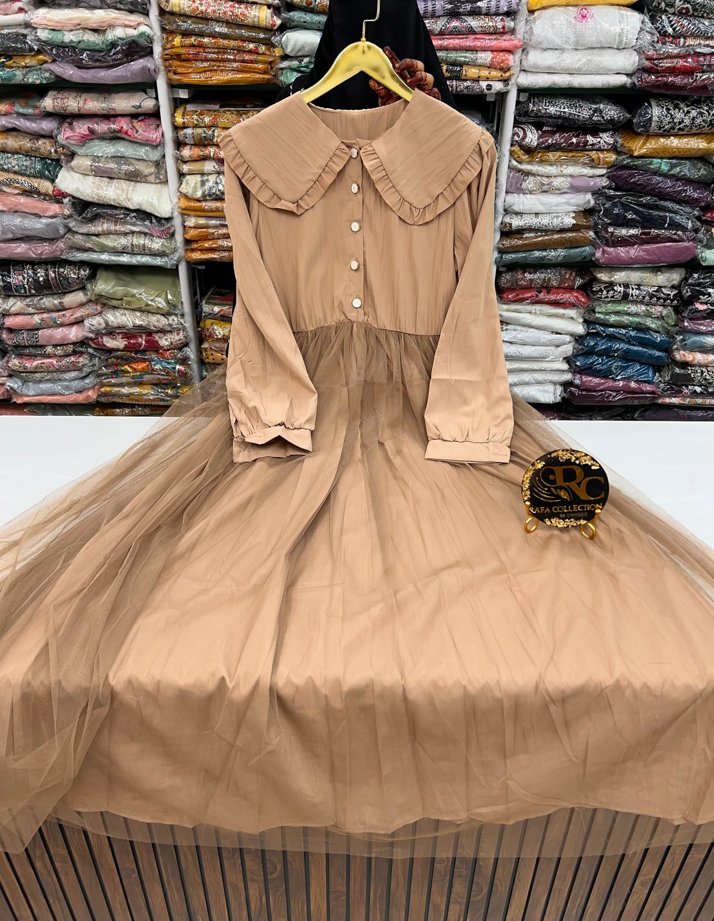 D No:-2772.Stay stylish and comfortable with our Korean dress. Made with a cotton top and net fabric, it offers a perfect blend of elegance and breathability. Achieve a versatile look with this piece, perfect for any occasion. Add to your wardrobe now.
