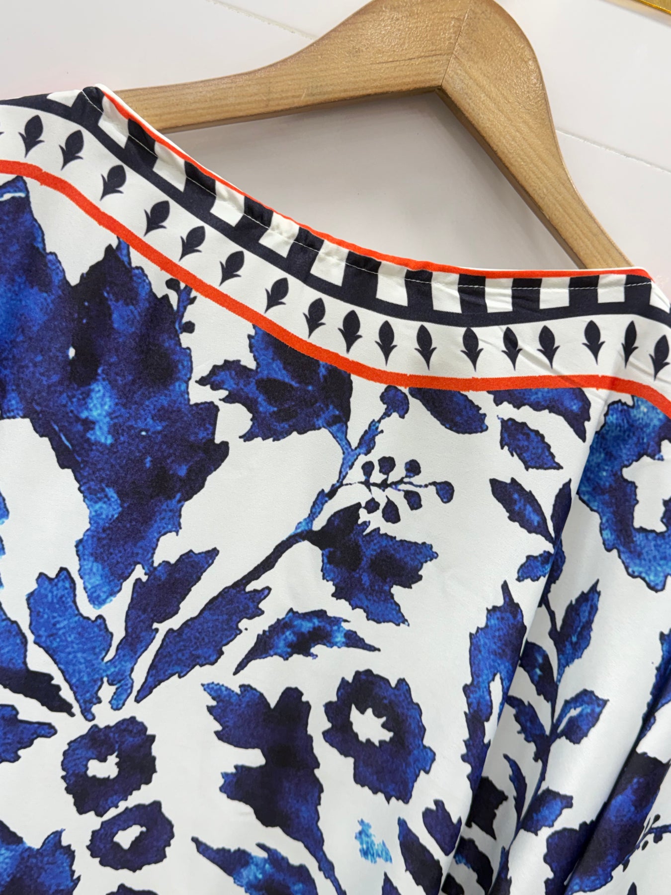 Top :- American satin printed semi kaftan top ( bell sleeves )