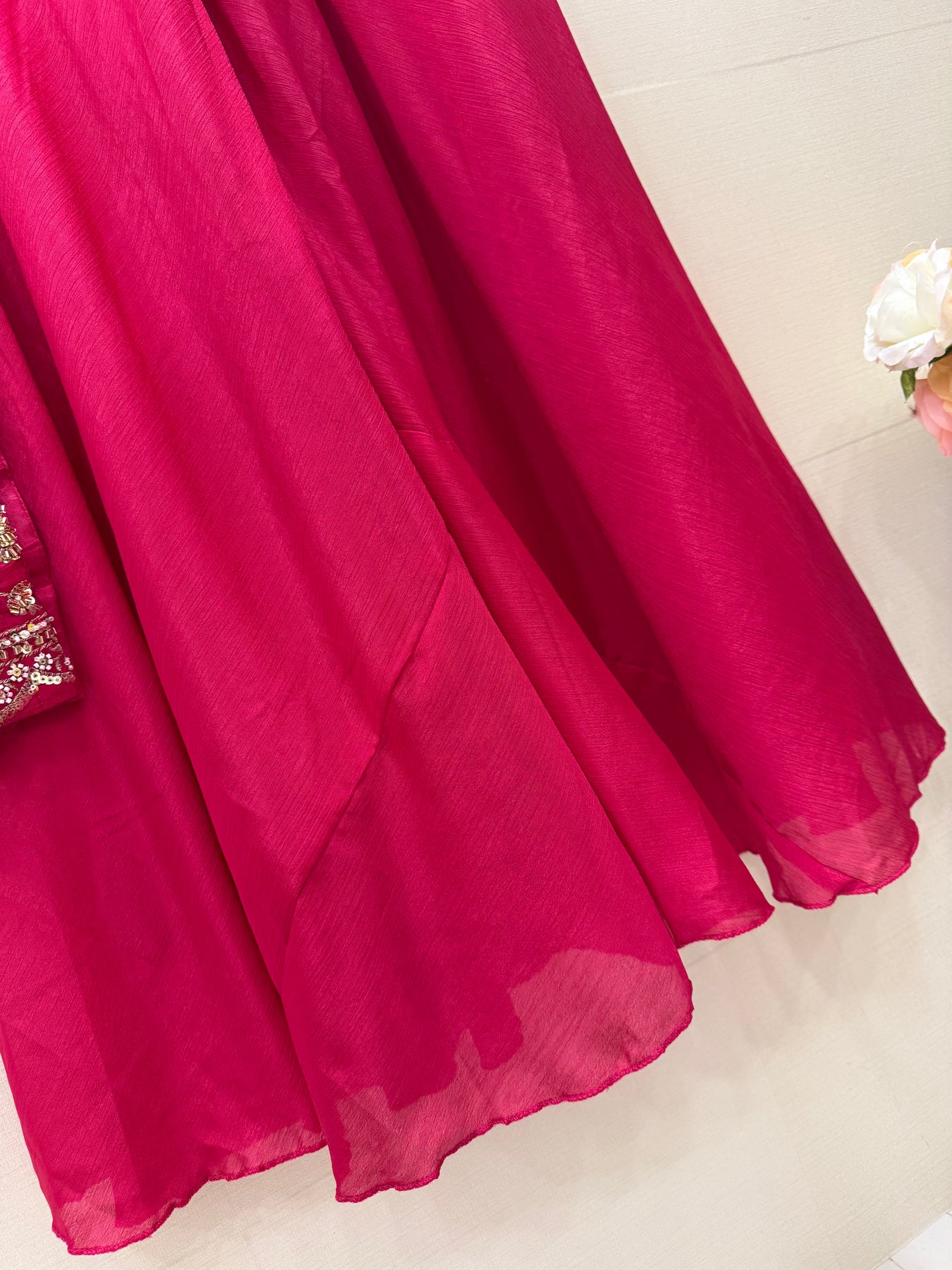 D No:-19311.The Chinon kurti features intricate handwork, enhancing its aesthetic appeal. Crafted from breathable Chinon fabric, it provides comfort while maintaining a refined appearance. The combination of quality materials and detailed craftsmanship makes it suitable for various occasions, offering versatility in your wardrobe.
