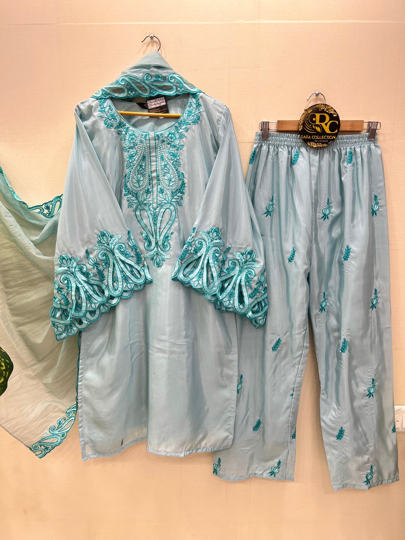 D No:-3000.The Pakistani suits features a shimmer organza kurti enhanced with intricate embroidery and cutwork sleeves. This garment combines aesthetic appeal with quality craftsmanship, making it suitable for formal occasions. The lightweight fabric allows for ease of movement, while the detailed design elevates the overall look.
