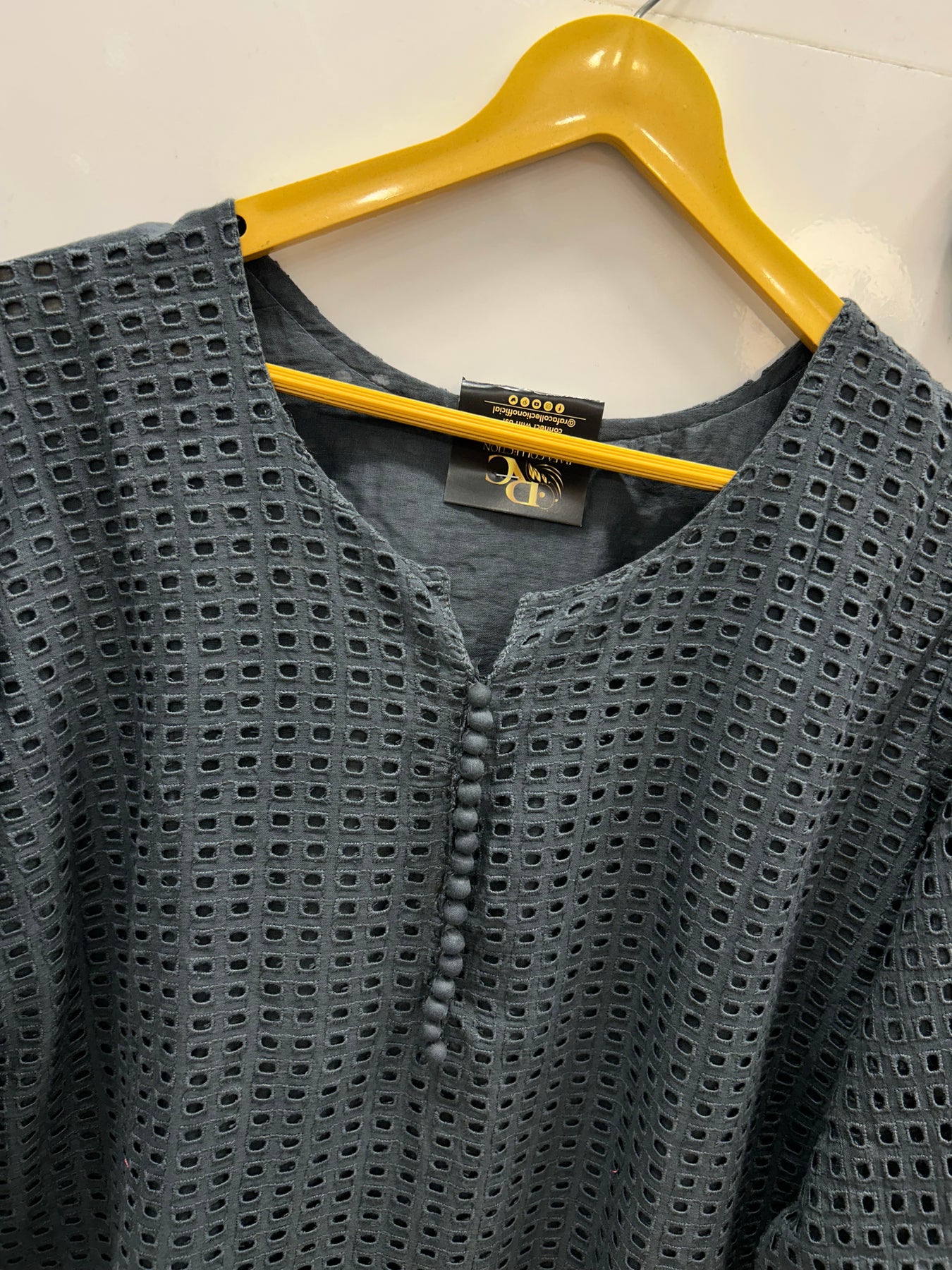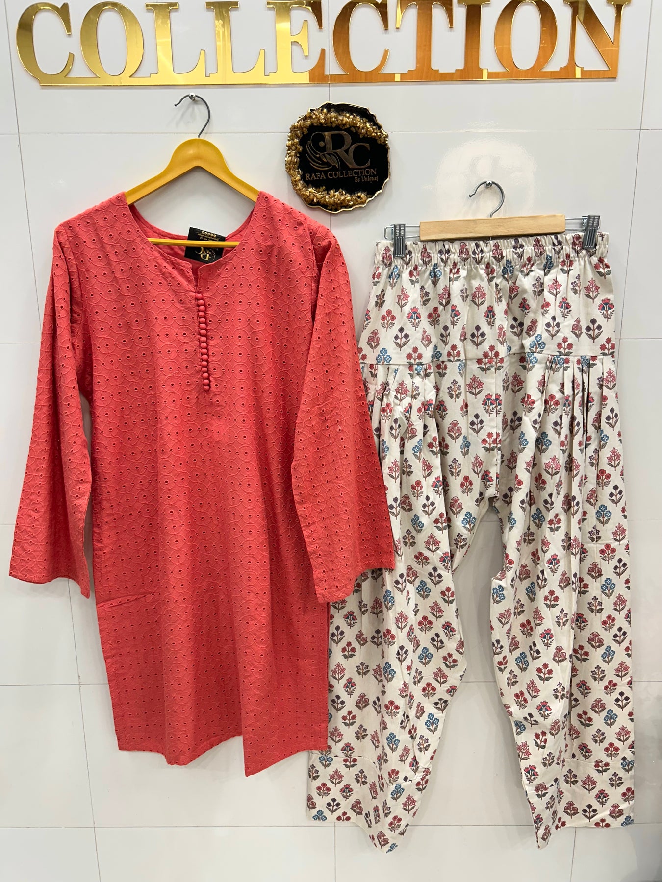 D No:-2864.This pure cotton kurti features a delicate and intricate chikankari embroidery, adding a touch of elegance and beauty to your wardrobe. Made from high-quality materials, it offers both comfort and style for any occasion. Elevate your fashion game with this stunning Chikankari Farshi suit.