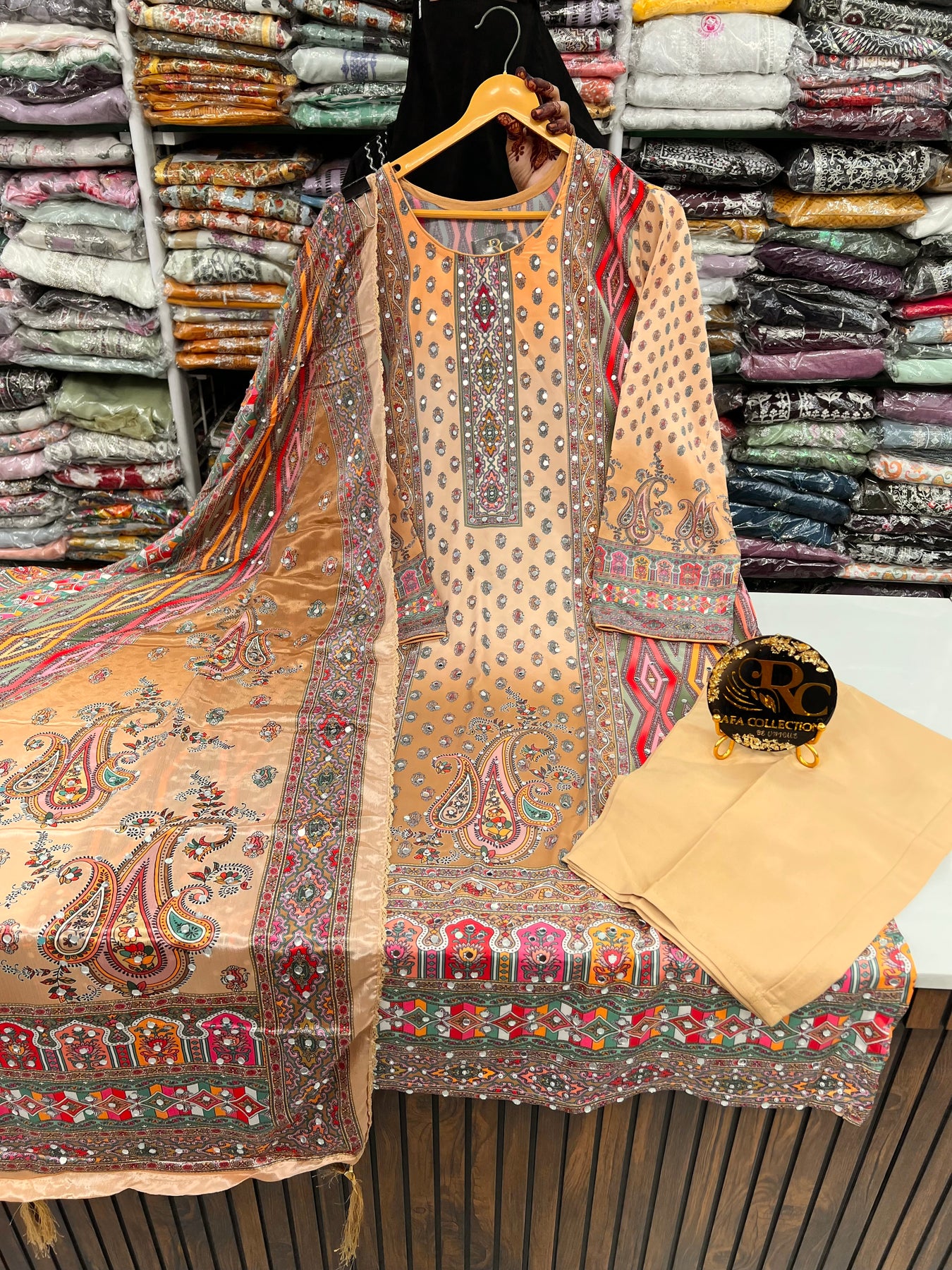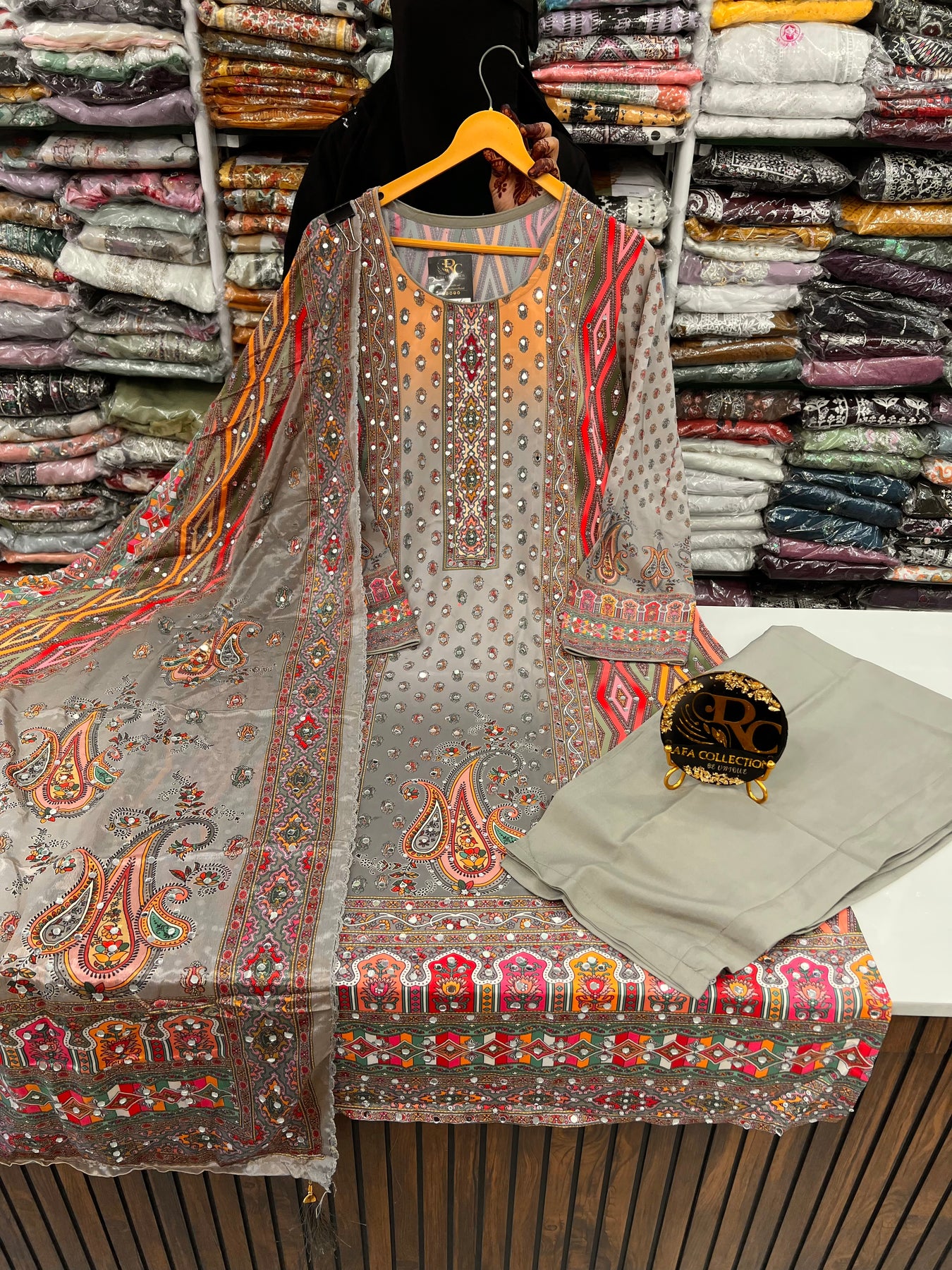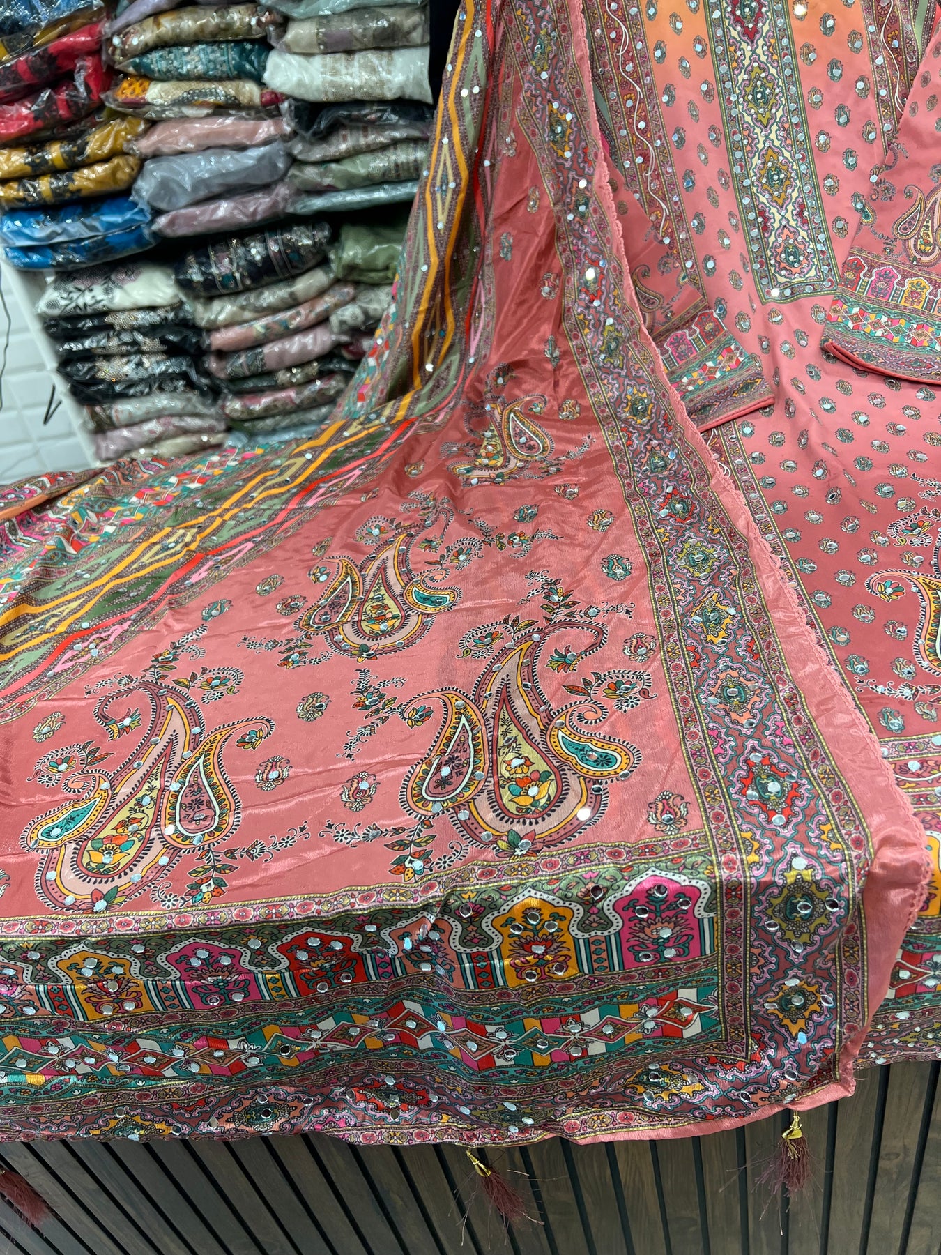 D.no:-2120. This multi colour mirror suit is a must-have for any fashion-forward individual. Made from luxurious satin material, it features intricate mirror work that adds a touch of elegance and glamour. Perfect for any occasion, this suit will make you stand out in a crowd.