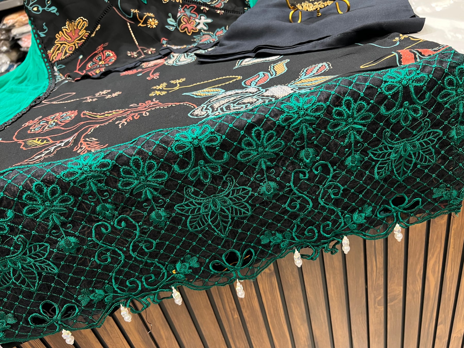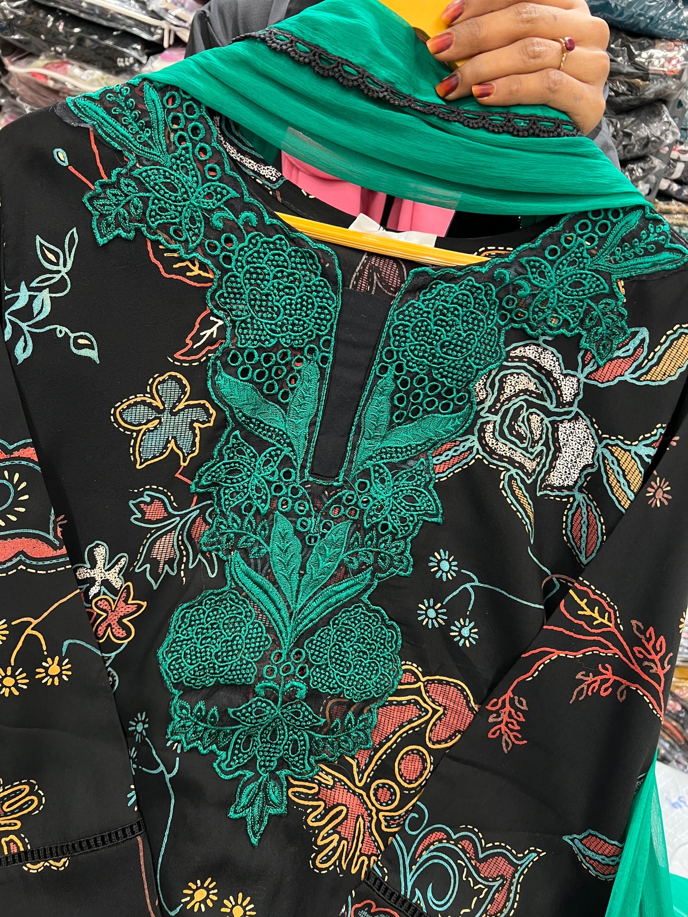 D No:-3135.This Pakistani formal suit features a rayon printed kurti with intricate embroidery and cutwork. Expertly crafted for a luxurious and elegant look, this suit is perfect for special occasions. The soft and lightweight rayon fabric ensures comfort while the delicate details add a touch of sophistication.