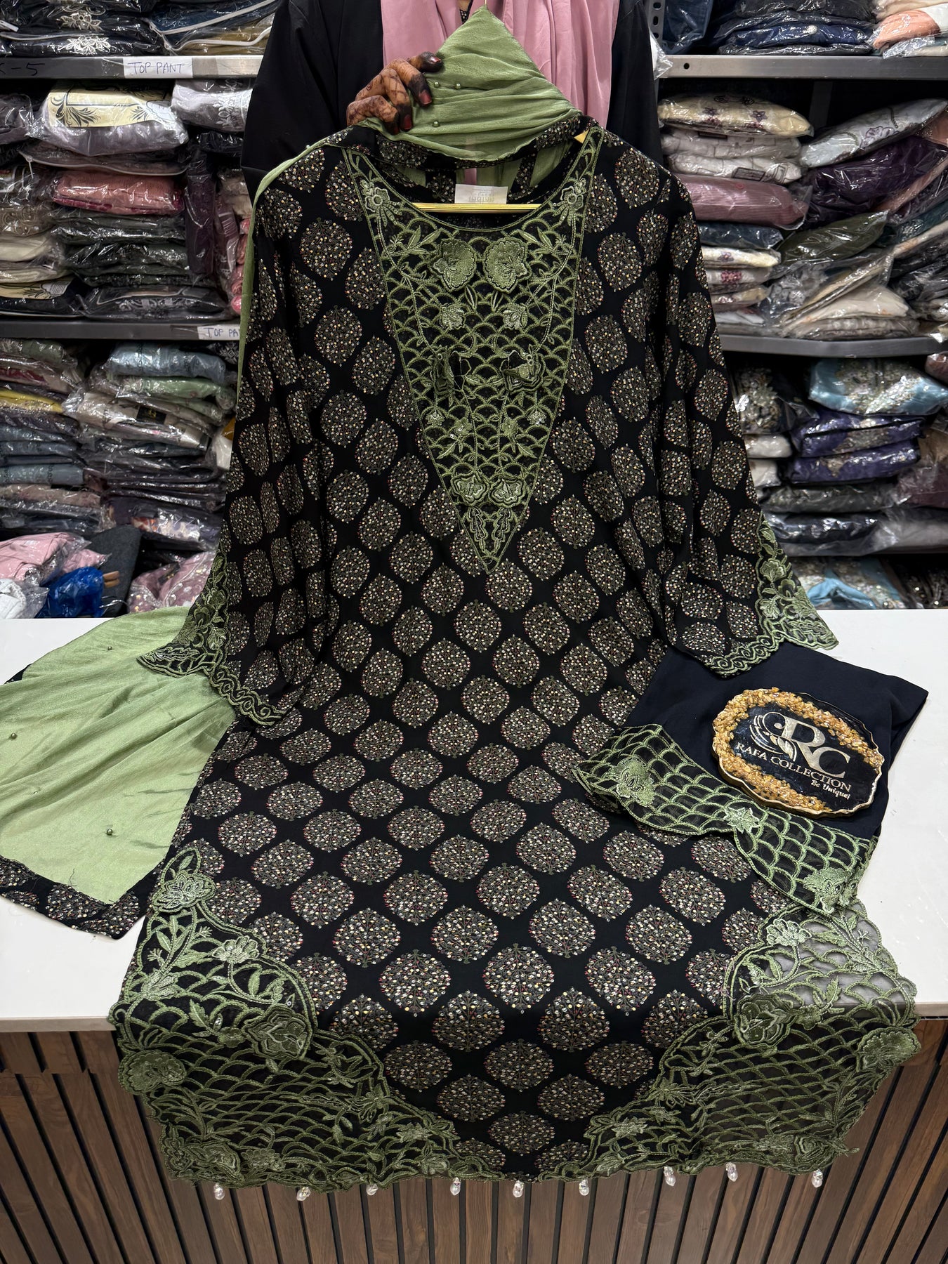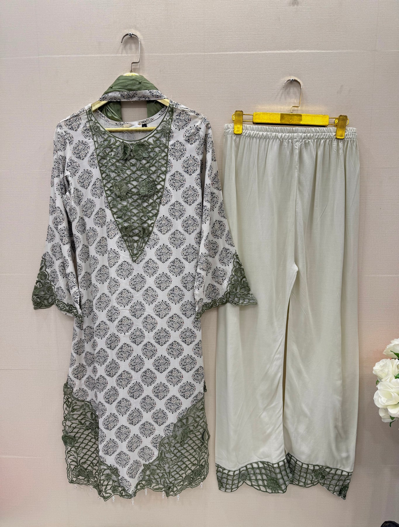 D No:-2939.Experience the elegance of Pakistani cutwork suits, featuring a rayon printed kurti enhanced with intricate embroidery and precise cutwork. The use of rayon ensures breathability and comfort, while the detailed craftsmanship adds a sophisticated touch to traditional attire. Ideal for various occasions, these suits combine style and functionality seamlessly.
