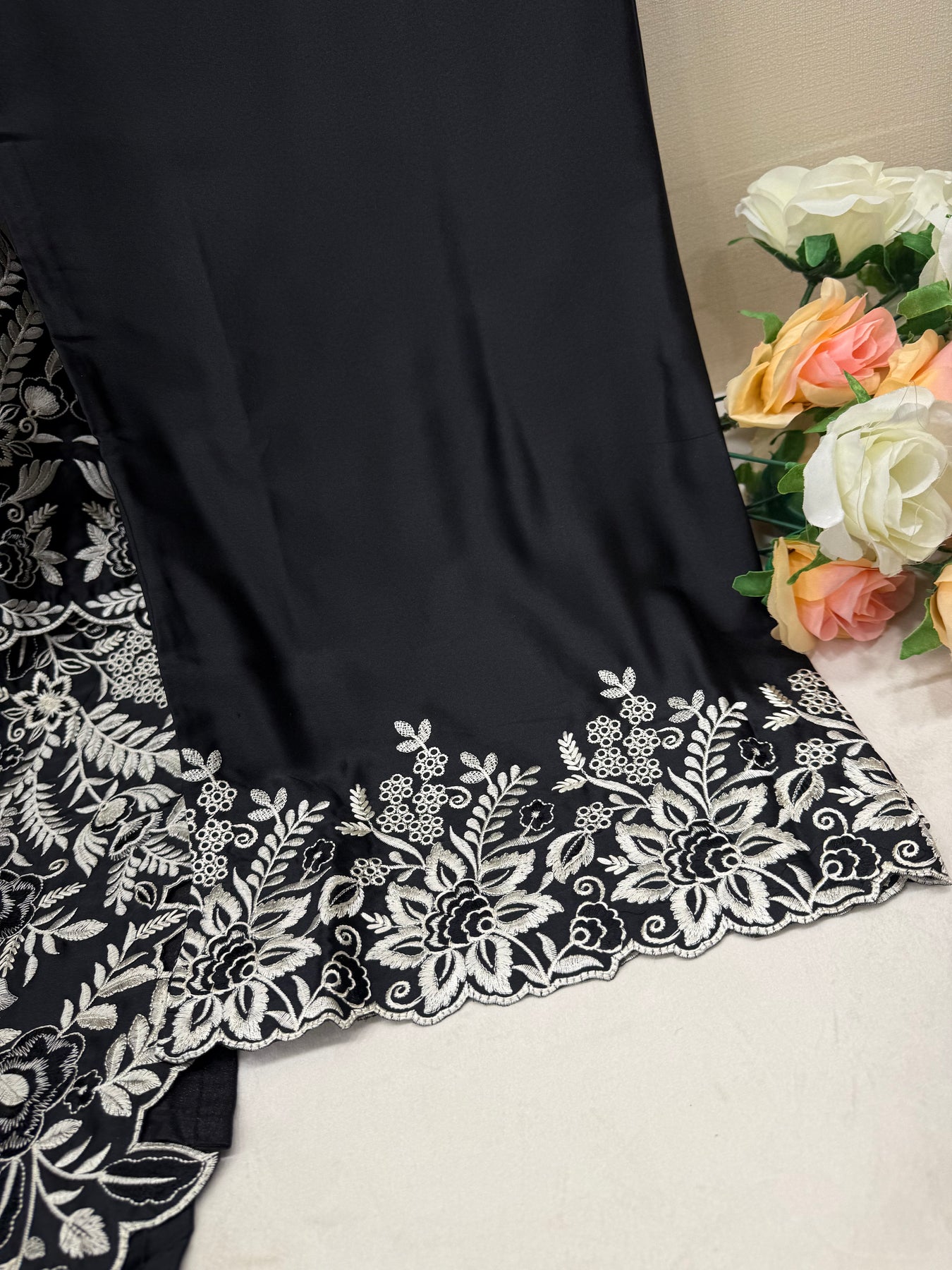 D No:-324.The features a satin fabric construction complemented by intricate sequence embroidery and a cutwork design on the bell sleeves. This combination enhances the garment's aesthetic appeal while providing a lightweight and breathable option suitable for various occasions. The careful detailing ensures durability and a polished look.