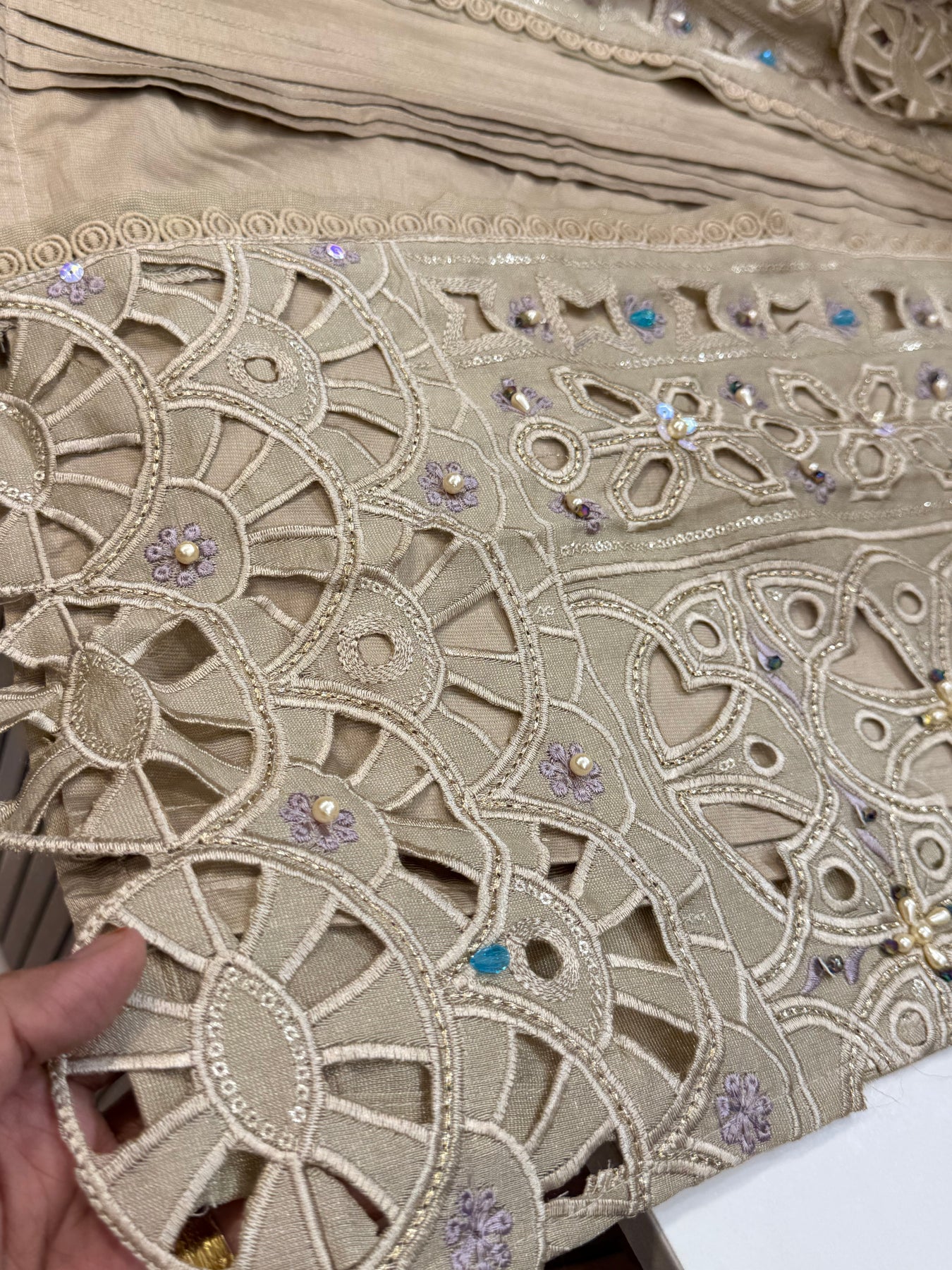 D no : - 2551This Pakistani formals outfit features a cotton silk inner with half sleeves, accompanied by a separate jacket detailed with cutwork and embellished with pearls and handwork. Enjoy the comfort of cotton and the elegance of silk, along with intricate craftsmanship and stunning textures. Perfect for special occasions or formal events.