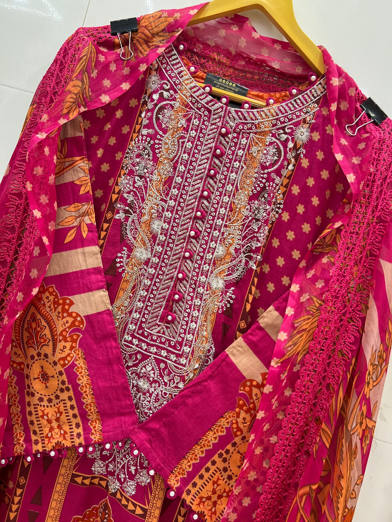 D no :- 2660 This Pakistani formal is perfect for any special occasion. Made from high-quality cotton, the top features intricate embroidery and patchwork, complemented by tassels for a touch of elegance. The unique printed design adds a touch of traditional charm. Make a statement with this stylish and comfortable formal piece.