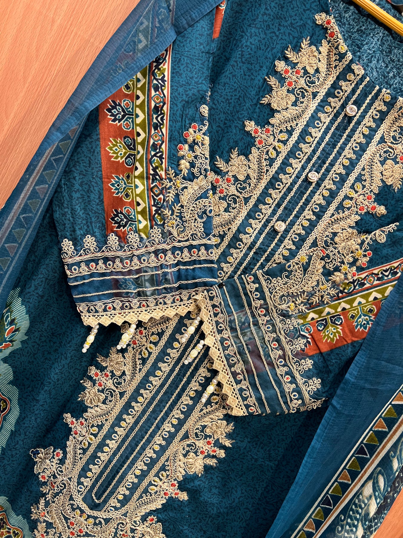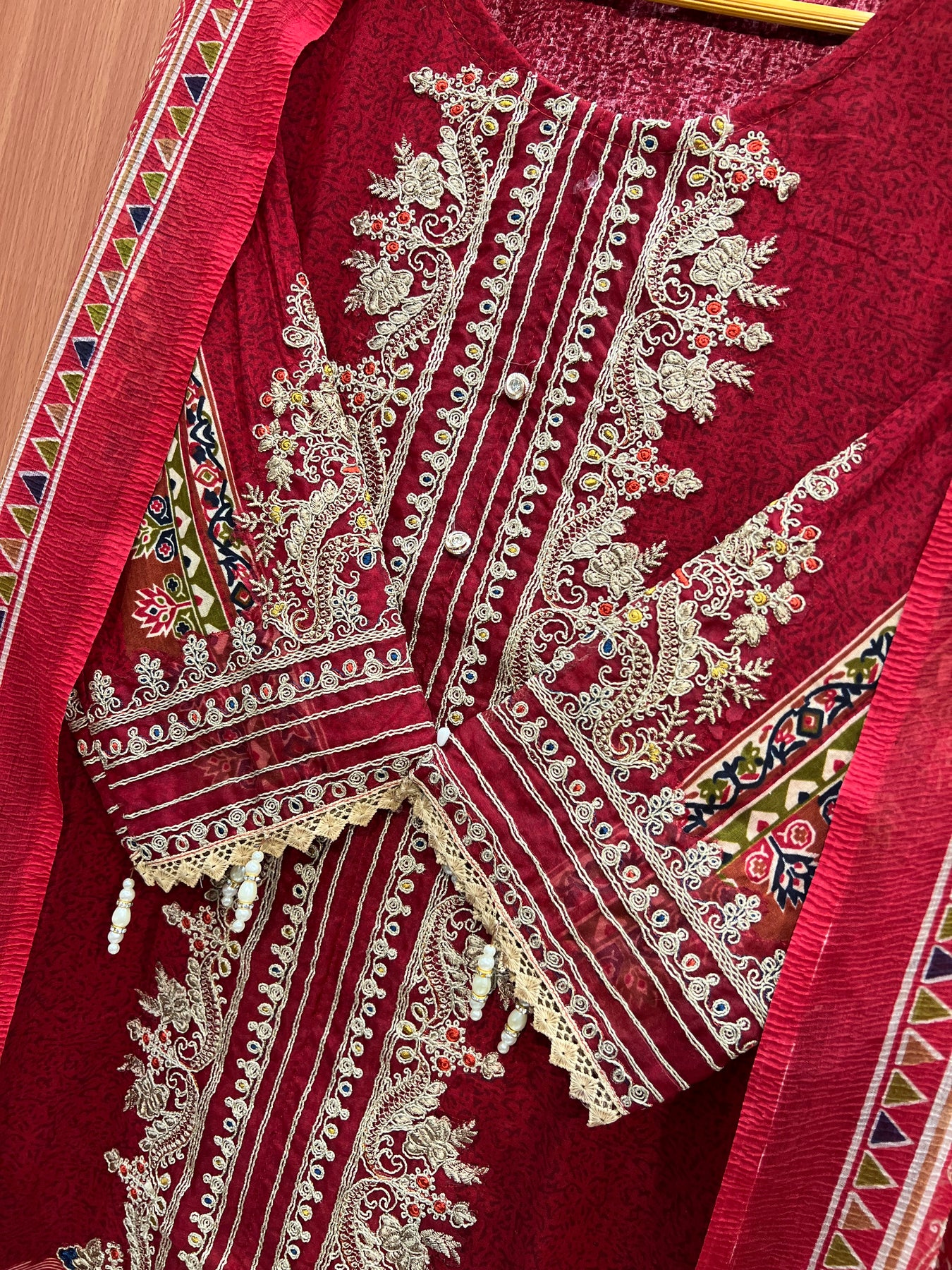 D no :- 2727 This cotton printed top is elevated with detailed lace and patchwork, finished with tassels. Made in Pakistan, this formal piece is a blend of traditional and contemporary design. Expertly crafted, this top is perfect for adding a touch of elegance to any outfit.