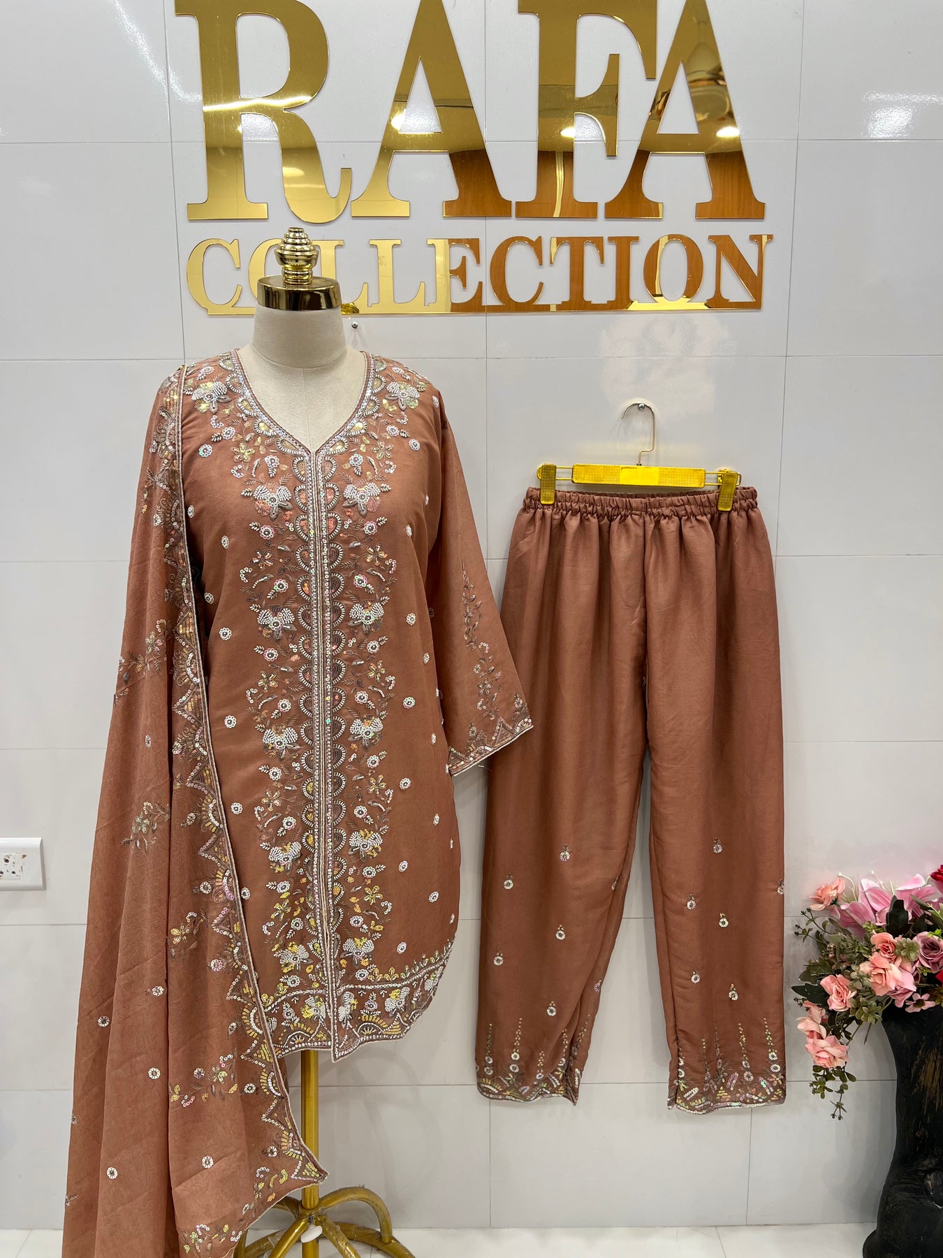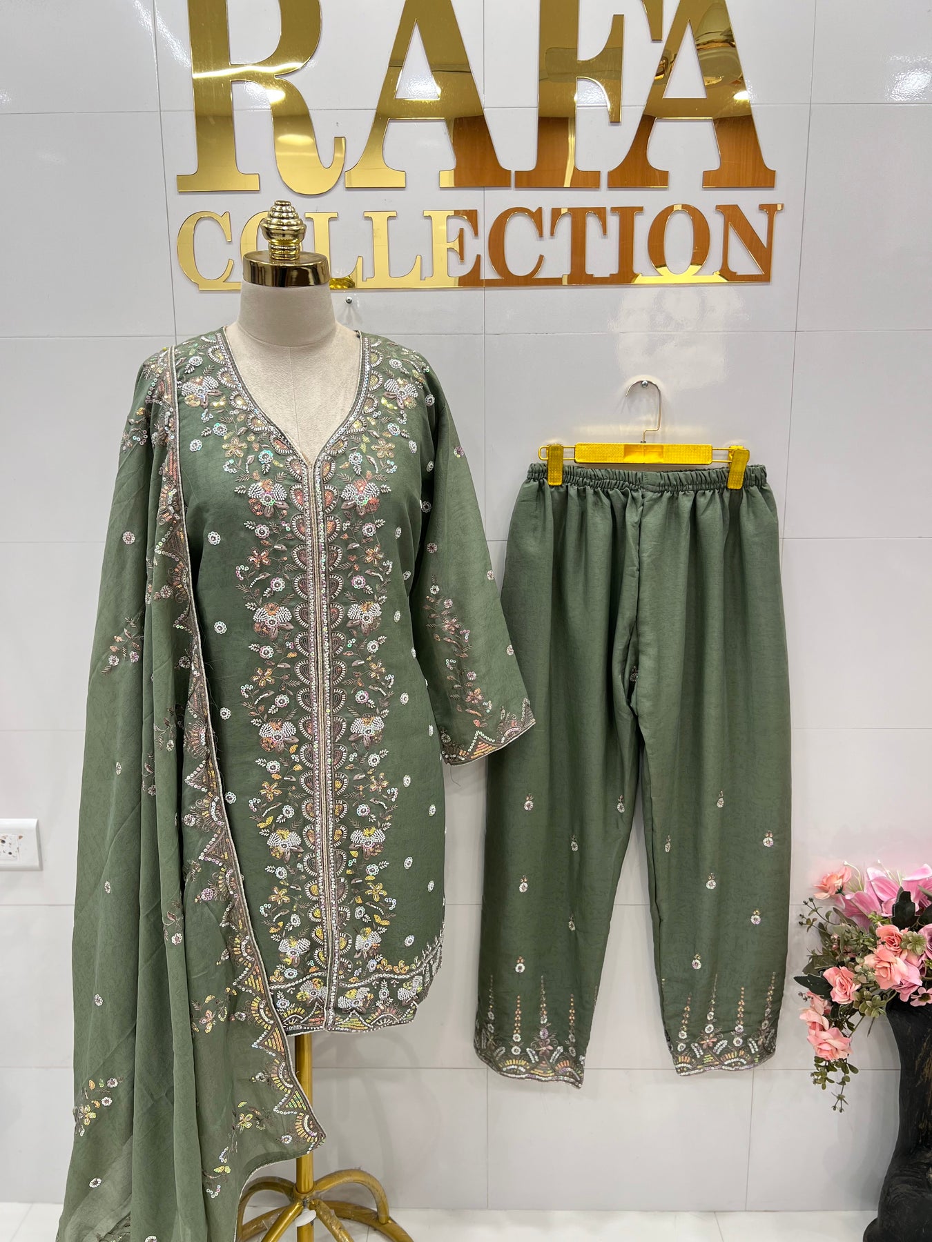 D No:-3120.Crafted from luxurious organza silk, our Pakistani formal suits 3120 feature intricate embroidery and dazzling sequence work. The shantoon inner adds a touch of elegance to these statement pieces, making them perfect for any special occasion. Elevate your style with these stunning and expertly designed suits.