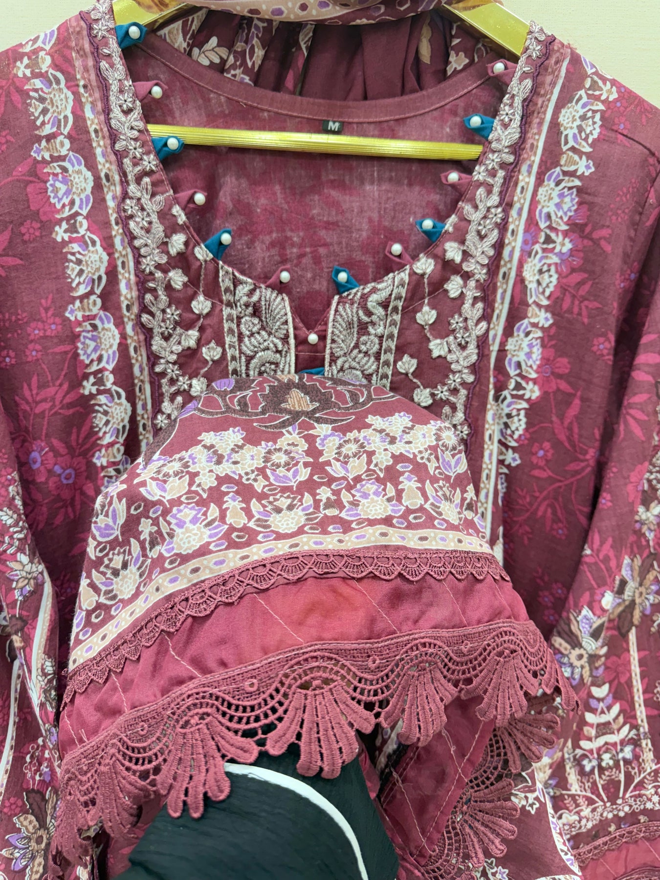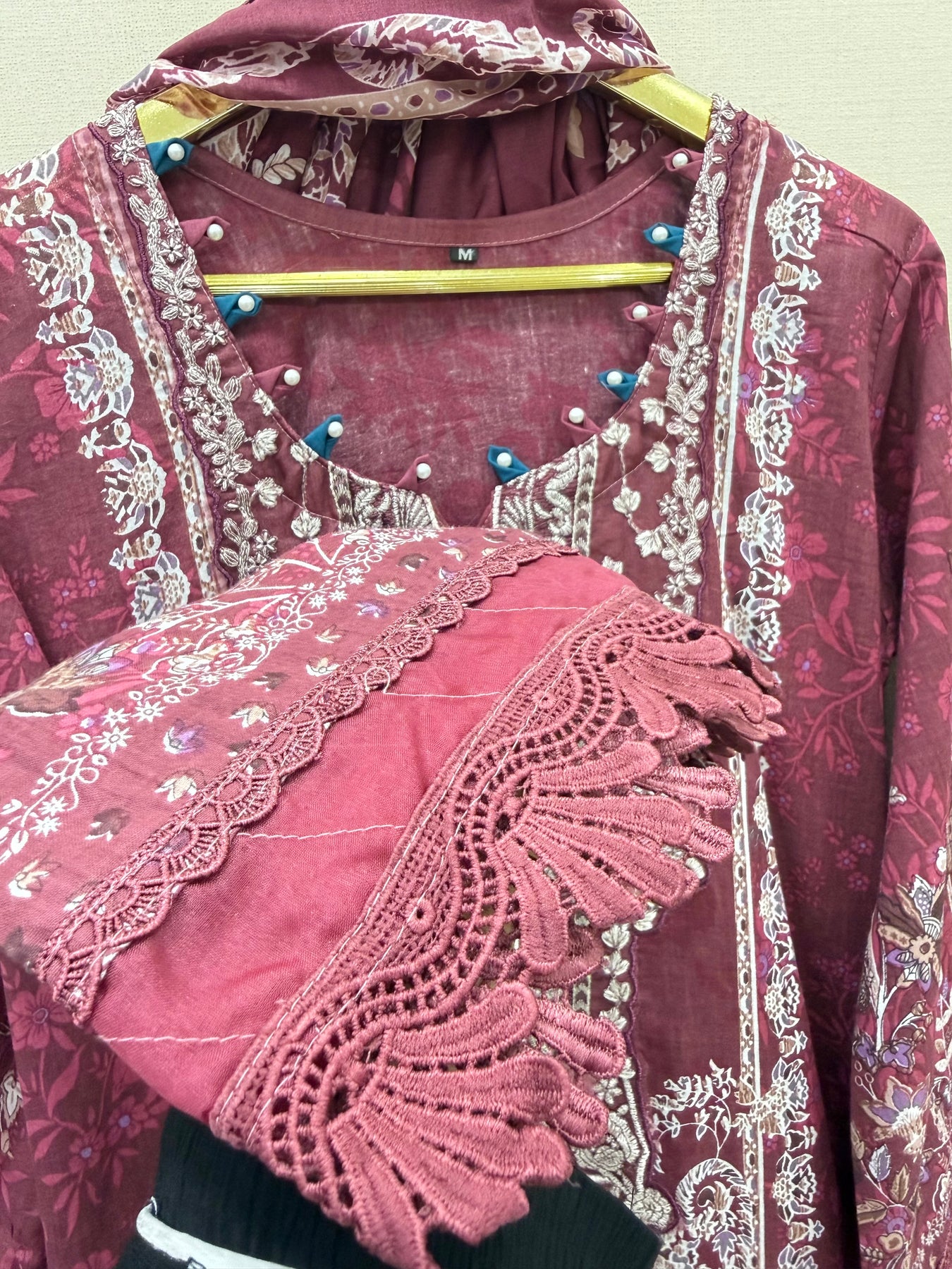 D No:-40014.The Pakistani patch work suit features a cotton printed kurti enhanced with intricate embroidery patches and sophisticated pearl detailing. This combination results in a durable and aesthetically pleasing garment, suitable for various occasions. The breathable cotton fabric ensures comfort, while the decorative elements add a refined touch to traditional attire.