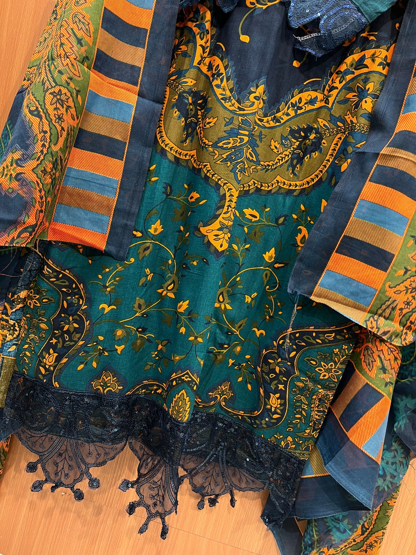 D no :- 2519 "Effortlessly blend style and comfort with our Pakistani patch work suit . Made from high-quality cotton and adorned with vibrant print and elegant lace, this suit is perfect for any occasion. The intricate patch work adds a touch of traditional charm. Get yours today!"