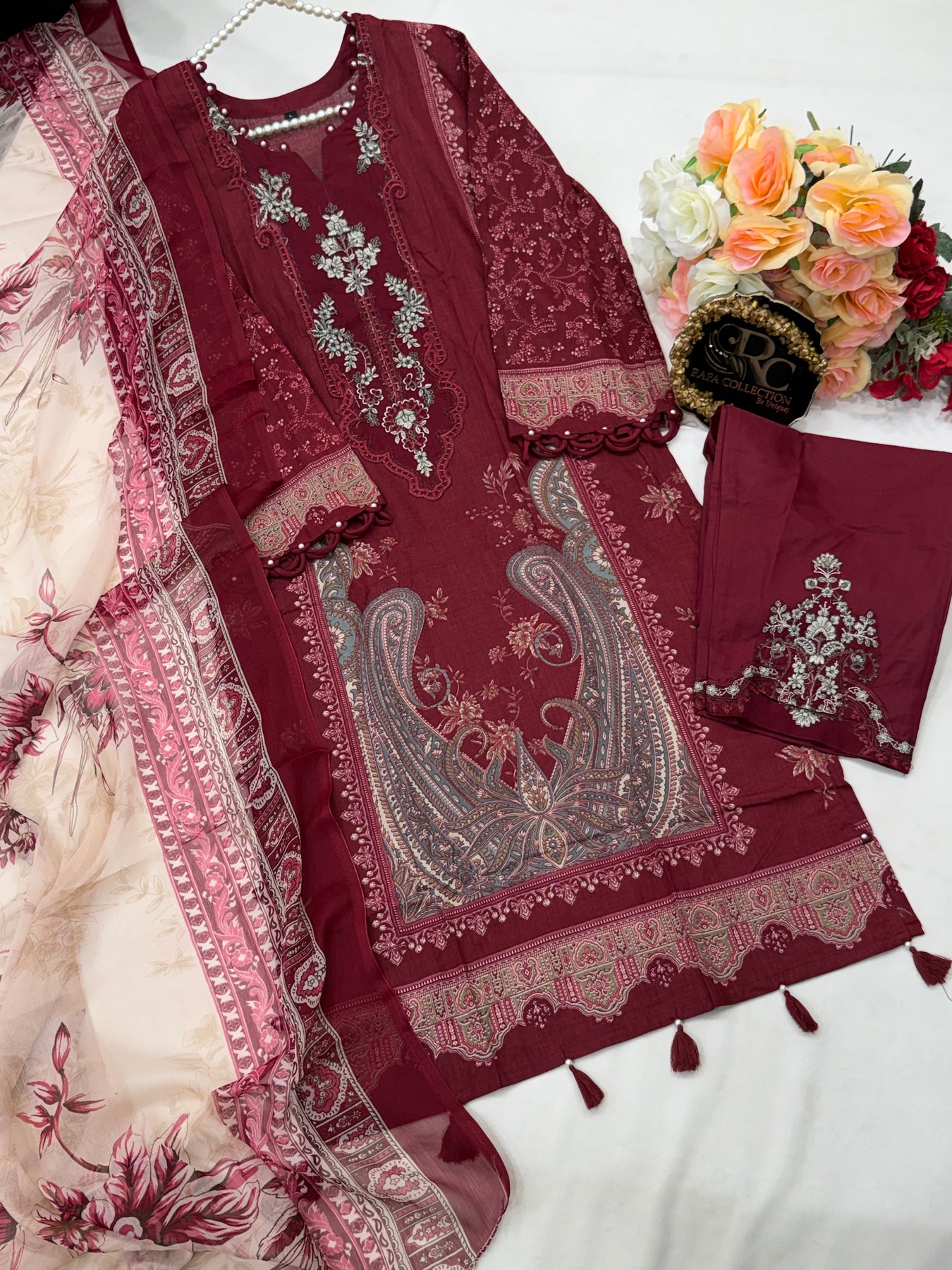 D No:-628.The Pakistani patch work suit features a cotton printed kurti enhanced with intricate embroidery patches and sophisticated pearl detailing. This combination results in a durable and aesthetically pleasing garment, suitable for various occasions. The breathable cotton fabric ensures comfort, while the decorative elements add a refined touch to traditional attire.