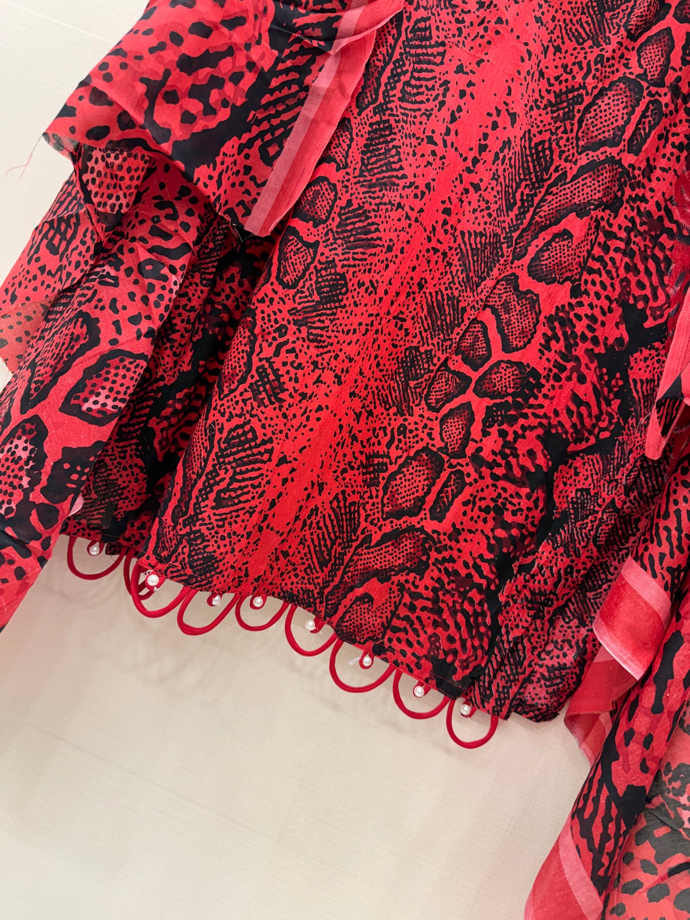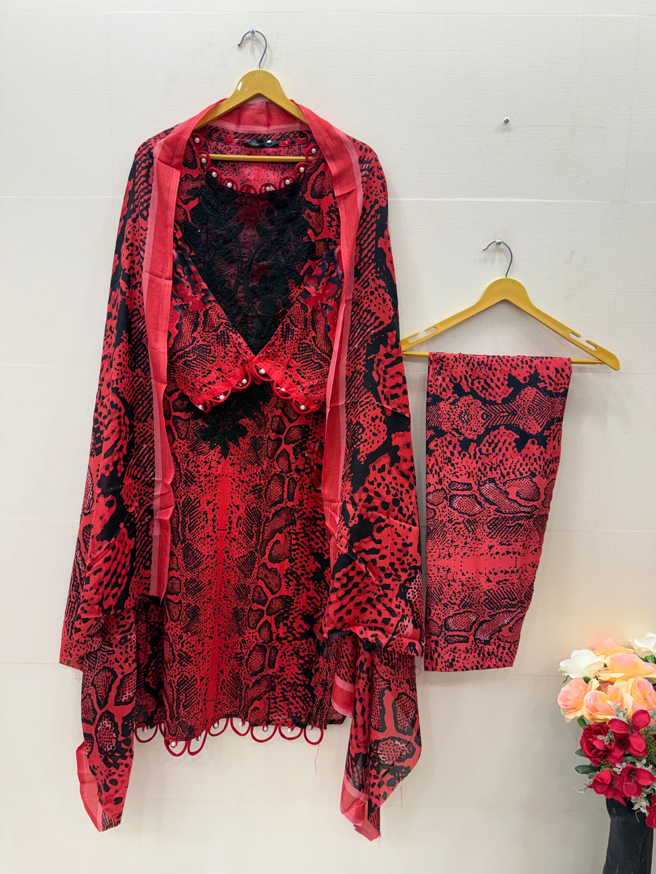 D No:-1075.The Pakistani patch work suits feature a cotton printed kurti enhanced with intricate patch and pearl work. Cotton provides breathability and comfort, while the patch and pearl details add a distinctive aesthetic appeal, making this suit suitable for various occasions and ensuring durability.