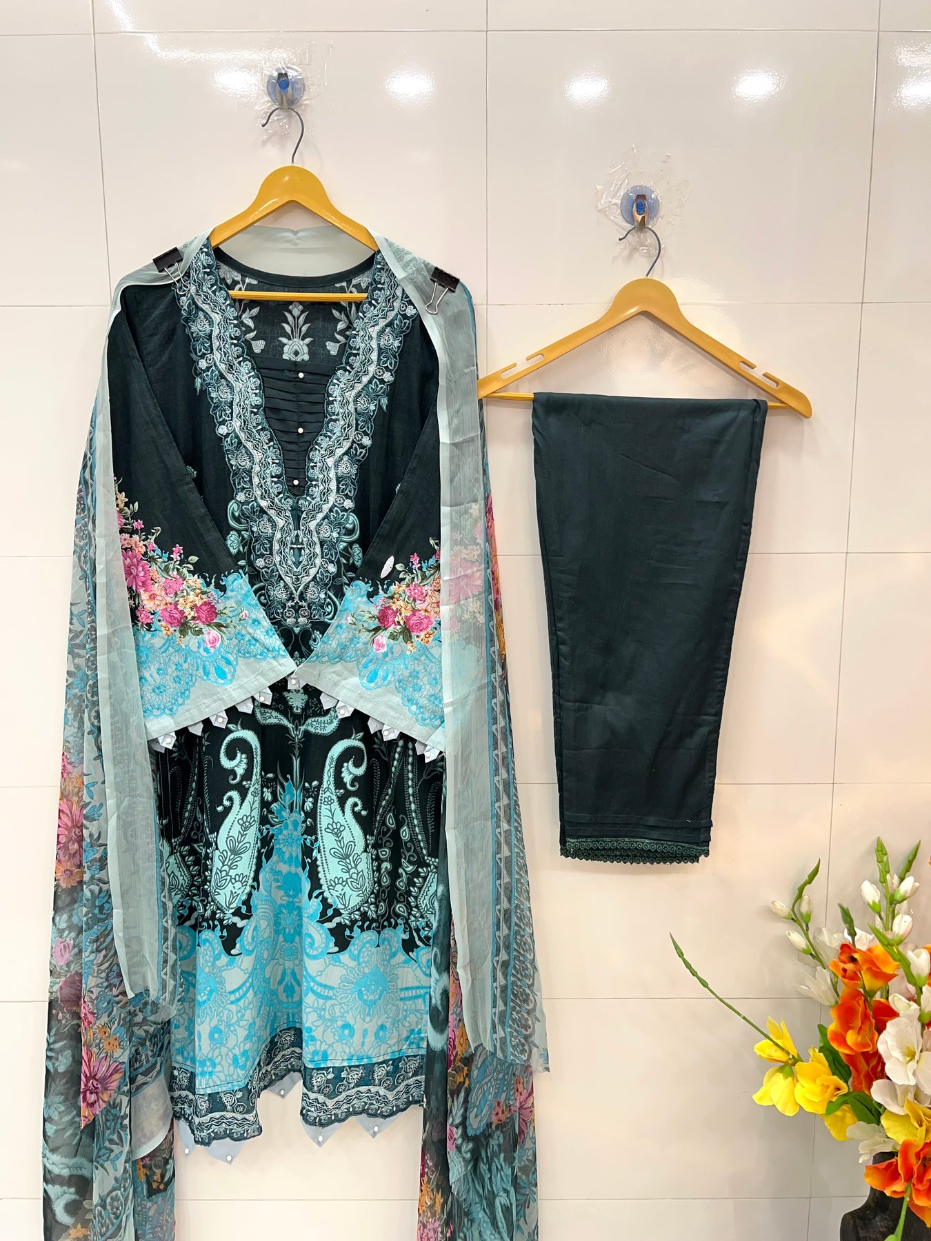 D.no :- This Pakistani formal is perfect for any special occasion. Made from high-quality cotton, the top features intricate embroidery and patchwork, complemented by tassels for a touch of elegance. The unique printed design adds a touch of traditional charm. Make a statement with this stylish and comfortable formal piece.