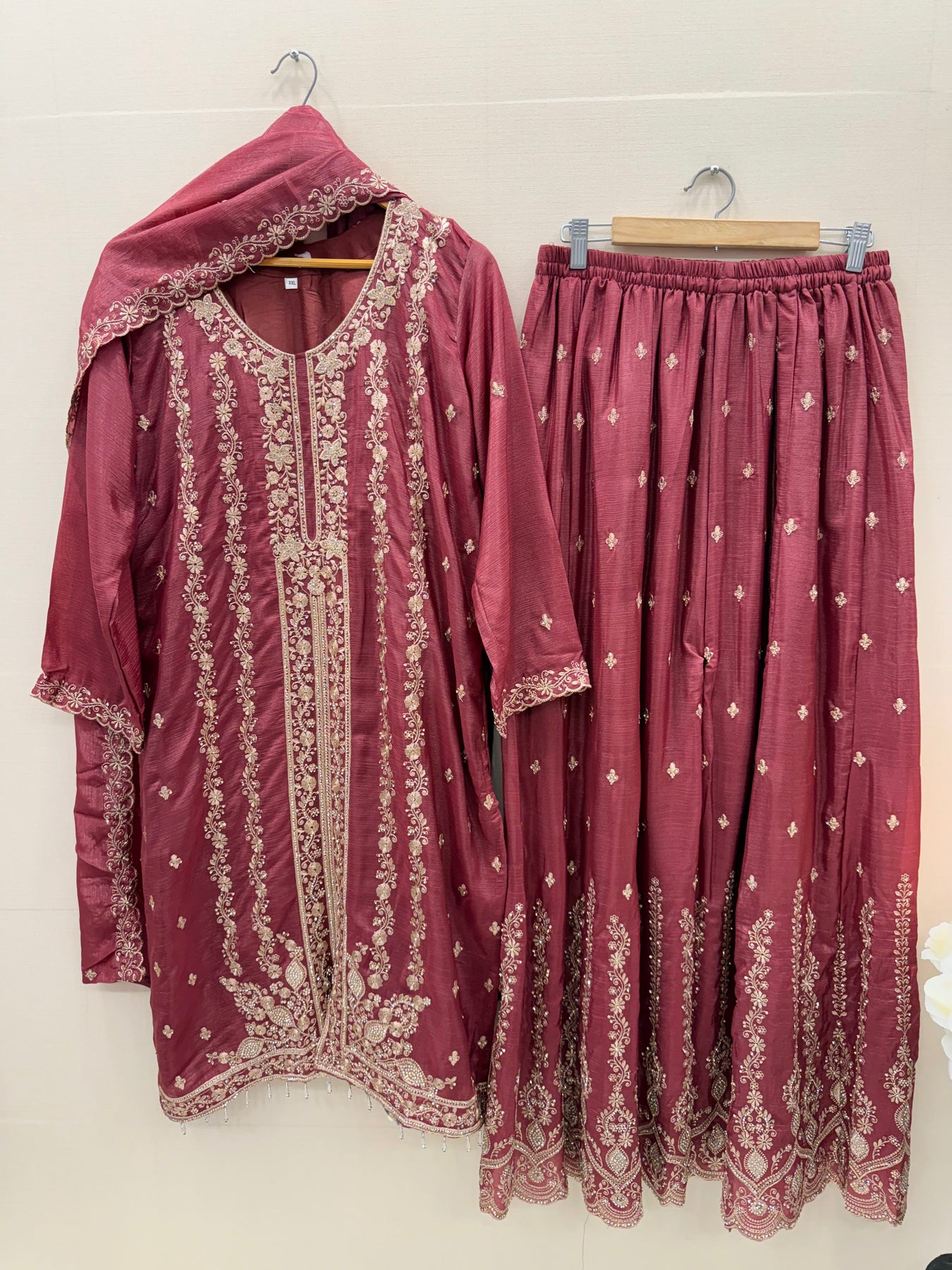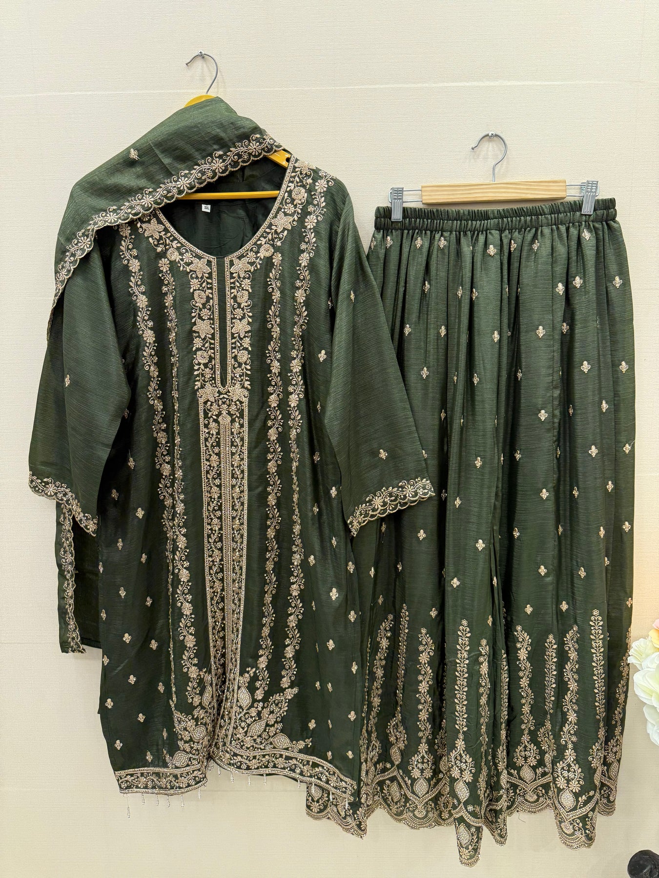 D No:-1296733.The Party Wear Suits feature a chinon kurti enhanced with embroidered stones and tassels. The use of chinon fabric ensures a lightweight and breathable experience, while the intricate embellishments add a touch of sophistication. This combination promotes elegance, making it suitable for formal occasions or celebrations.