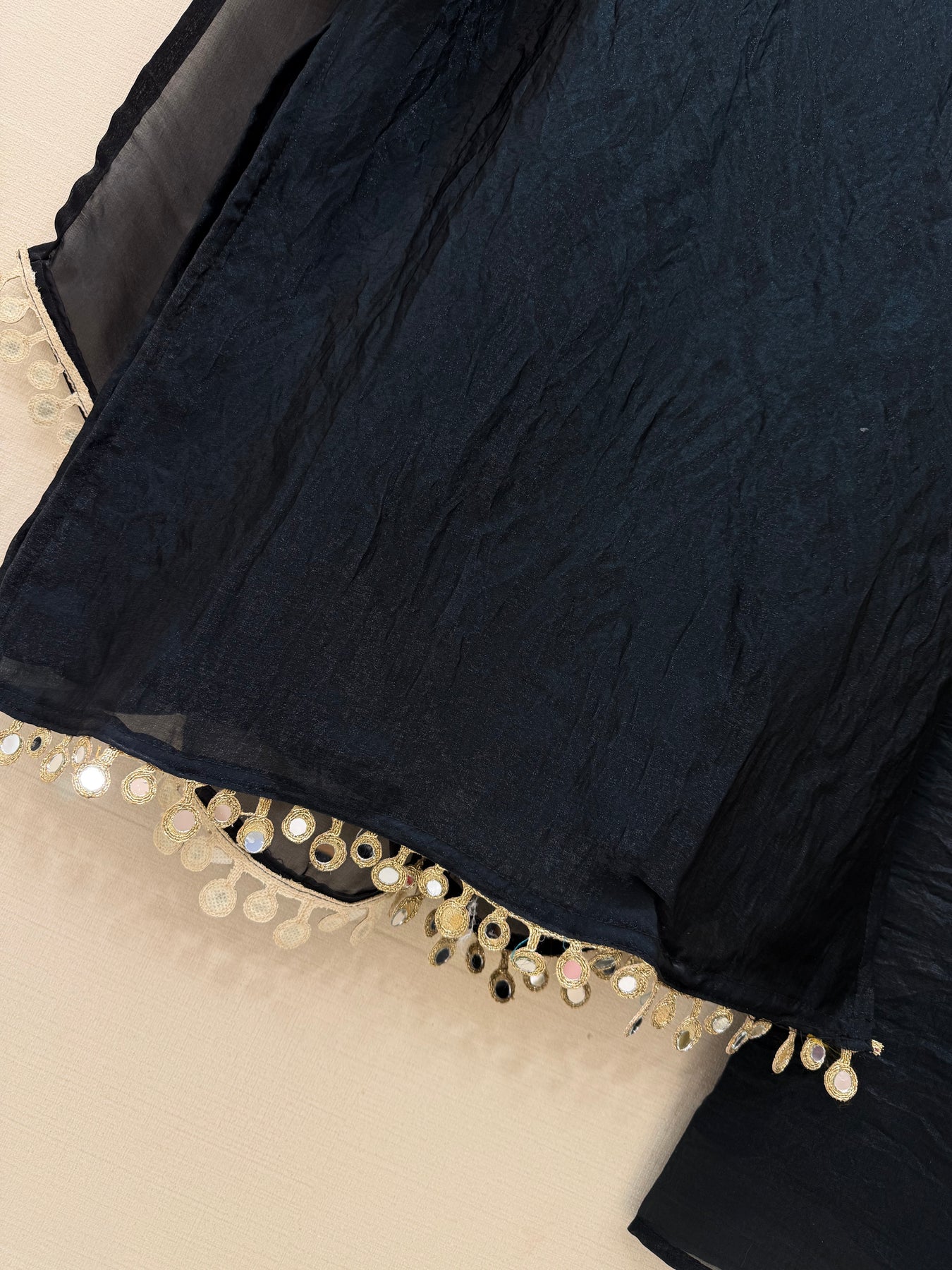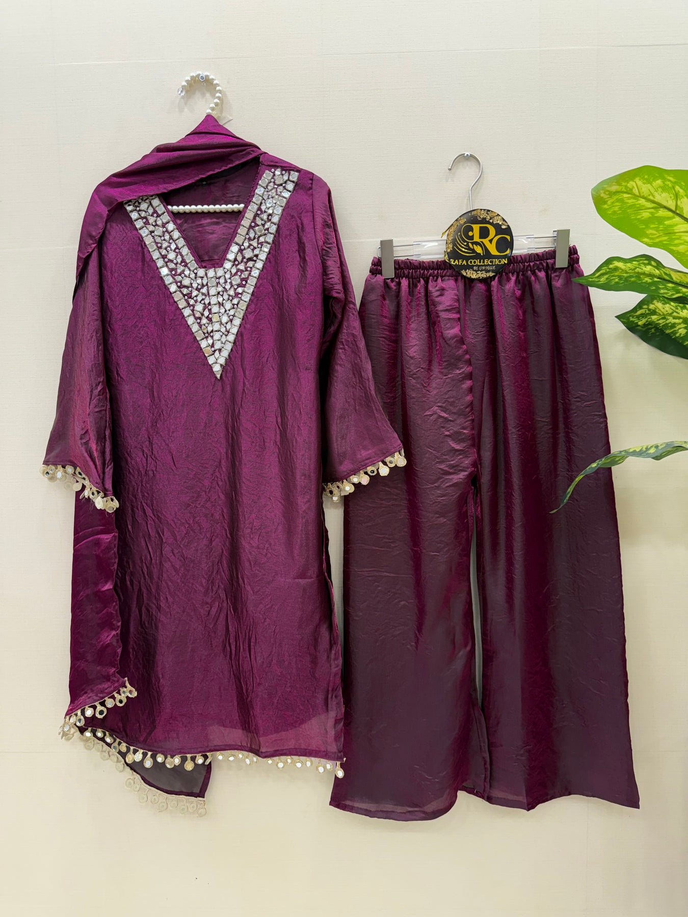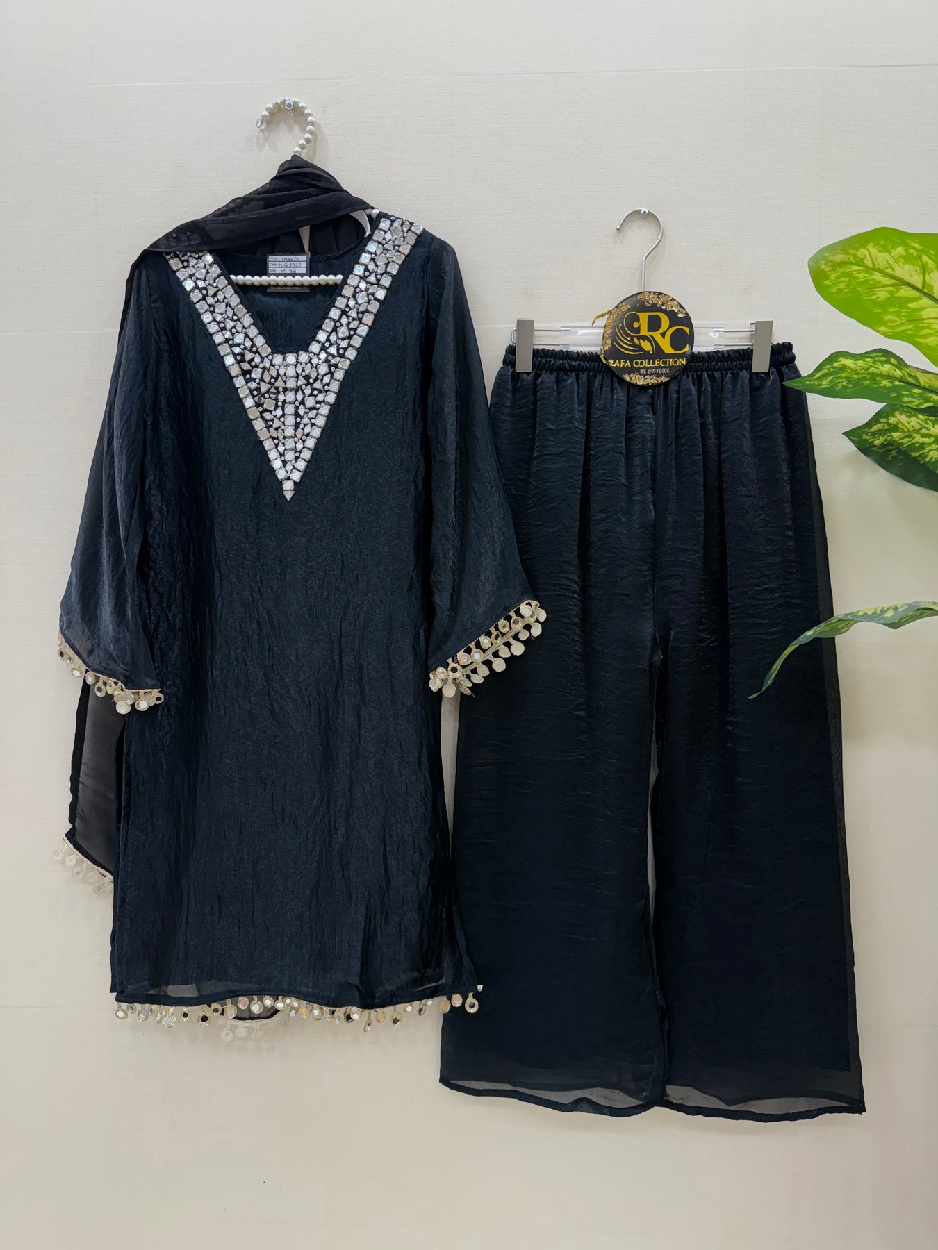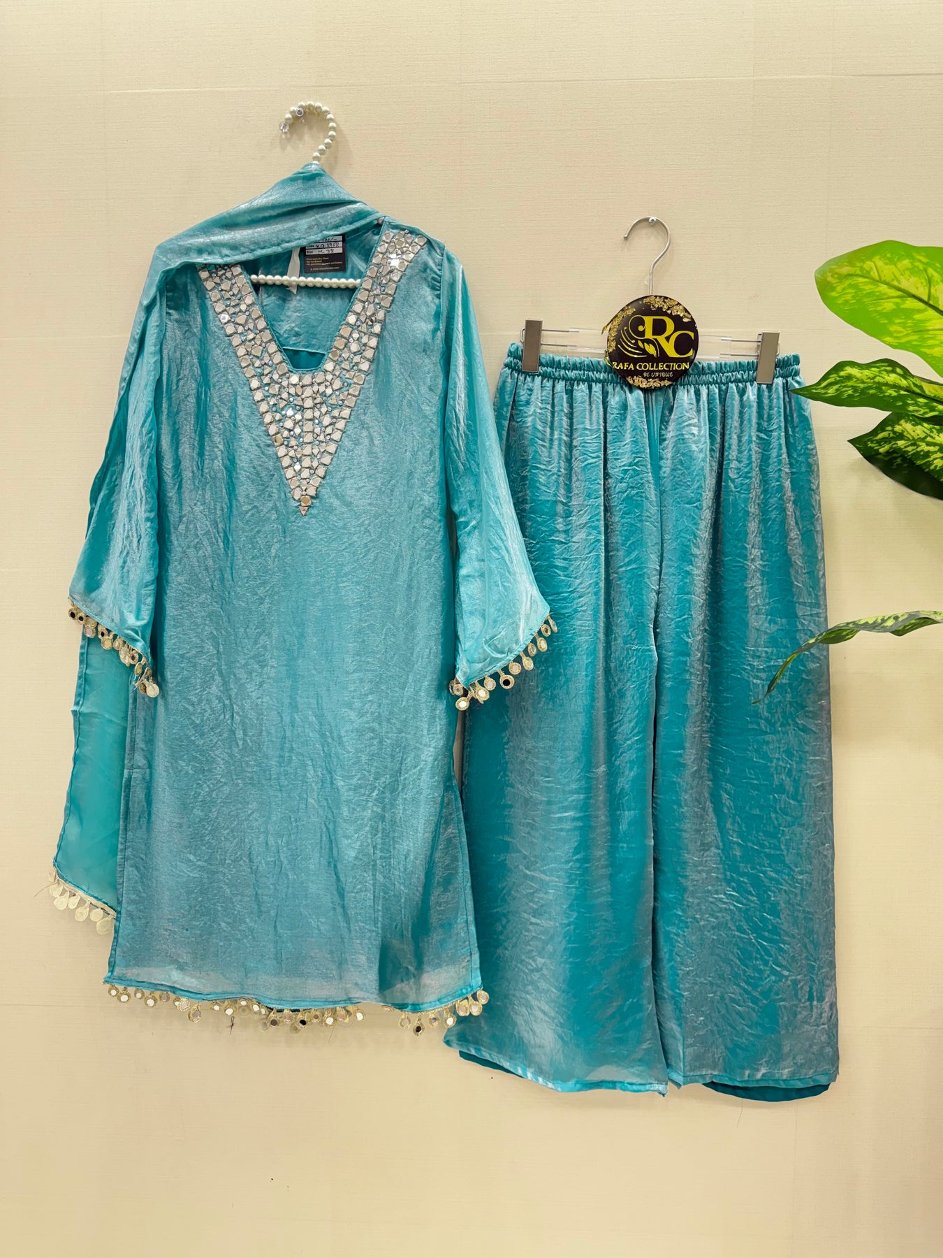 D No:-2968.The Shimmer Organza Suits features a kurti crafted from high-quality organza fabric, enhanced with intricate mirror work. This combination not only elevates the garment's aesthetic appeal but also reflects light for a subtle shimmer effect, making it suitable for formal occasions and gatherings.