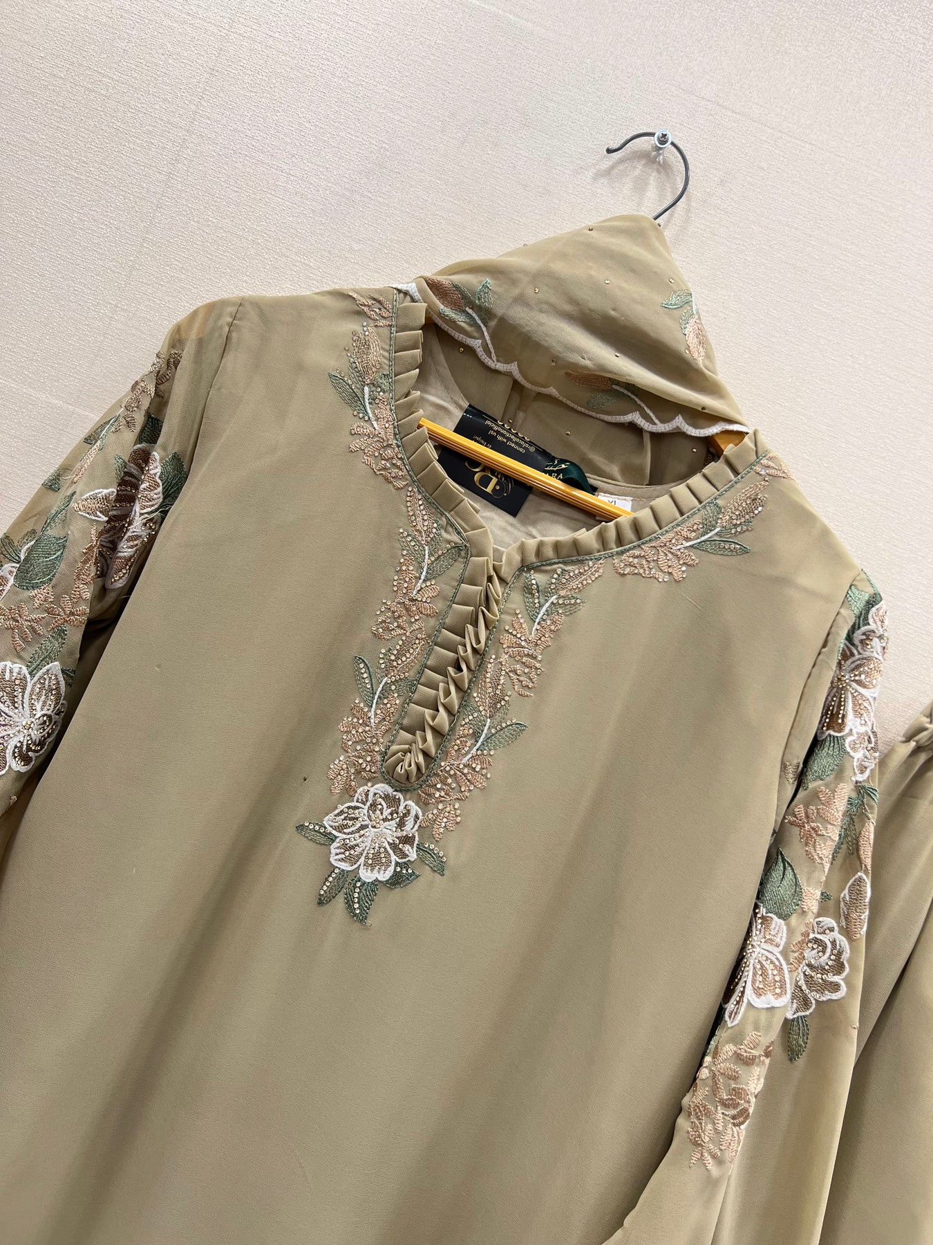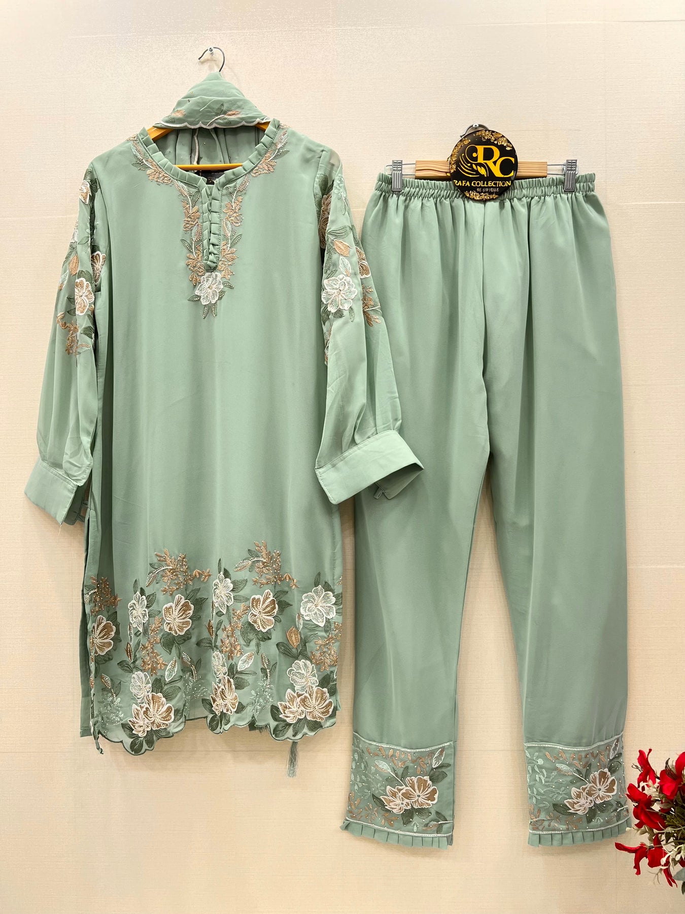 D No:-3142.The Pakistani Formal Suits features a georgette kurti enhanced with intricate embroidery and stone work. This combination provides both durability and an elegant aesthetic, ensuring a sophisticated appearance suitable for formal occasions. The use of high-quality materials guarantees comfort while maintaining a polished look.