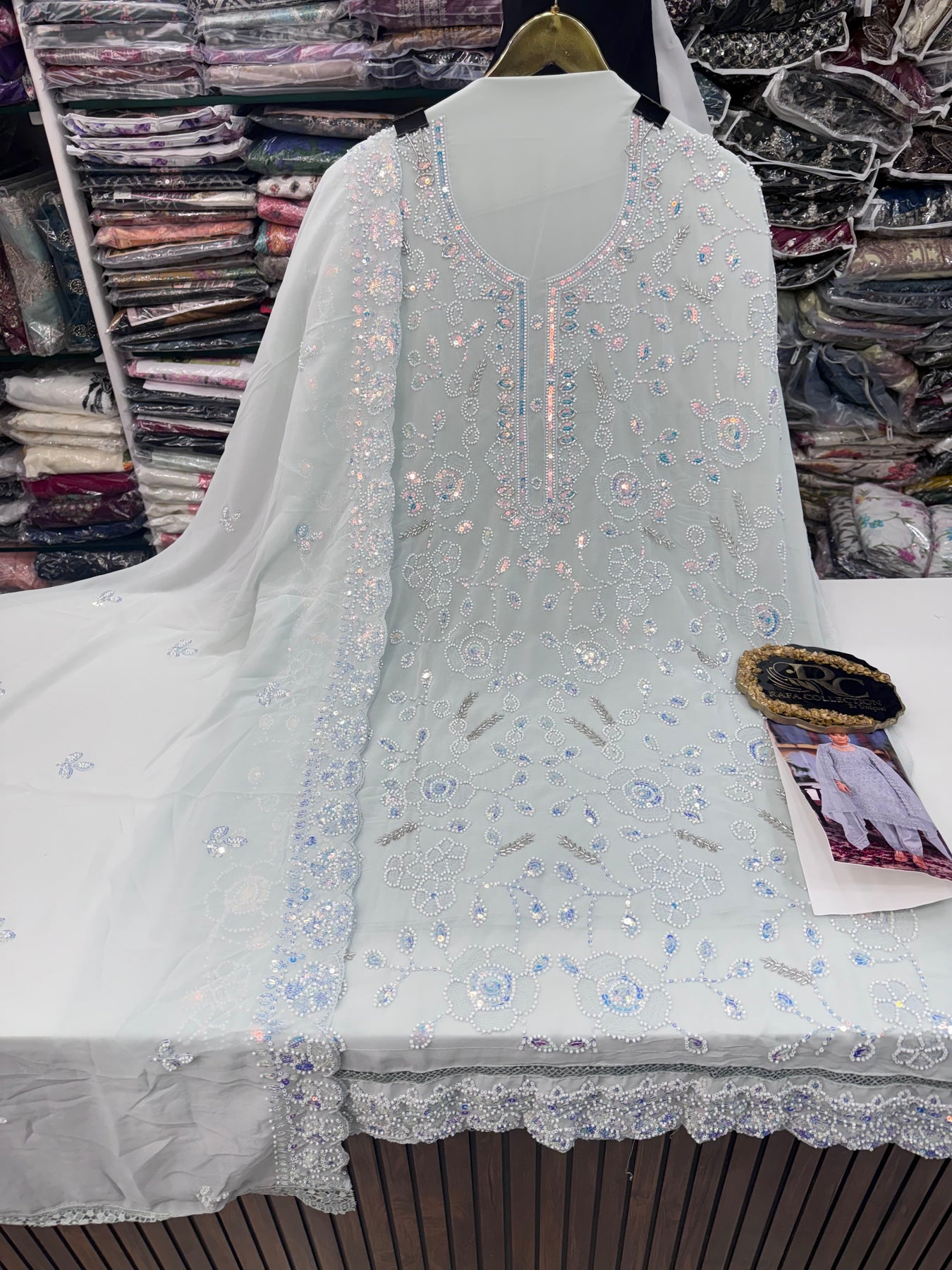 D No:-12968.The Handwork EID Special features a heavy Georgette kurti adorned with intricate embroidery and handwork. This design ensures a luxurious feel and visual appeal, making it suitable for formal celebrations. The combination of high-quality fabric and detailed craftsmanship offers durability and timeless elegance.