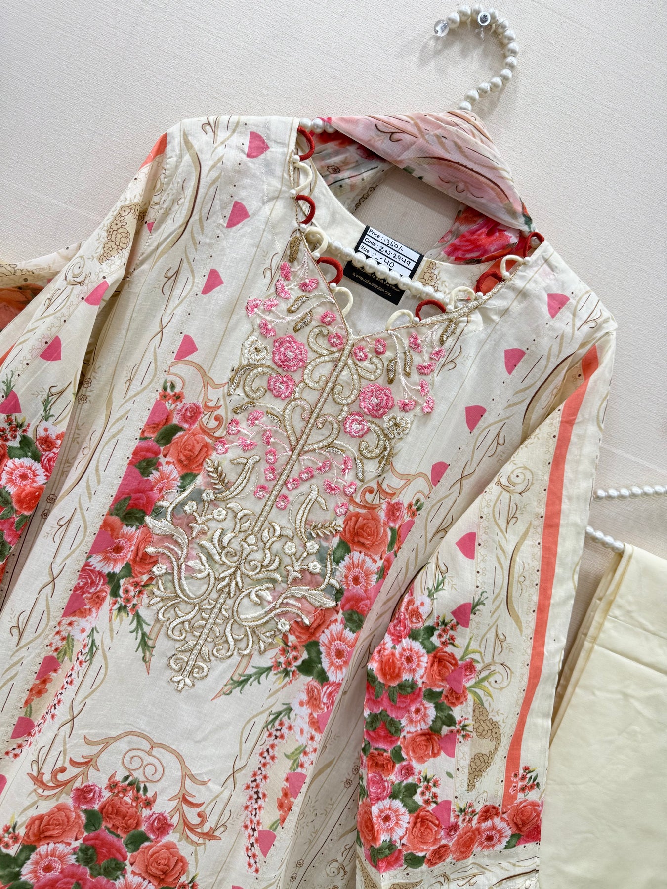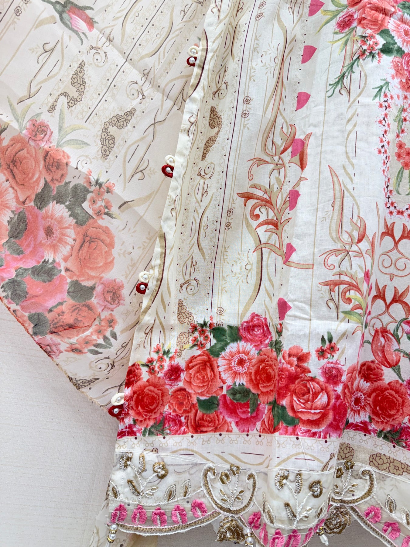 D No:-2949.The Pakistani patch work suit features a cotton printed kurti enhanced with intricate embroidery patches and sophisticated pearl detailing. This combination results in a durable and aesthetically pleasing garment, suitable for various occasions. The breathable cotton fabric ensures comfort, while the decorative elements add a refined touch to traditional attire.