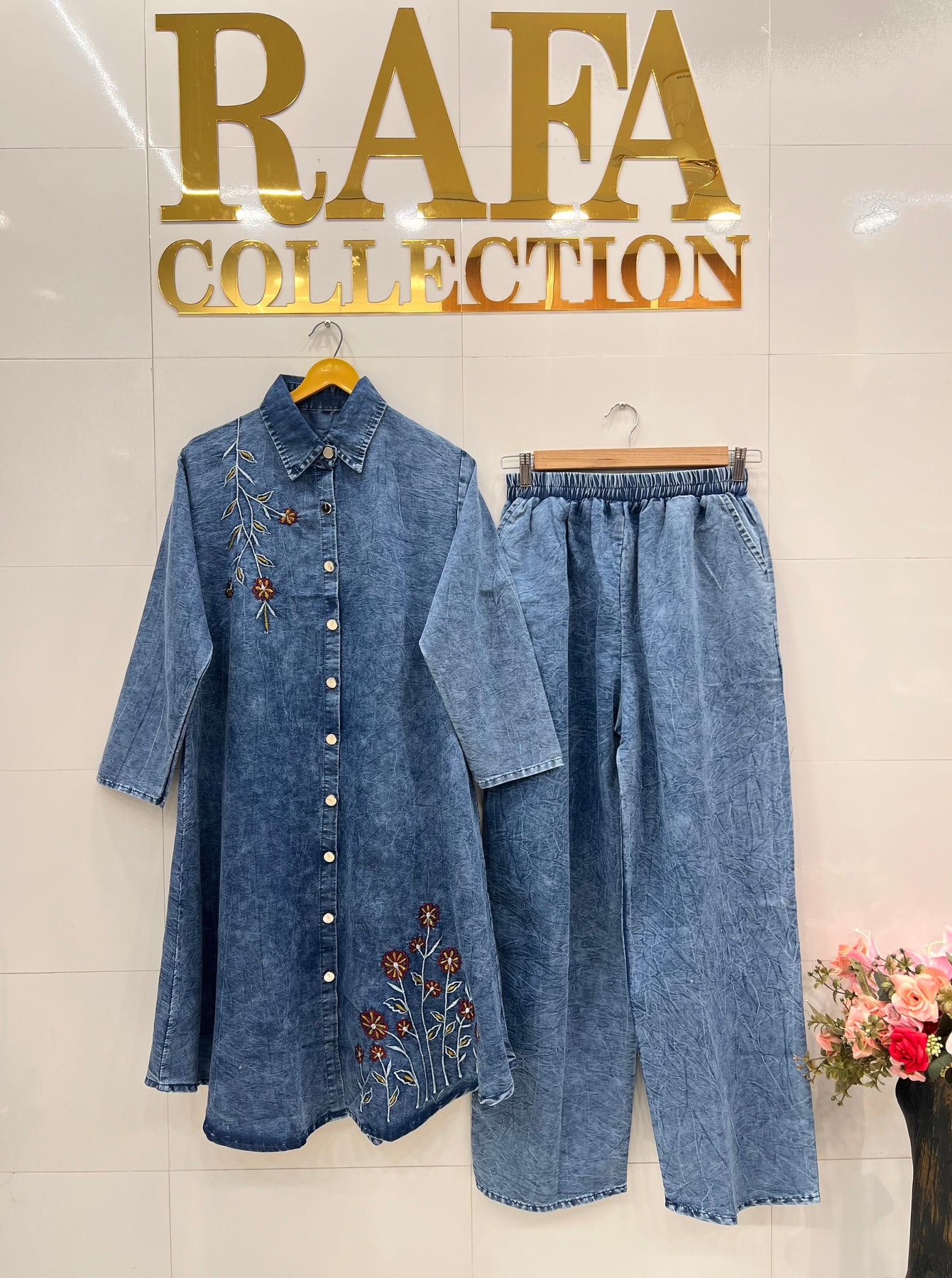 D No:-2873."Enhance your casual wardrobe with our Denim Co-ord Set 2873. Made with high-quality denim, this set features a beautifully embroidered top that adds a touch of elegance to your look. Elevate your style game with this versatile and trendy set."