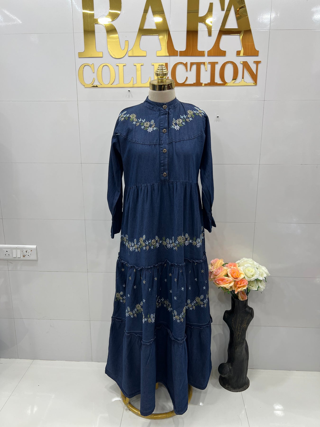 D No:-2888.This Denim Long Gown 2888 features a beautifully embroidered denim top, adding a touch of elegance to a classic denim fabric. Perfect for any occasion, this gown offers a stylish and chic look with its unique design. Elevate your wardrobe with this must-have piece.