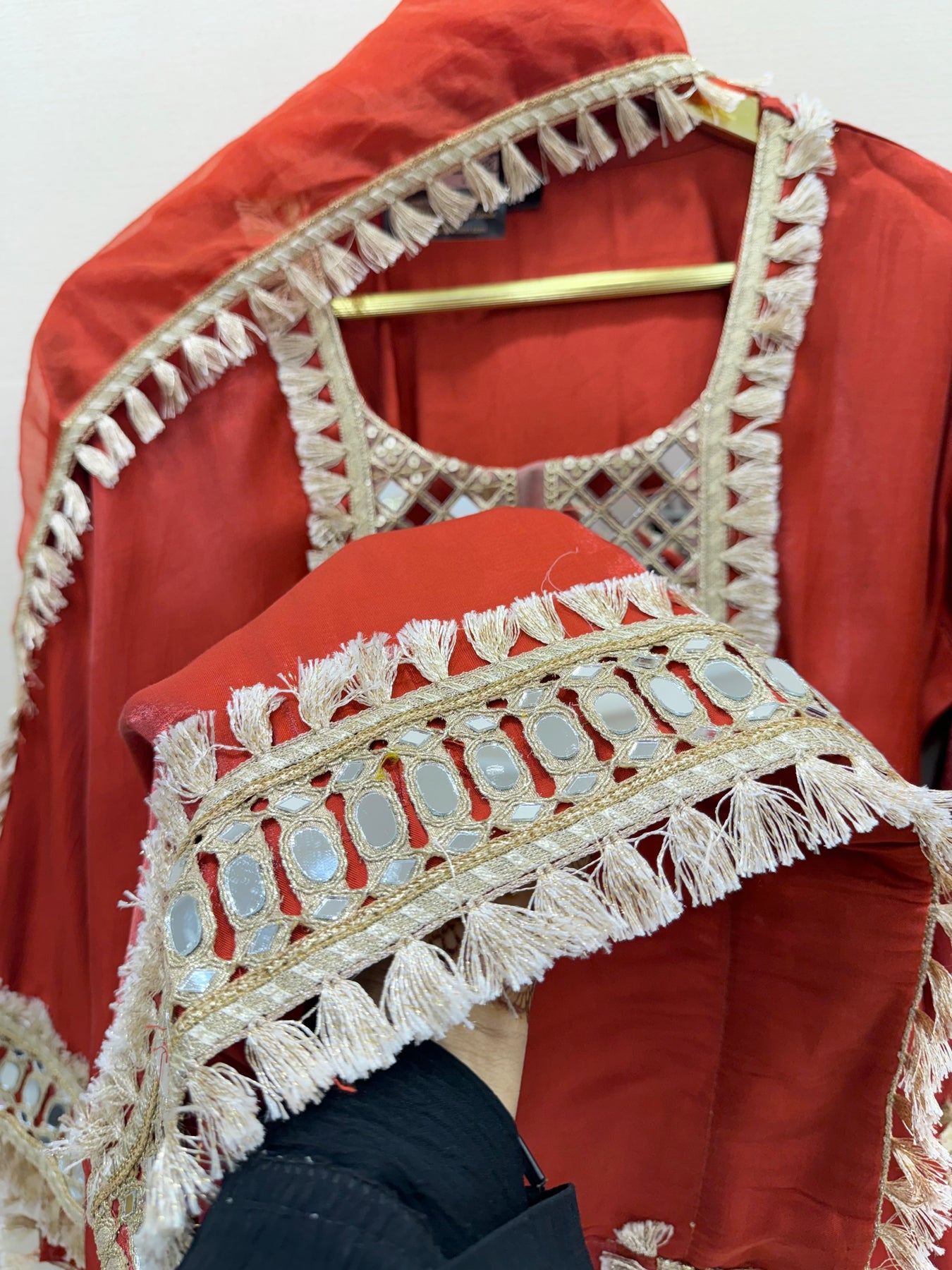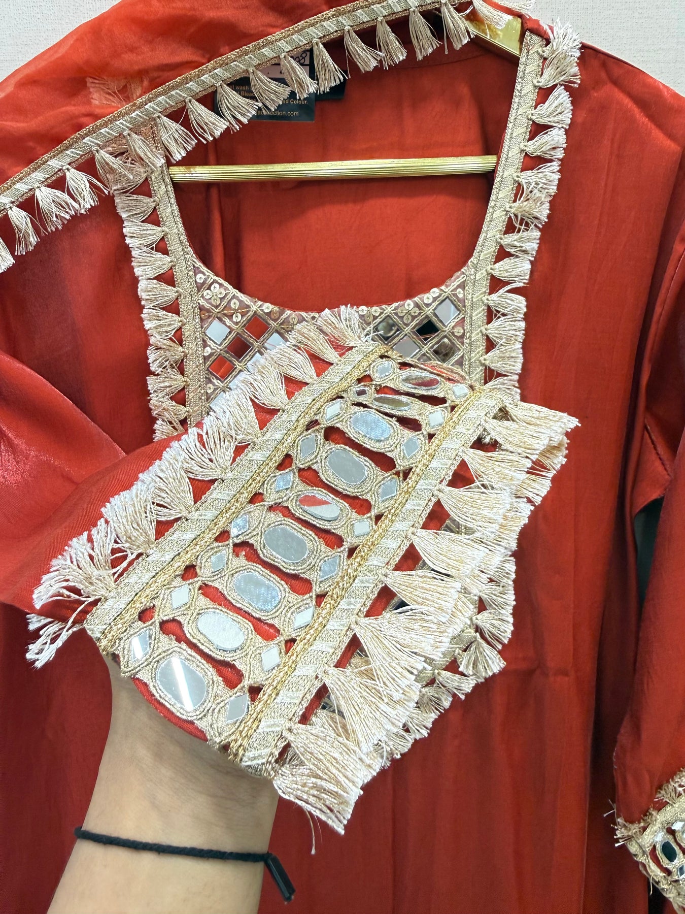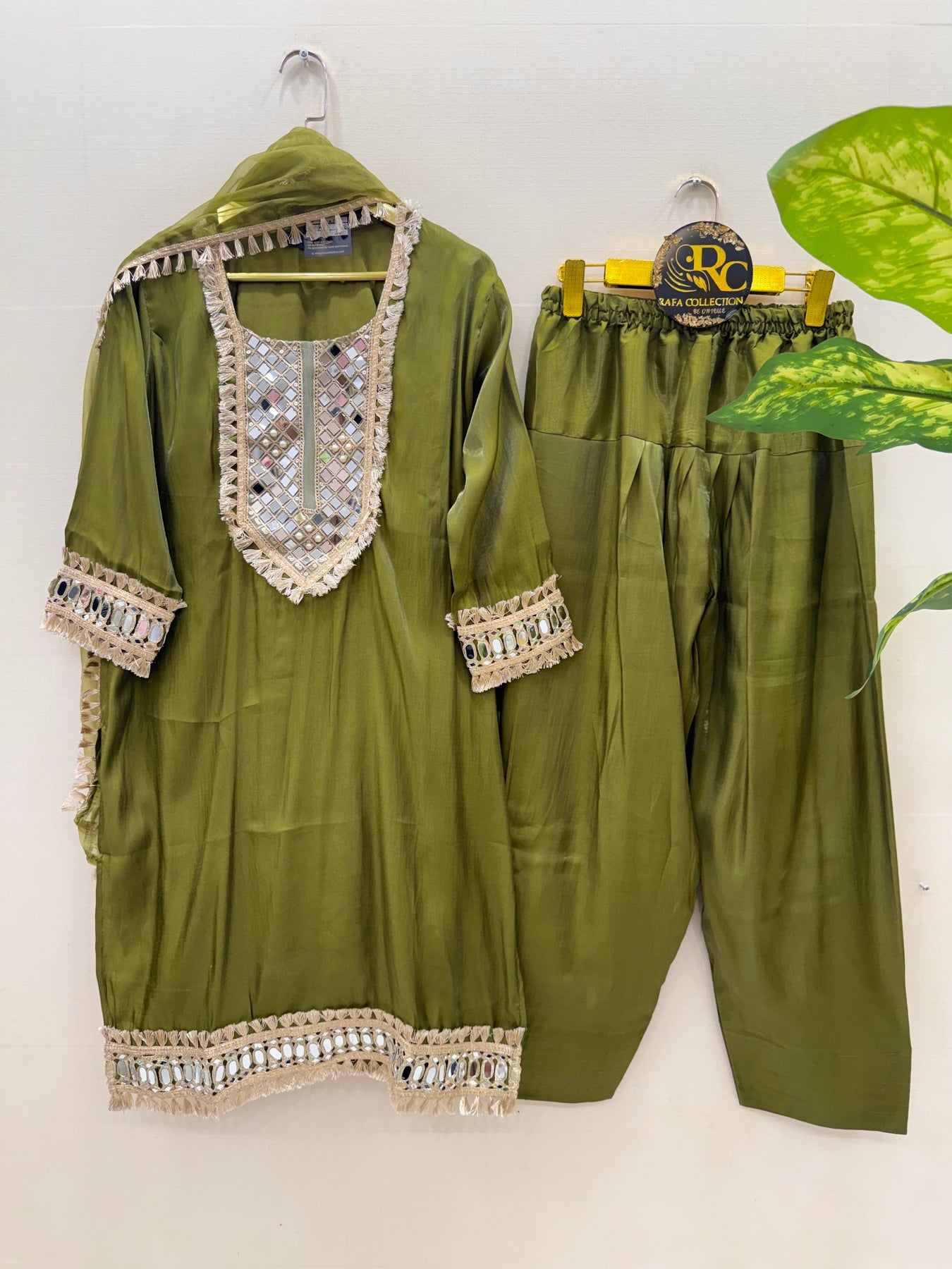 D No:-7008.The is a shimmer satin kurti, featuring intricate lace and mirror work. The combination of materials enhances durability and elegance, making it suitable for formal events. The reflective elements contribute to visual interest, while the fabric's sheen ensures a sophisticated appearance, promoting versatility in styling.