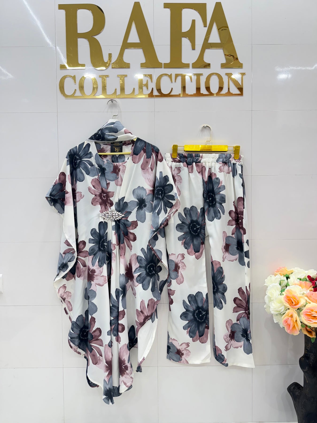 D No:-2871.Experience luxurious comfort and style with our imported kaftan co-ord set 3165. Made with printed long kaftans and a stunning brooch, this set is perfect for any occasion. Elevate your wardrobe with this elegant and eye-catching ensemble.