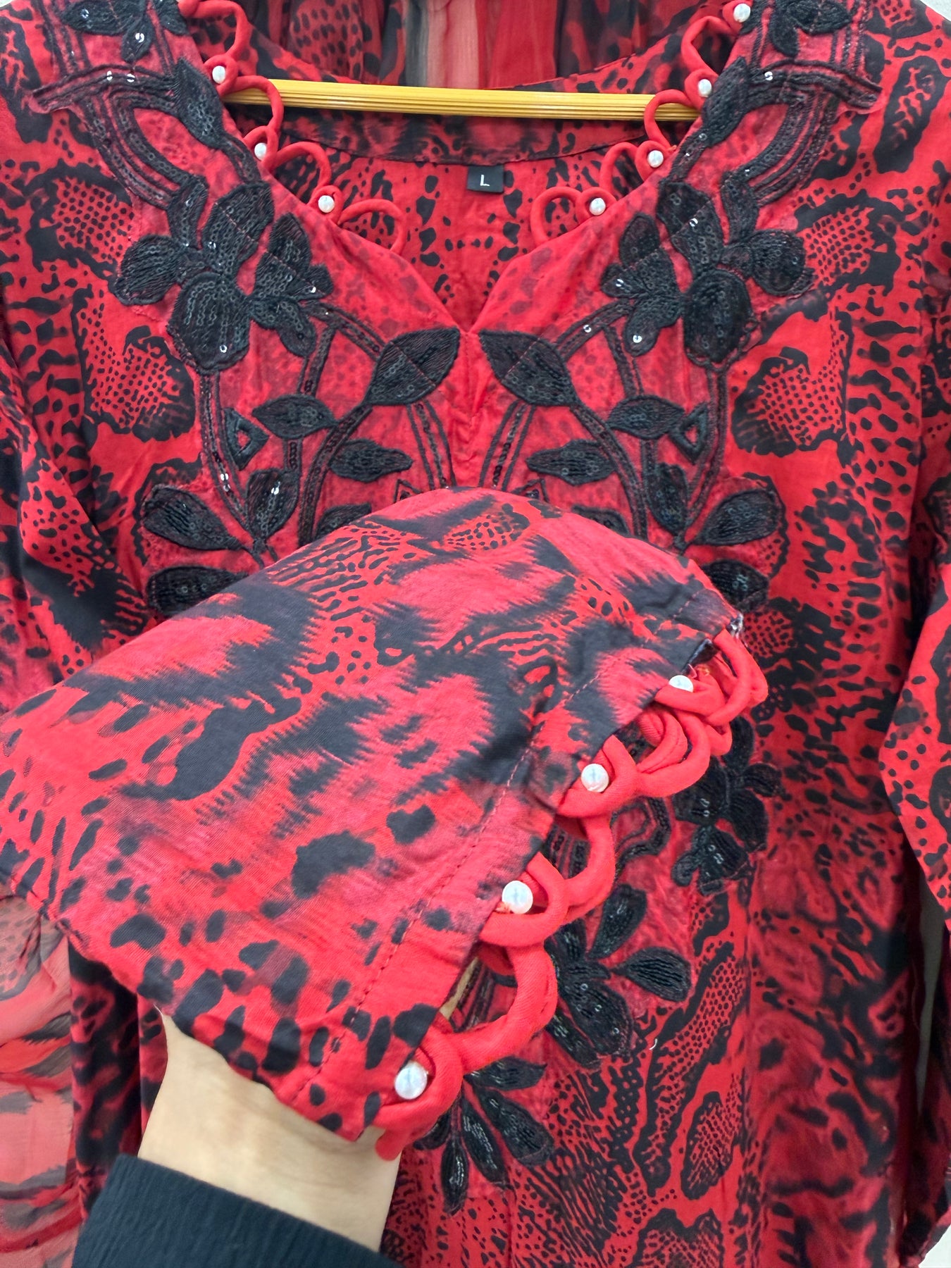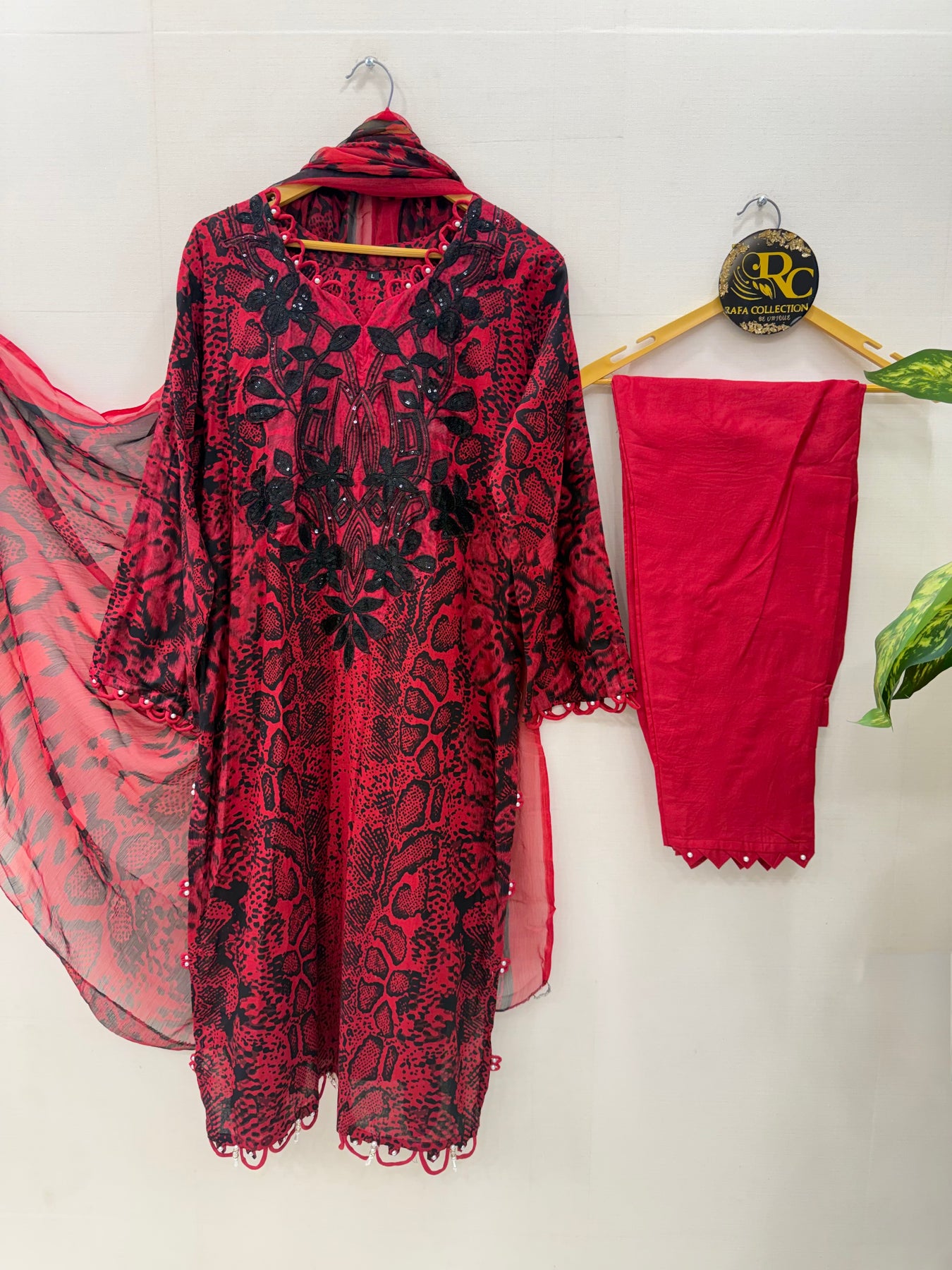 D No:-9071.The Pakistani patch work suits feature a cotton printed kurti enhanced with intricate patch and pearl work. Cotton provides breathability and comfort, while the patch and pearl details add a distinctive aesthetic appeal, making this suit suitable for various occasions and ensuring durability.