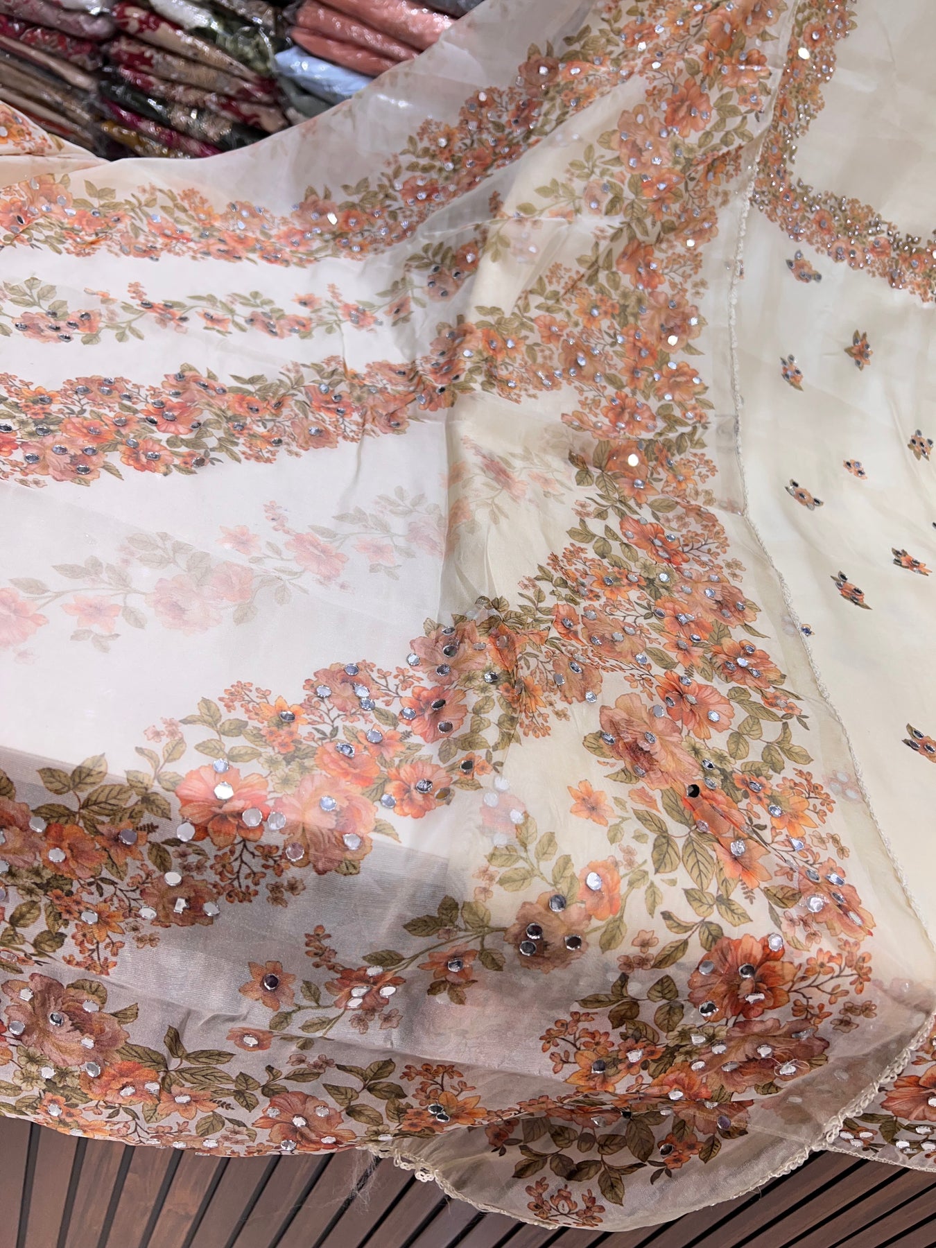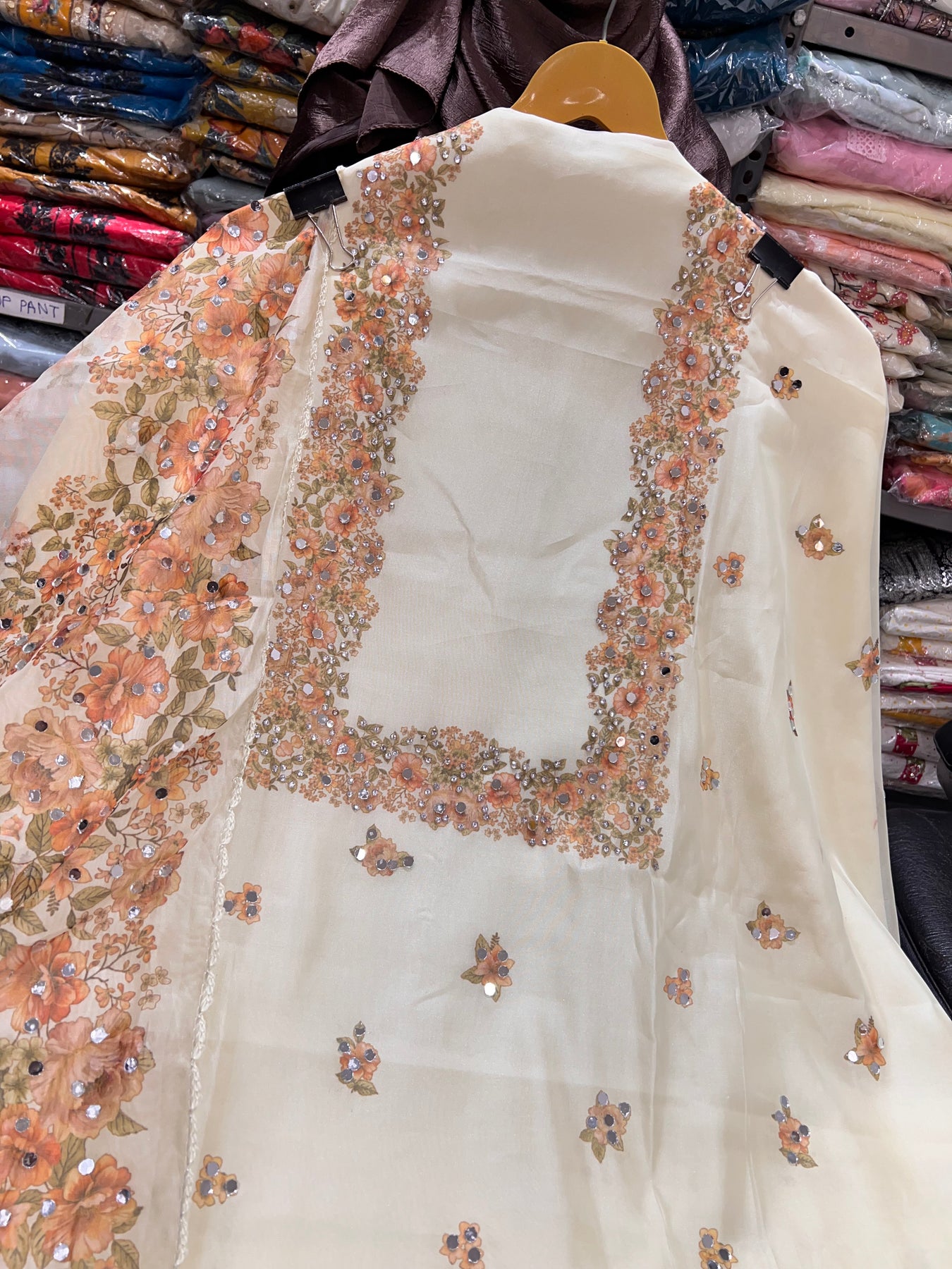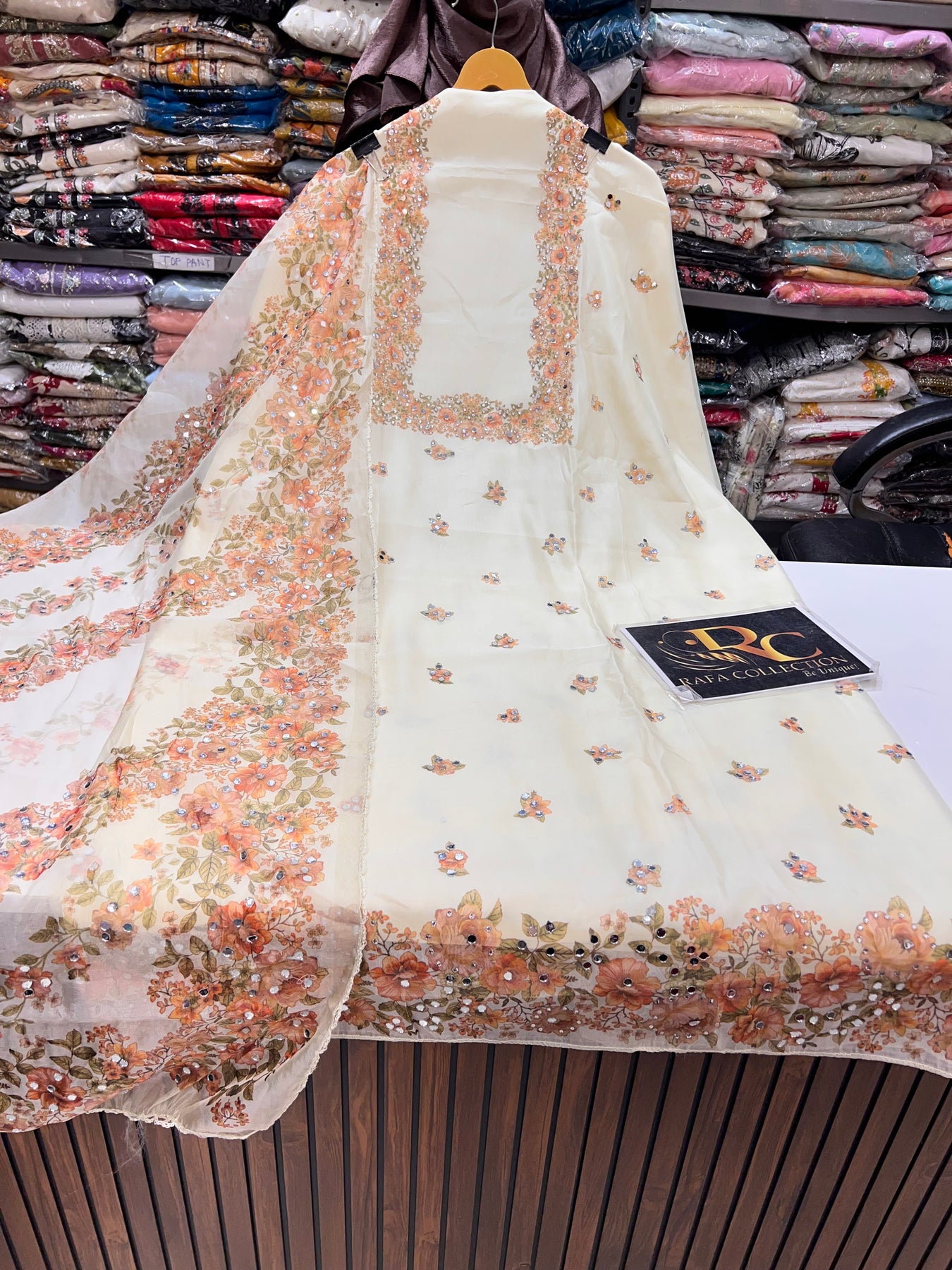 D.No:-1930. This pure organza unstitched suit features intricate mirror and stone work, adding a touch of elegance to any outfit. The multi-color design lends versatility, allowing you to mix and match with different outfits. Elevate any look with this expertly crafted and stylish dupatta.