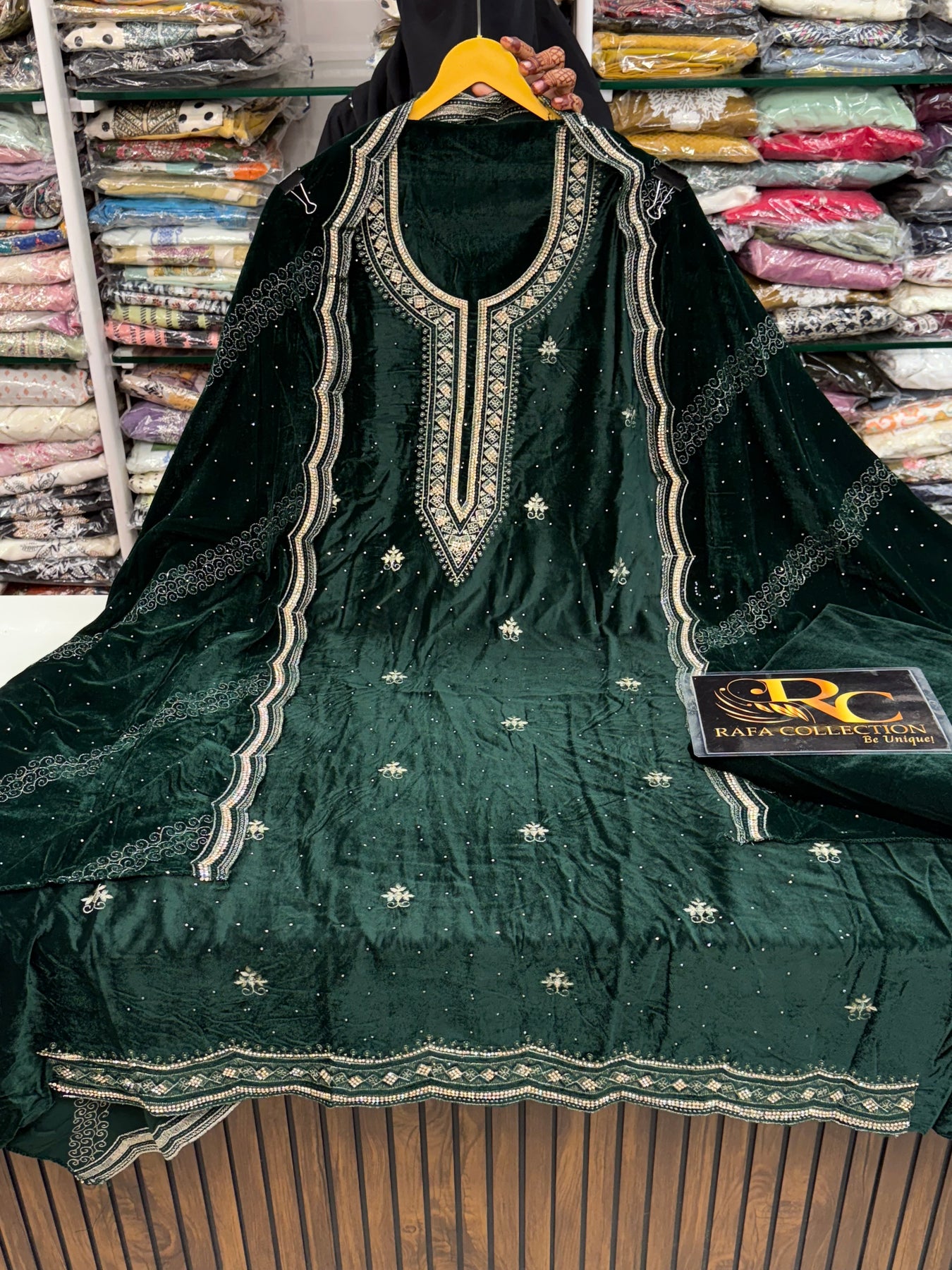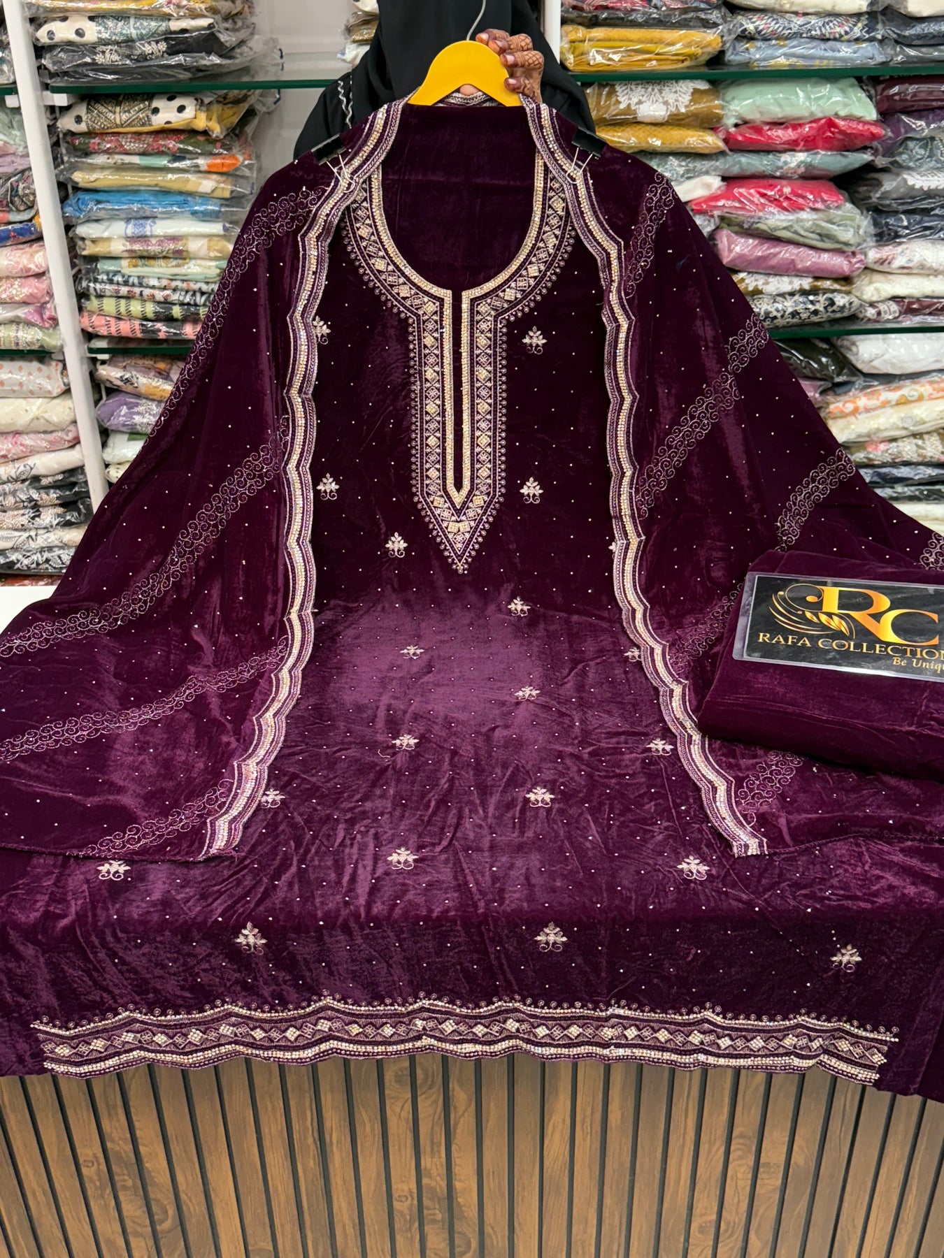 D.no:-2581.  This sophisticated velvet suit features elegant embroidery and delicate zari thread work, perfect for adding a touch of luxury to any occasion. Crafted from soft velvet, it offers comfort and style in one. Elevate your wardrobe with this expertly crafted piece.