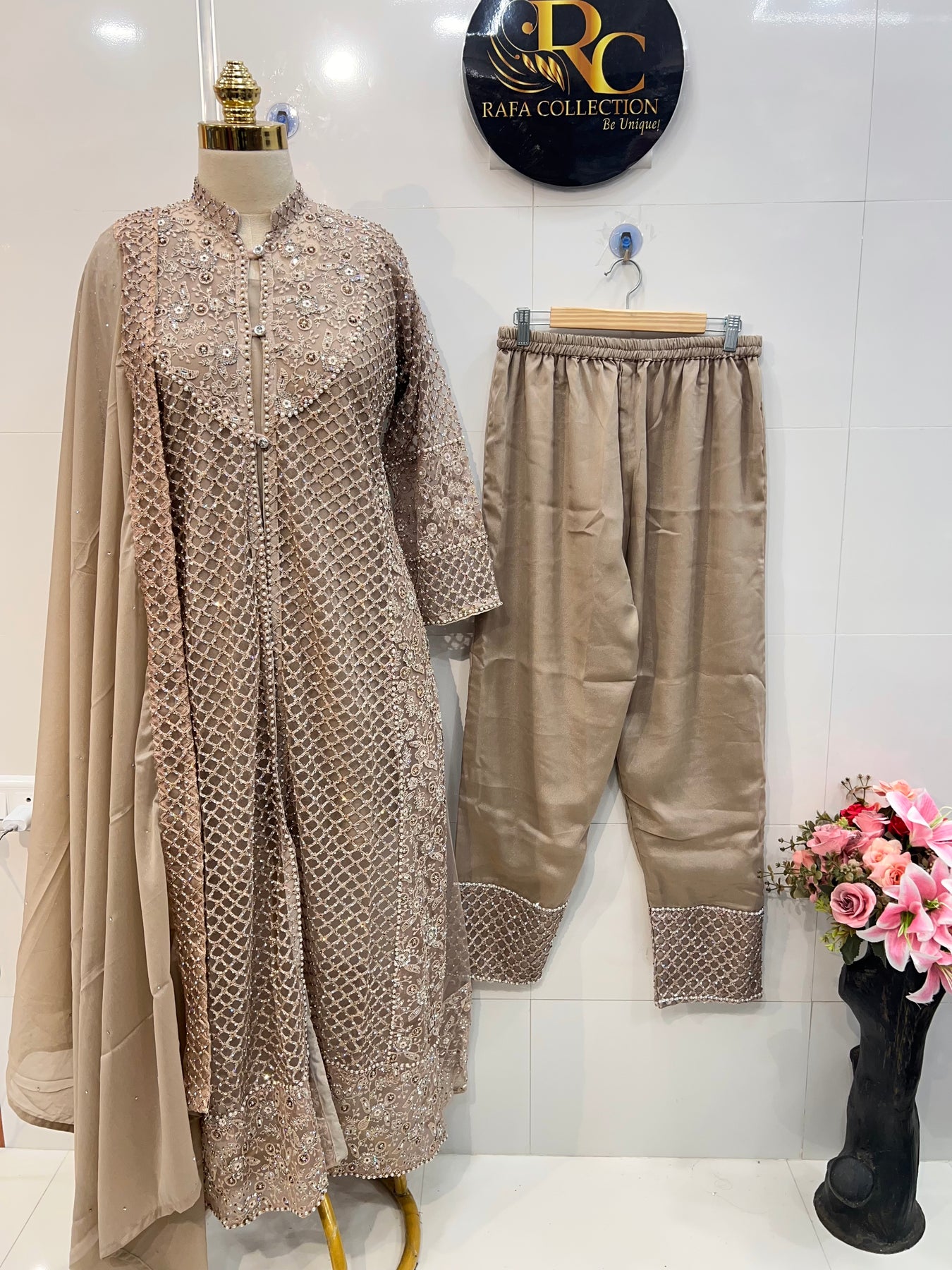 D No:-1011 This bridal suit features a stunning combination of stone and pearl work, making it a must-have for any bridal outfit. The heavy handwork adds a touch of sophistication and elegance to the gown, making it the perfect choice for any bride looking to make a statement on her special day.